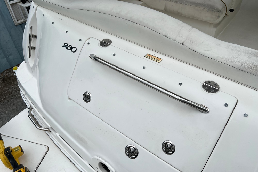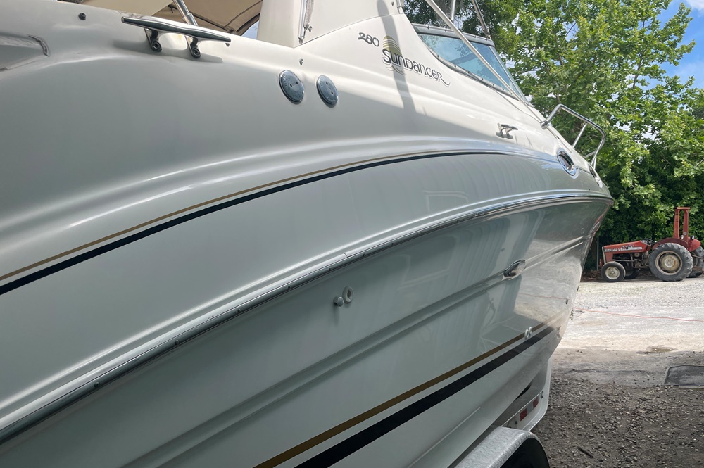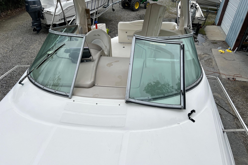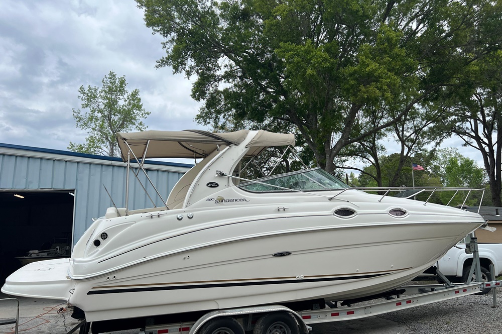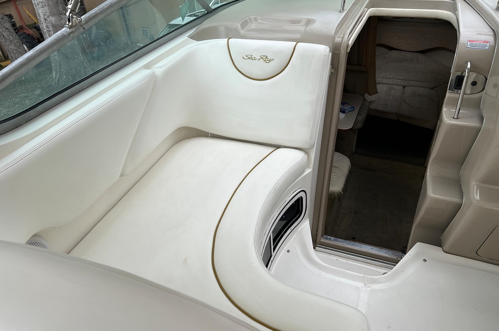 Boaters everywhere will cheer all 28 beautiful feet of the Sea Ray 280 Sundancer, from the stainless steel bow rail to the extended swim platform. The standard fiberglass sport spoiler only adds to her distinctive profile. With room to sleep six, she's just right for families who hate to leave the water when darkness falls. Standard power is a 496 Magnum Bravo III MCM stern drive.