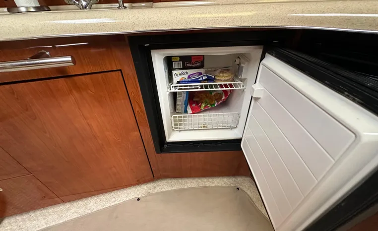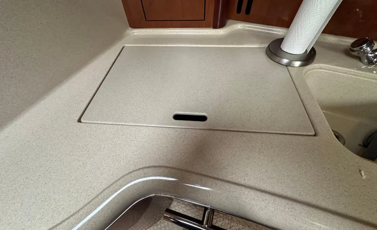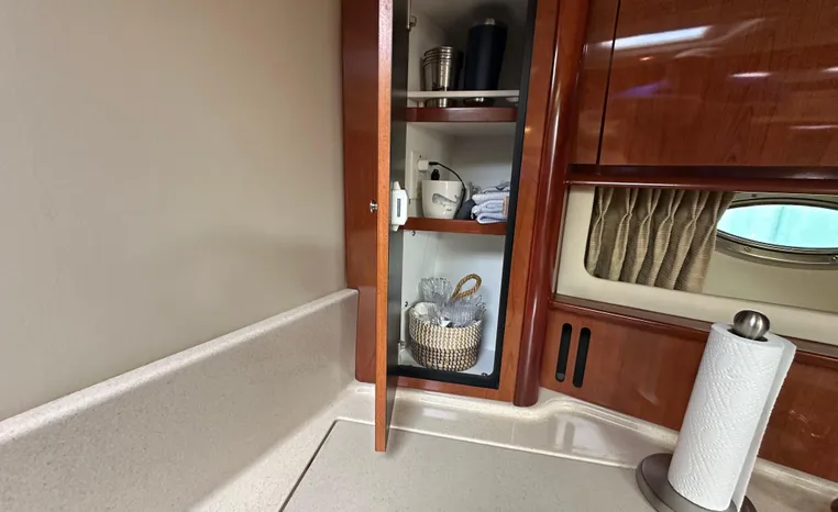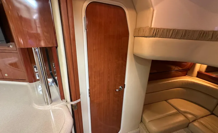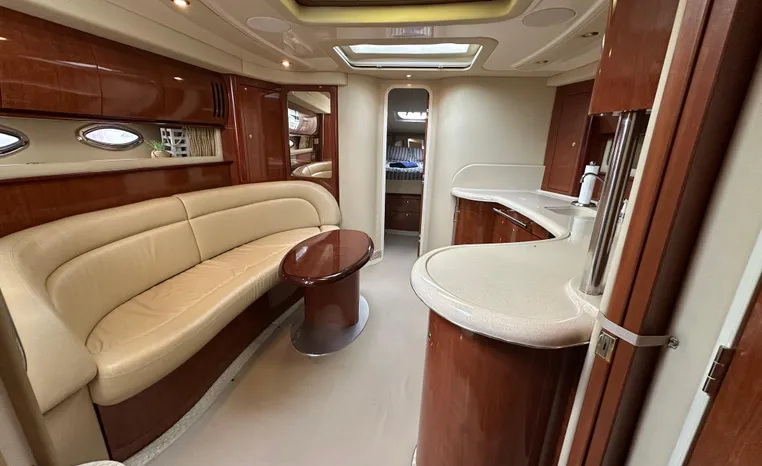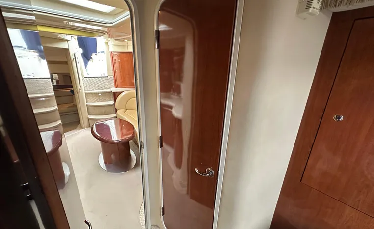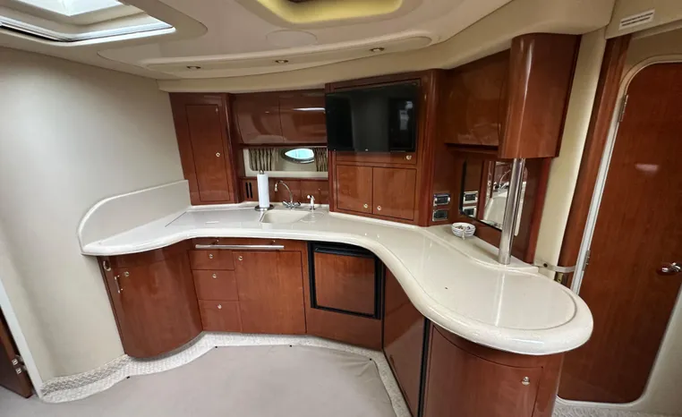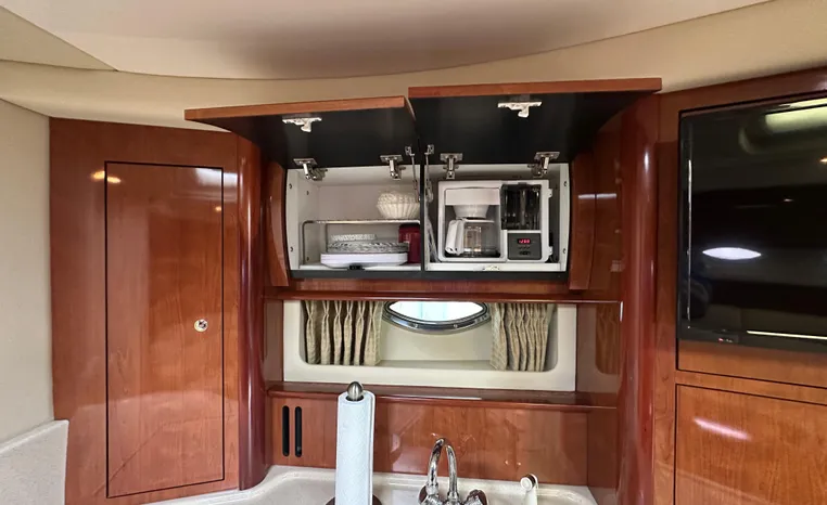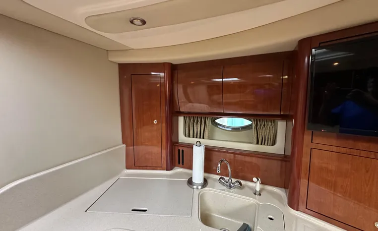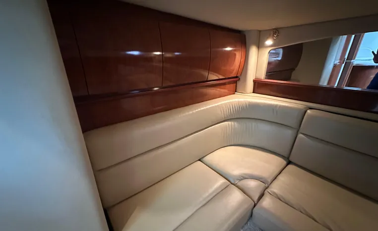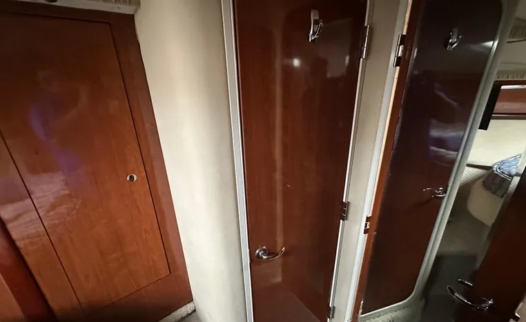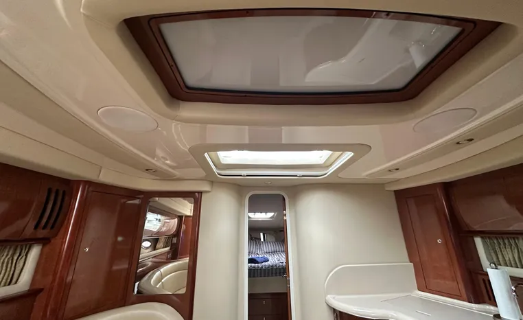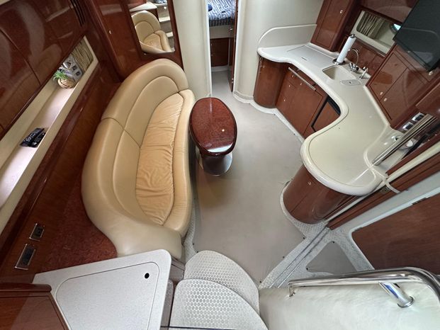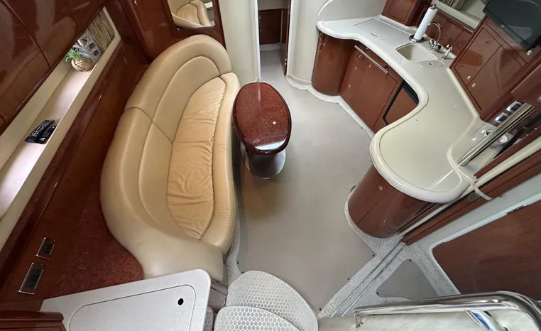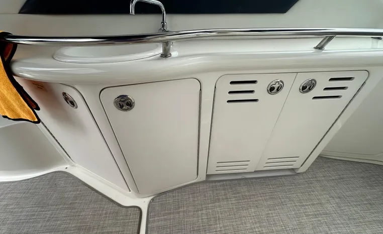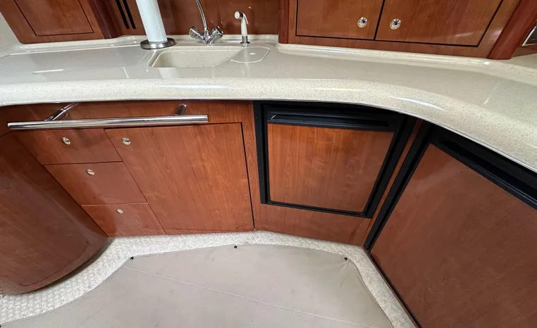 Yet another Sea Ray sales success story, the 420 Sundancer (called the 44 Sundancer in 2006–08) set the gold standard for express yacht styling and luxury during her production years. Indeed, her muscular lines compared well with the best Mediterranean sportcruisers of her era, and a large cockpit and spacious interior made many of her European counterparts seem small in comparison. Built on a deep-V hull with prop pockets and a relatively wide 14-foot beam, the luxurious two-stateroom, two-head floor-plan of the 420 Sundancer is an impressive blend of high-gloss cherry joinery, Ultra-leather seating, and designer fabrics. Privacy doors (not curtains) separate both staterooms from the salon, and the Sundancer’s full-service galley includes an under-counter refrigerator/freezer in addition to Corian counters and hardwood flooring. Topside, a flip-up bolster seat is standard at the helm, and the entire cockpit sole can be raised at the push of a button for engine access. Note the extended swim platform, split forward head, and underwater exhaust system.