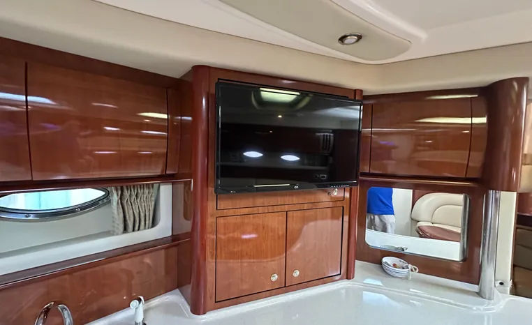 This vessel features Twin Cummins 6CTA 8.3 450-hp Diesel Engine's with approx. 1180 hours. Notable features include but are not limited to the following: Air-Conditioning & Heat (2-Units), (2) Head's (Vacuflush) w/Vanity/Sink/Shower (Note Stall-Shower Forward), Central Vacuum System, Windlass Anchor (w/Freshwater Washdown), Onan Generator, Electronics Package includes Garmin VHF Marine Radio, Dual Garmin 5212 w/GPS/Chartplotter, and Radar, Cockpit Wet Bar w/Sink/Refrigerator, Premium Fusion Sound System w/ JL Audio Speakers and Subwoofer, Above Windshield Isin Glass with Slant back Canvas, Removable Seagrass Cockpit Carpeting, and MUCH more!
