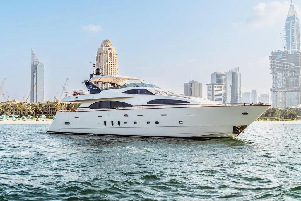 Modified V-hull · LOA 98’ · Beam 22’ · Draft 6’ · Deadrise 16° · Dry weight 220,000 lb · Cruise ~12 mph (≈600 mi range) / Max ~16 mph · Fuel 3,646 gal · Fresh water 528 gal · 4 guest cabins · 8 heads · 2 crew cabins · Stefano Righini design · teak side decks & bathing platform · fin stabilizers · bow & stern thrusters · air-conditioning · fresh-water maker · deep freezer · refrigerator · oven · microwave · dishwasher · washing machine · electric windlass · cockpit table & cushions · bimini top & hardtop · generators · inverter · shore-power inlet