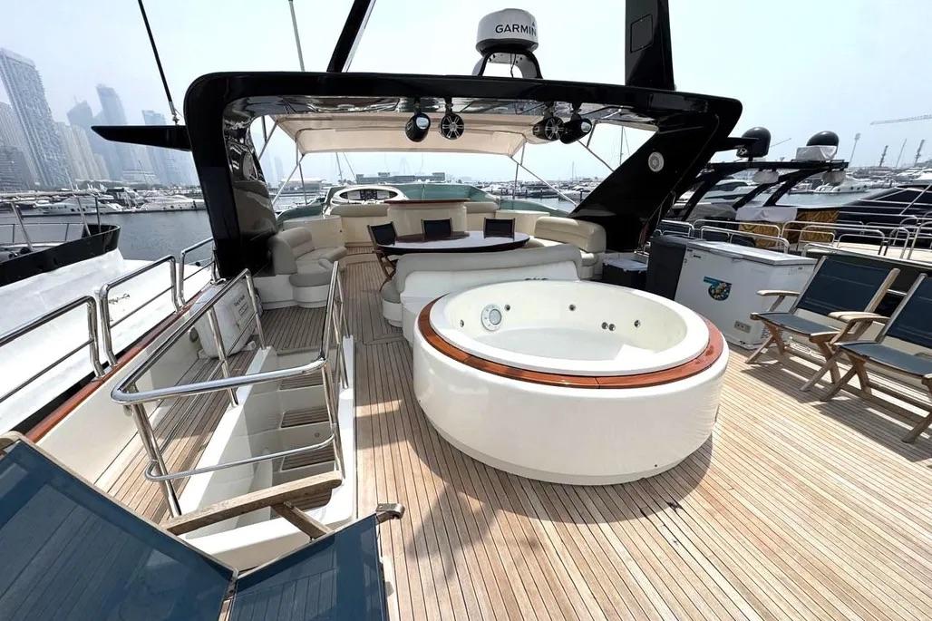 Deck life centers on versatility: teak sidedecks lead from the cockpit lounge under bimini shade to a flybridge Jacuzzi and dedicated pool area. A crane and garage handle your tender and jet skis, while beaching legs let you settle on shallow shoals.