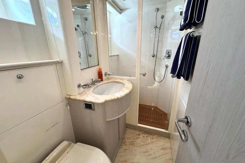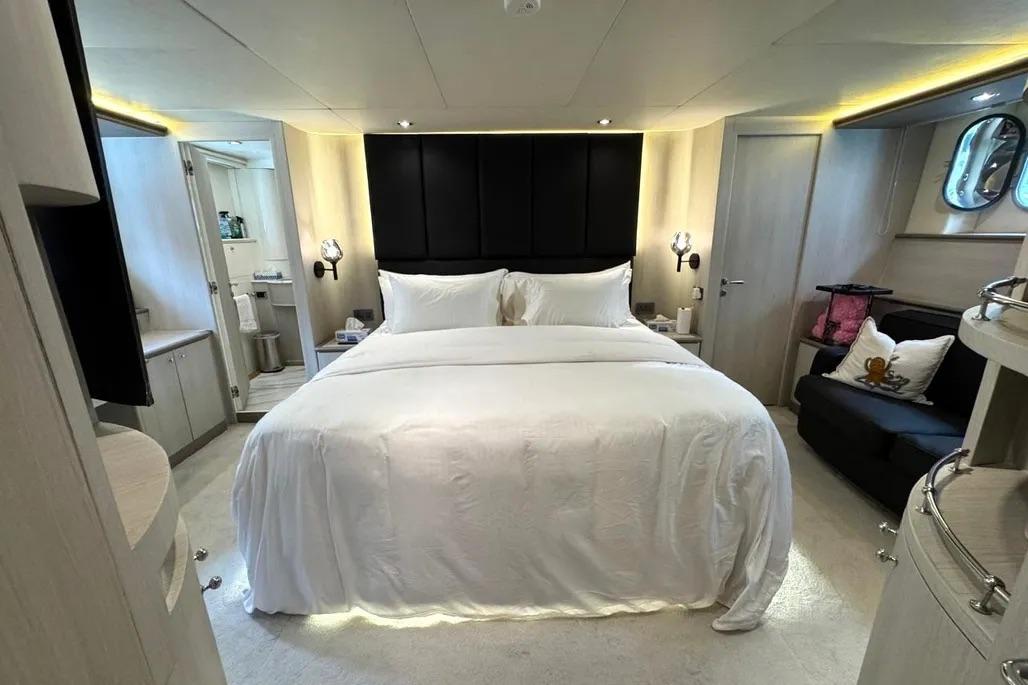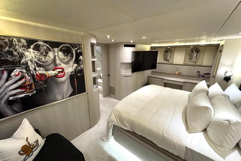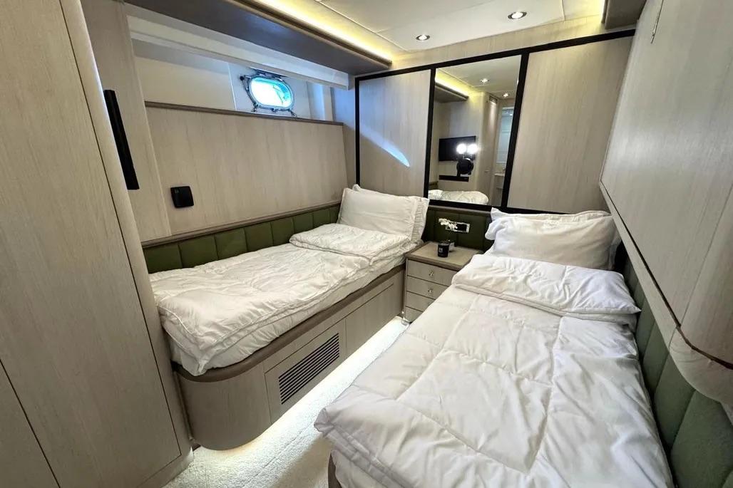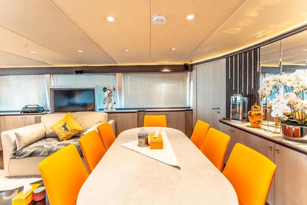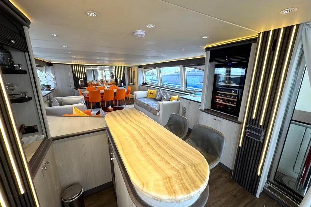 Inside, Stefano Righini’s layout balances convivial spaces with private retreats. The saloon converts to a cinema, the office offers a quiet work zone, and a climate-controlled wine cellar preserves your collection. Four guest cabins and eight heads ensure comfort, while two crew cabins keep service seamless.