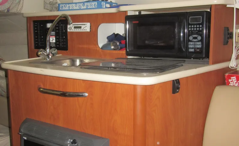 GALLEY INCLUDES SINK, FRIDGE, MICROWAVE AND HOTPLATE