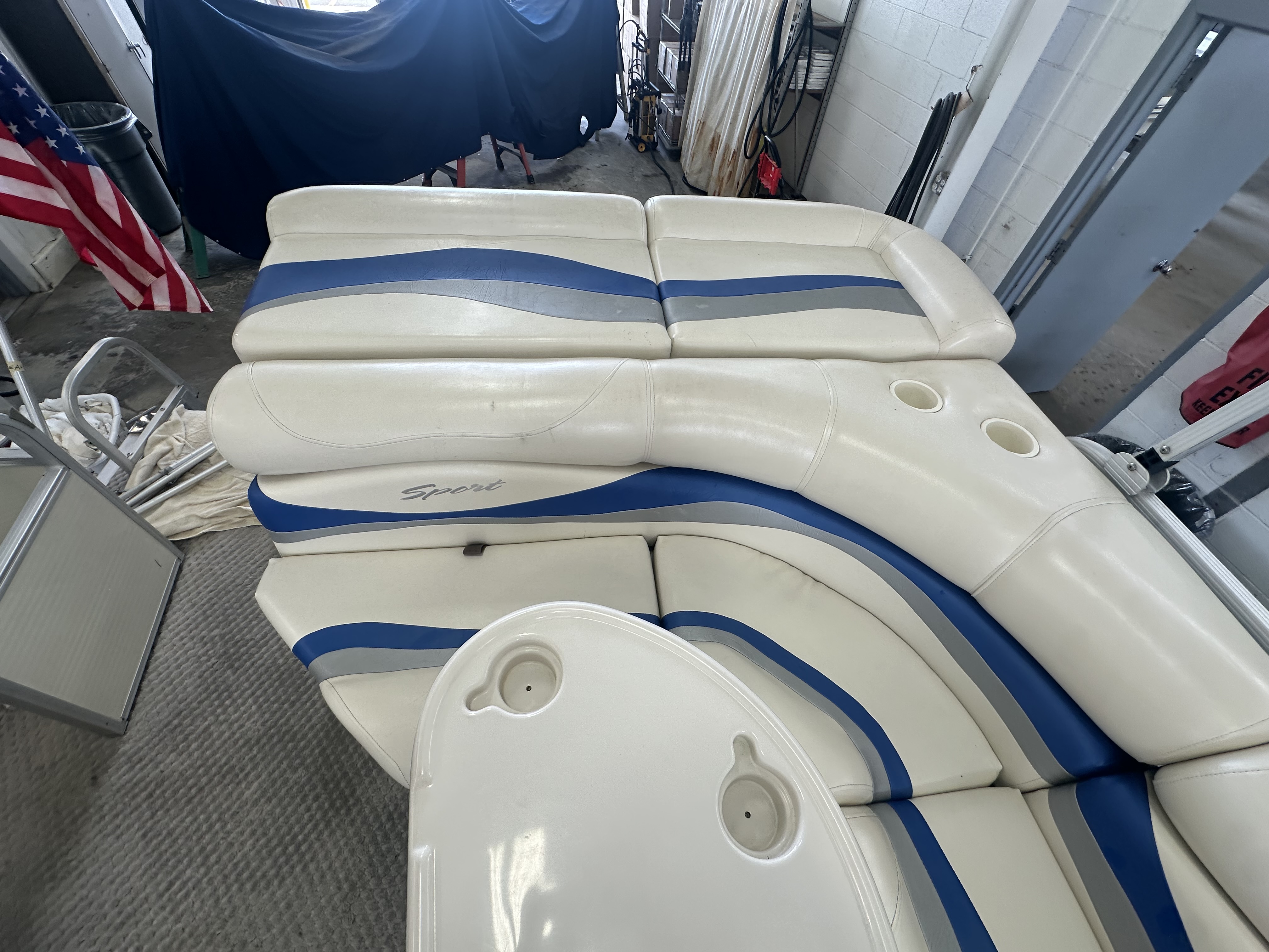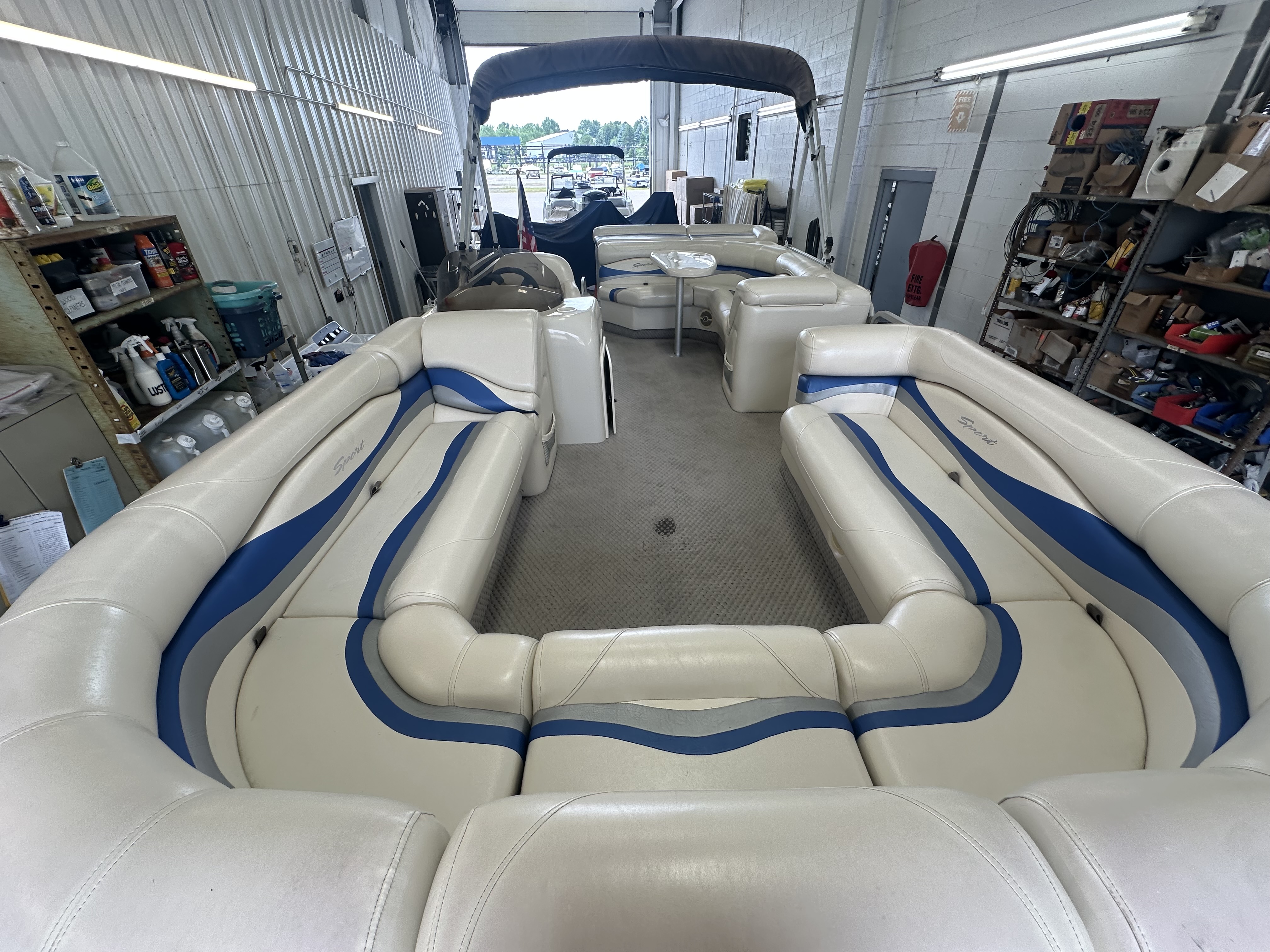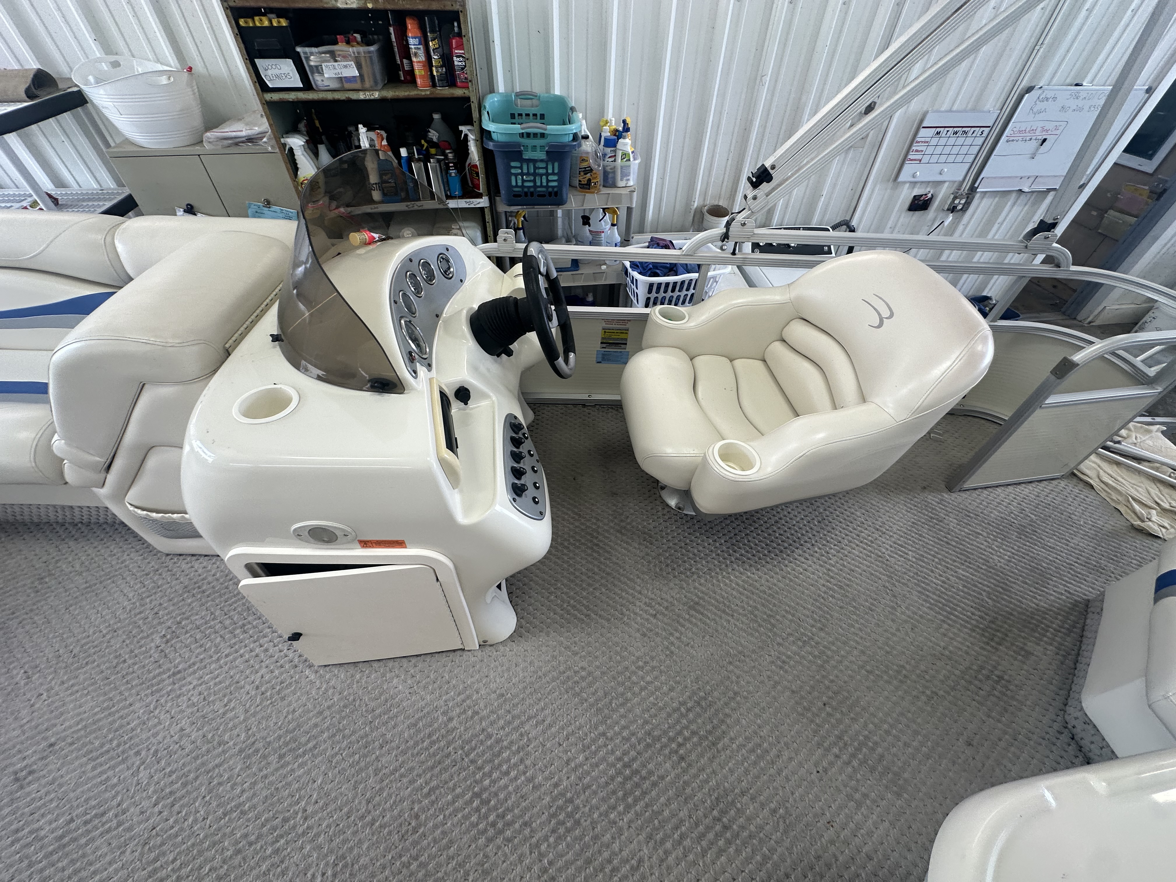 Boat also comes with full boat cover, bimini top, rear swim ladder, front docking lights, rubrail, movable bow gate seat for extra seating, removable boat table, stereo with speakers, American flag, power trim for the engine and much more!