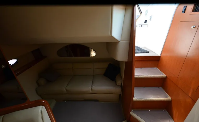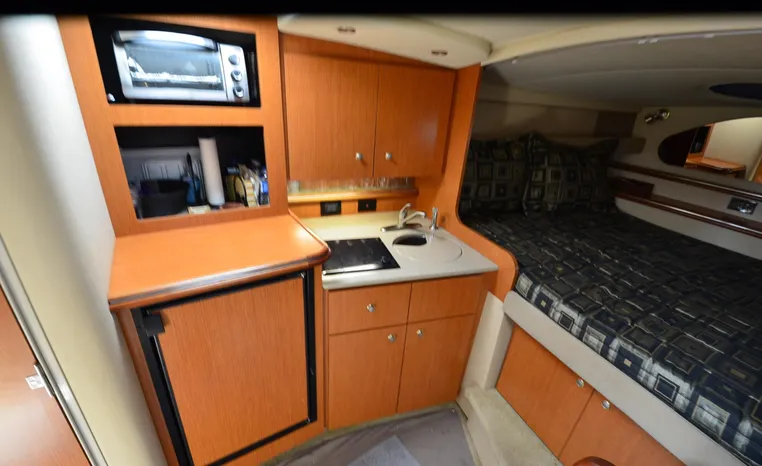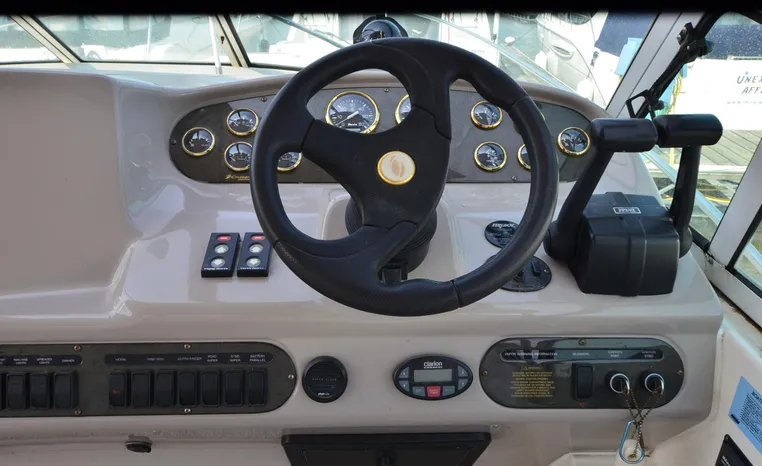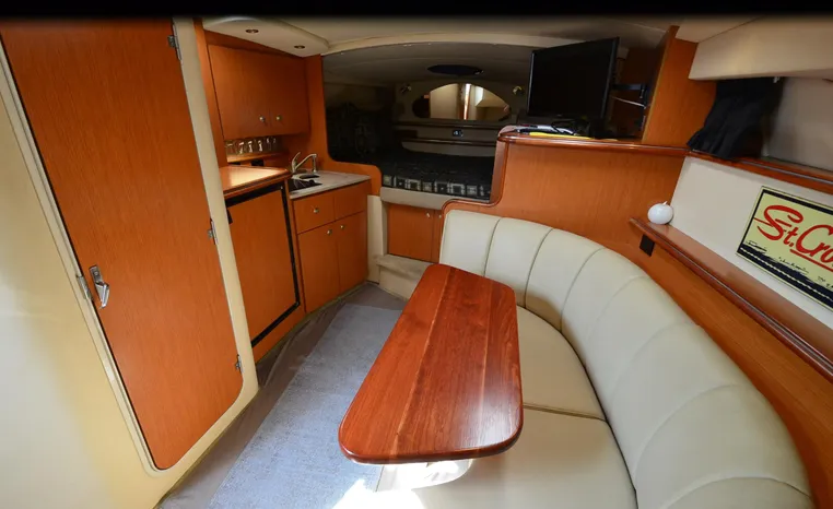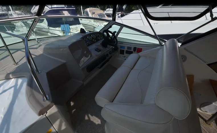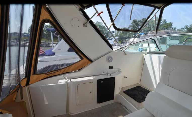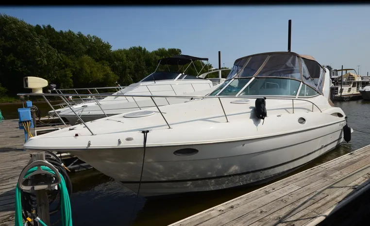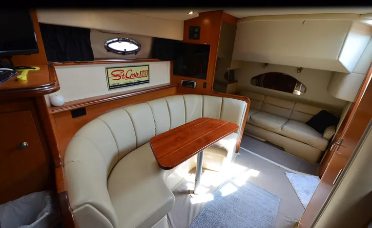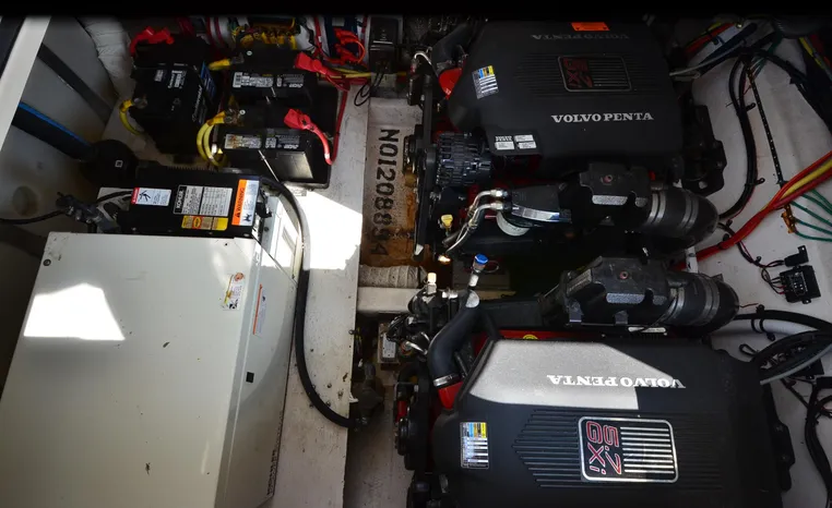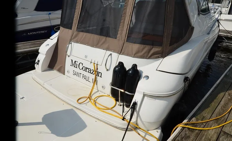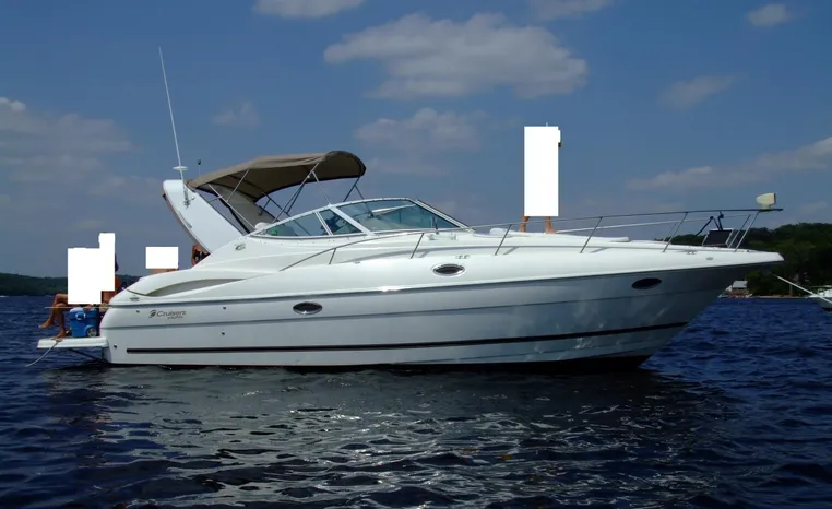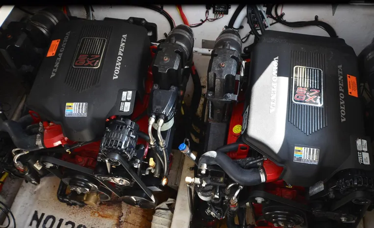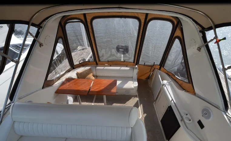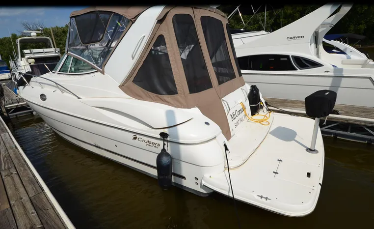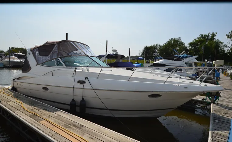 2004 Cruisers 320 Express, twin Volvo Penta 5.7 L. GXI-F, 320 hp, 395 approx hours, Volvo duo prop, Kohler 5.0kw generator with sound shield, 213 approx hours, dual 30 amp/125vac electrical service, two 50' shore power cords, three batteries, Fireboy auto halon system, CruiseAir reverse cycle air/heat, pressure water, water heater, Vacu-Flush head/shower/vanity, master stateroom forward with offset double berth, guest stateroom mid-cabin with double berth, convertible dinette sleeps two, beige carpet, beige colored vinyl wall covering, beige upholstery, cherry interior, hatch screens, Kenwood AM/FM/stereo CD player, single stainless sink, Tundra 12vdc/115vac refrigerator/freezer, Princess single burner electric stove (not working), toaster oven, light brown canvas, bimini top with enclosure, VHF marine radio, Faria digital depth finder, compass, remote spotlight, electric windlass, four fenders, mooring lines, windshield wiper, fiberglass arch, cockpit table, cockpit wet bar with Tundra refrigerator, transom shower, transom door, trim tabs, integral swim platform with extension, boarding ladder.