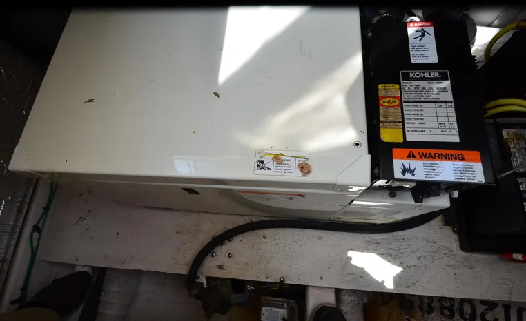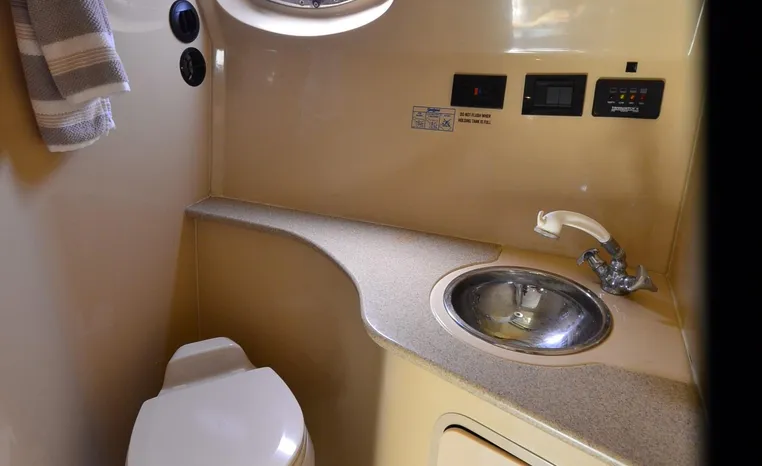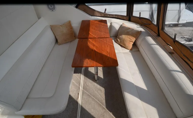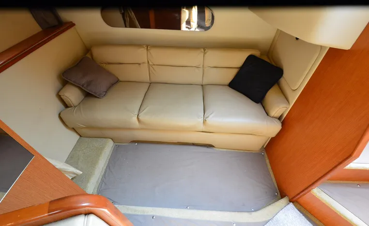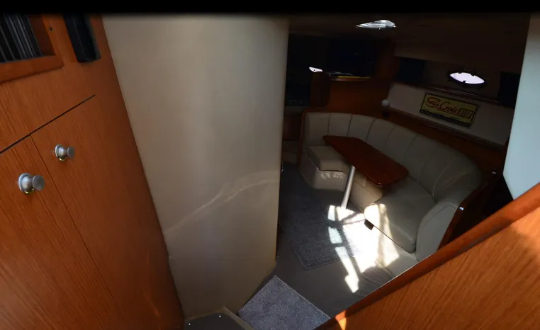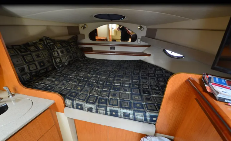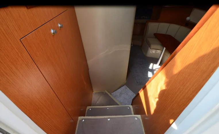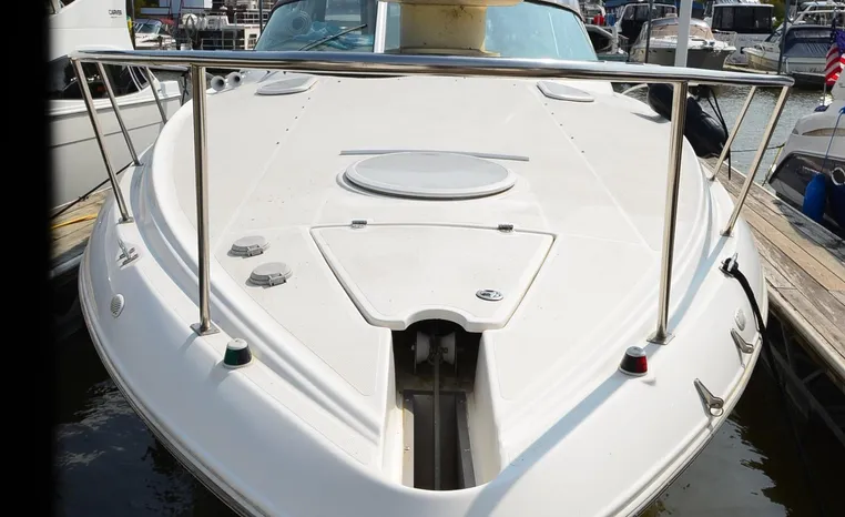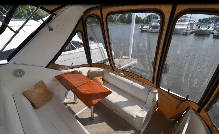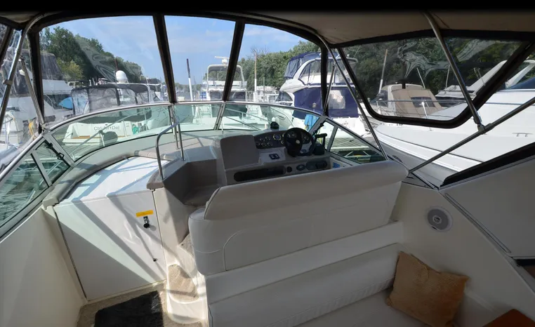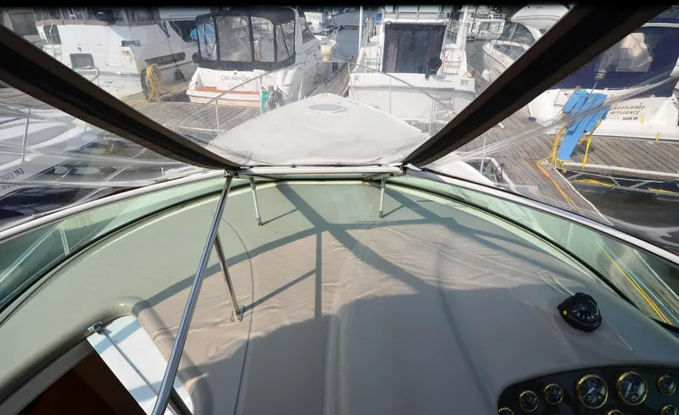 2004 Cruisers 320 Express, twin Volvo Penta 5.7 L. GXI-F, 320 hp, 395 approx hours, Volvo duo prop, Kohler 5.0kw generator with sound shield, 213 approx hours, dual 30 amp/125vac electrical service, two 50' shore power cords, three batteries, Fireboy auto halon system, CruiseAir reverse cycle air/heat, pressure water, water heater, Vacu-Flush head/shower/vanity, master stateroom forward with offset double berth, guest stateroom mid-cabin with double berth, convertible dinette sleeps two, beige carpet, beige colored vinyl wall covering, beige upholstery, cherry interior, hatch screens, Kenwood AM/FM/stereo CD player, single stainless sink, Tundra 12vdc/115vac refrigerator/freezer, Princess single burner electric stove (not working), toaster oven, light brown canvas, bimini top with enclosure, VHF marine radio, Faria digital depth finder, compass, remote spotlight, electric windlass, four fenders, mooring lines, windshield wiper, fiberglass arch, cockpit table, cockpit wet bar with Tundra refrigerator, transom shower, transom door, trim tabs, integral swim platform with extension, boarding ladder.