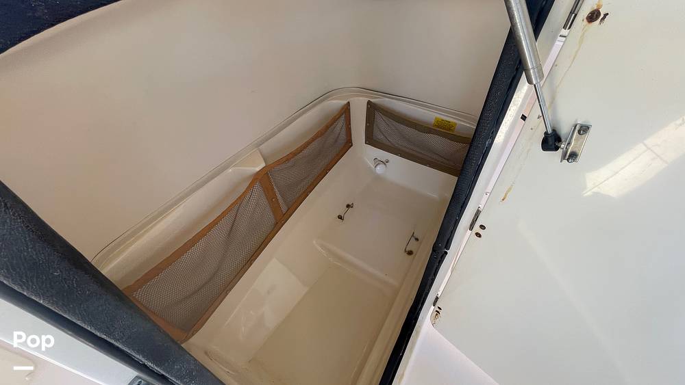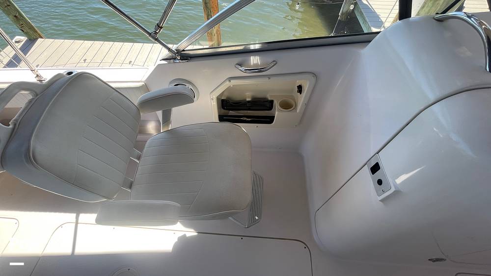 The boat comes equipped with full forward and side curtain isinglass for added protection from spray and wind. Fishing features include a large 175-quart insulated transom fish box with overboard drain, a 52-quart insulated cooler / fish box in the starboard bow with overboard drain, horizontal rod racks that hold 6 rods, four gunwale-mounted rod holders, and lockable tackle drawers plus storage in both consoles.