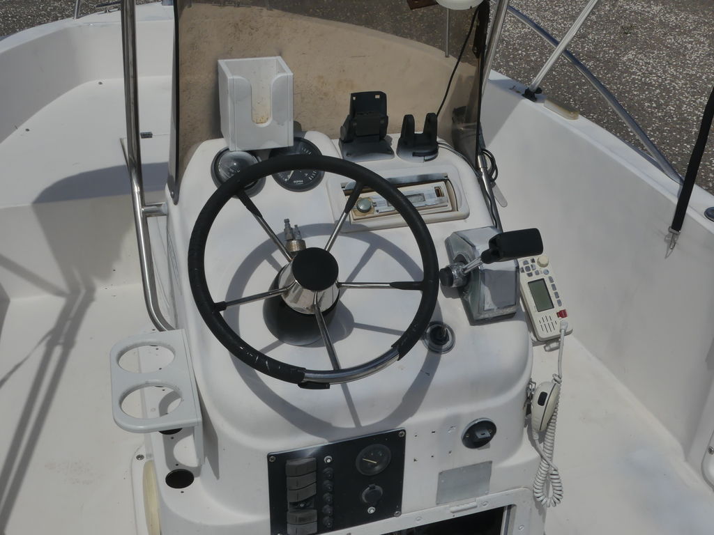 The boat comes equipped with all the essential features you need for a day out. It includes a livewell to keep your catch fresh, ample storage compartments for gear, and a comfortable seating arrangement that includes a forward cooler seat and a cushioned console seat. The T-top provides welcome shade on sunny days, and the console features a well-organized dash with easy-to-read gauges.