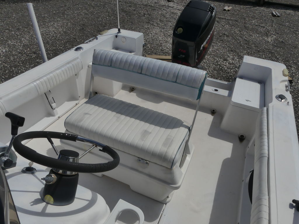 The boat comes equipped with all the essential features you need for a day out. It includes a livewell to keep your catch fresh, ample storage compartments for gear, and a comfortable seating arrangement that includes a forward cooler seat and a cushioned console seat. The T-top provides welcome shade on sunny days, and the console features a well-organized dash with easy-to-read gauges.