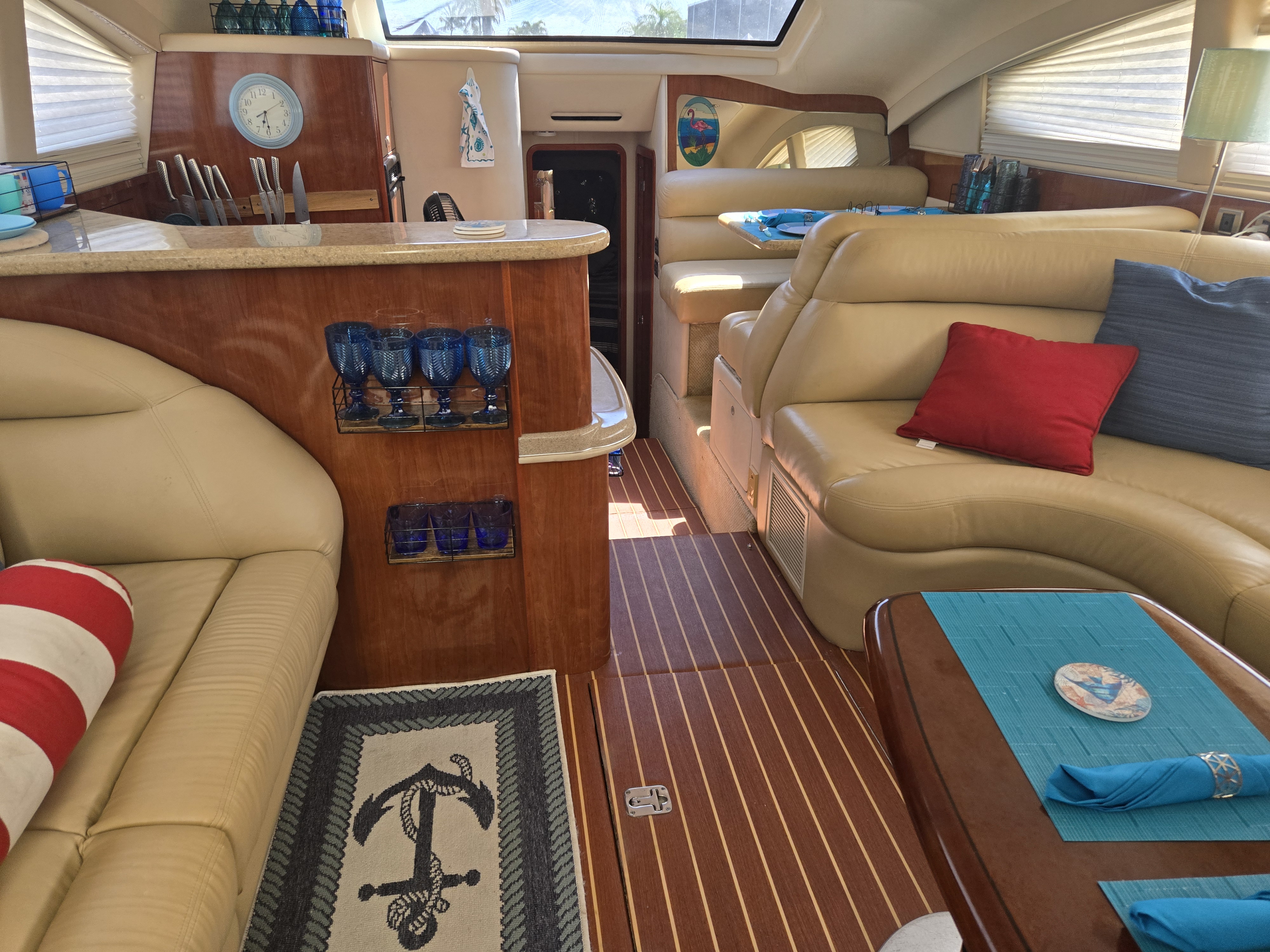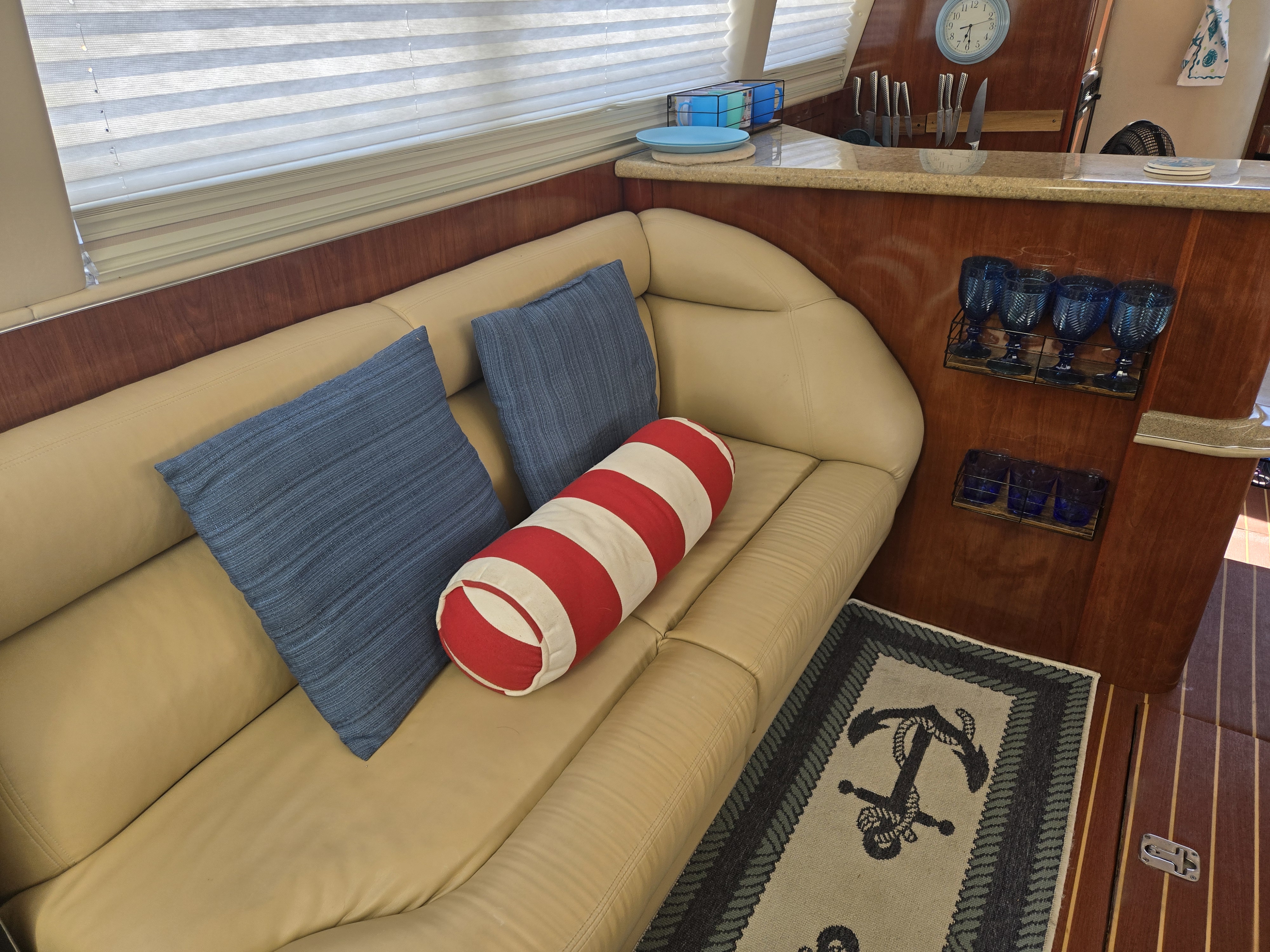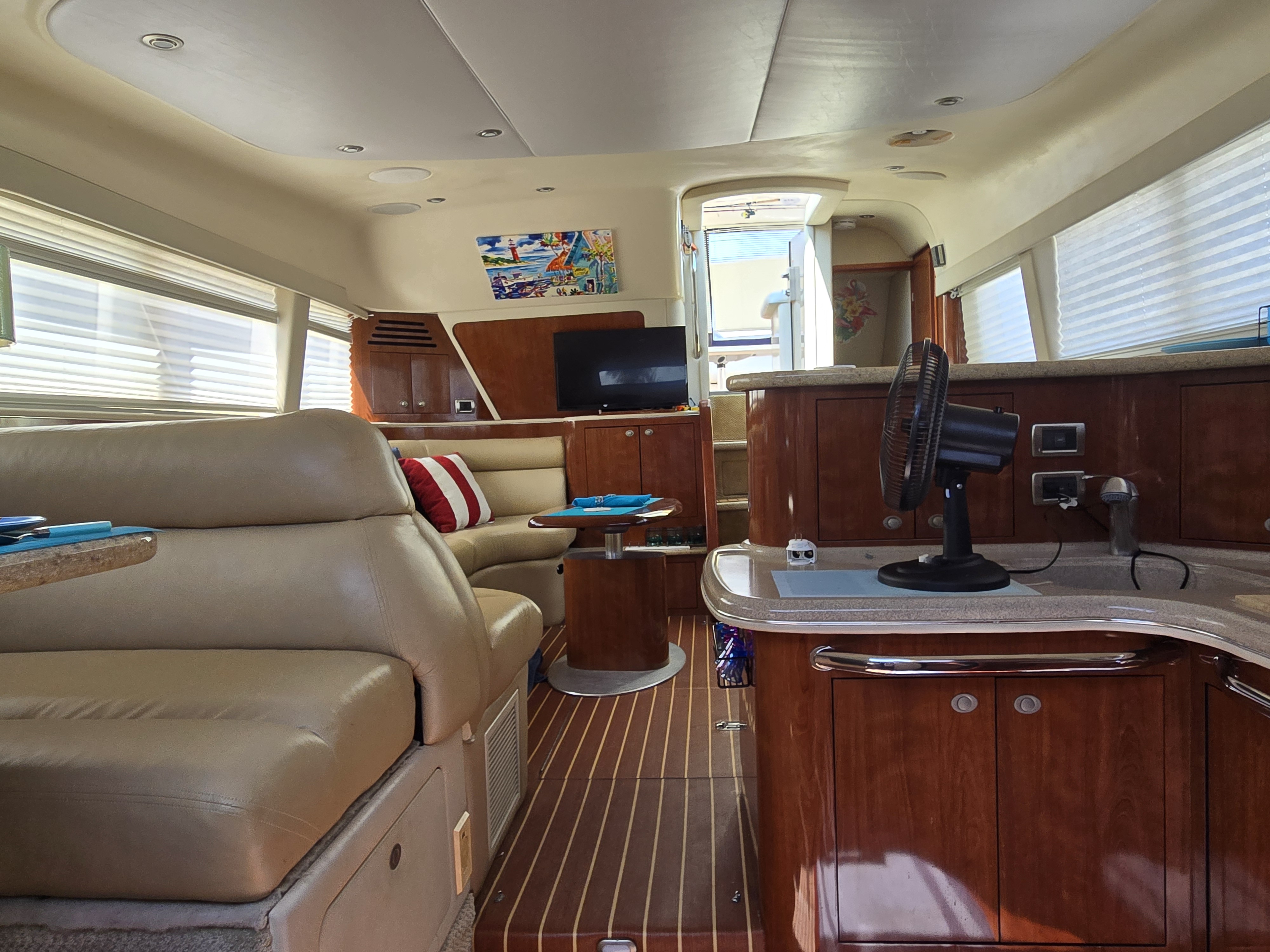 Step inside the Sea Ray 480 Sedan Bridge salon, and you're welcomed into a warm, open-concept living space that feels more like a luxury condo than a yacht. Surrounded by rich, high-gloss cherry wood cabinetry, ultra-soft leather seating, and abundant natural light from the oversized salon windows, the interior strikes the perfect balance between classic Sea Ray elegance and modern functionality.