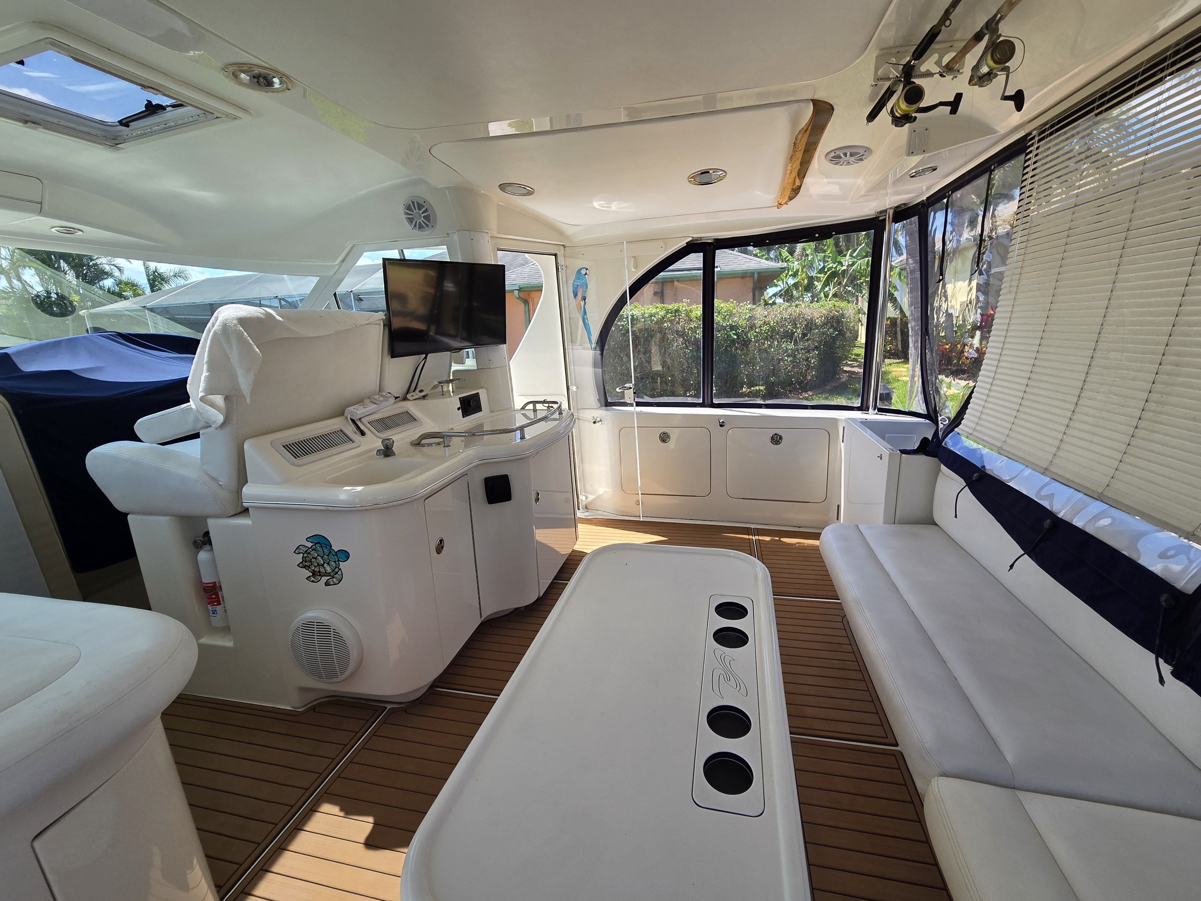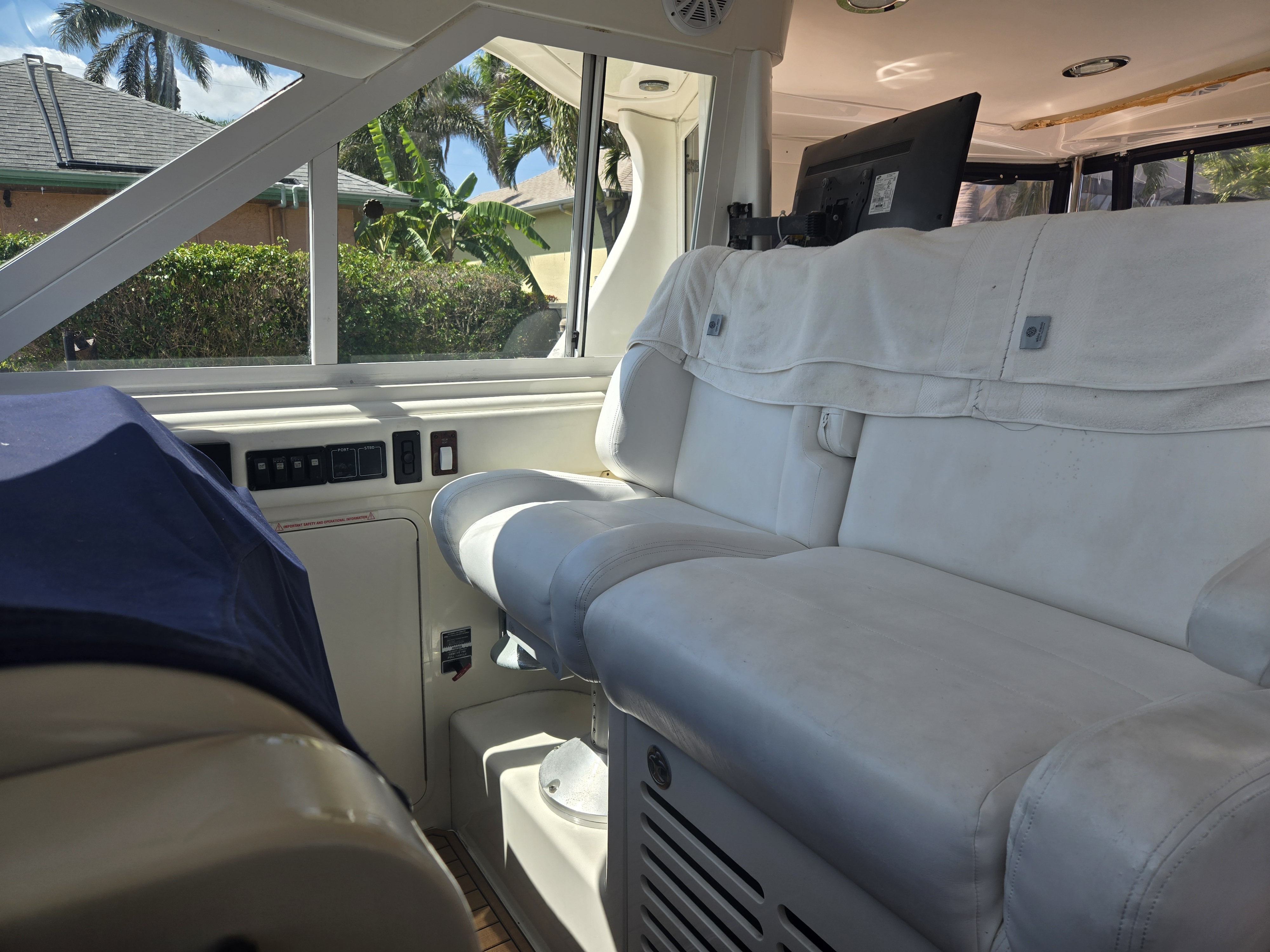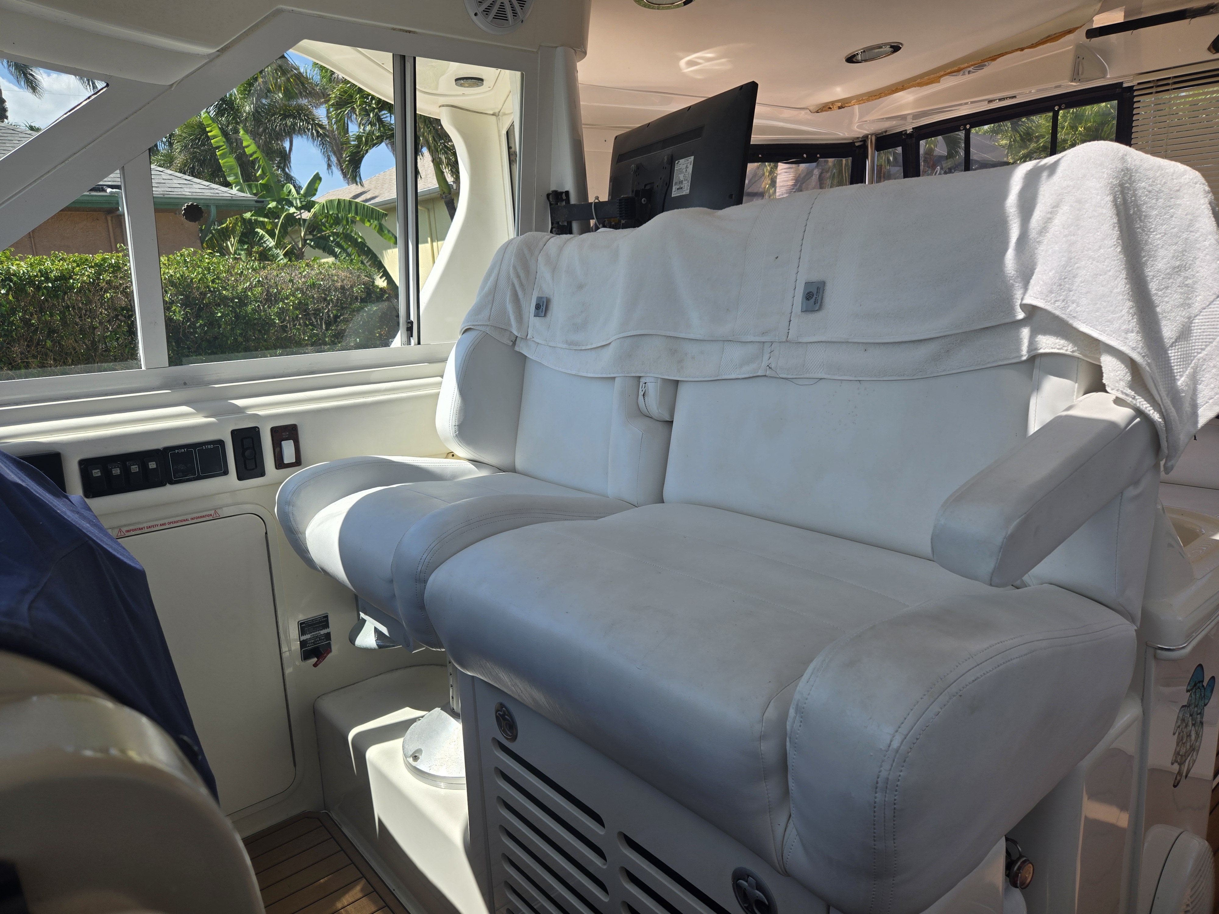 The flybridge is both a captain's dream and an entertainer's lounge. Fully enclosed with newer canvas and Isinglass, it is climate-controlled for year-round comfort.
