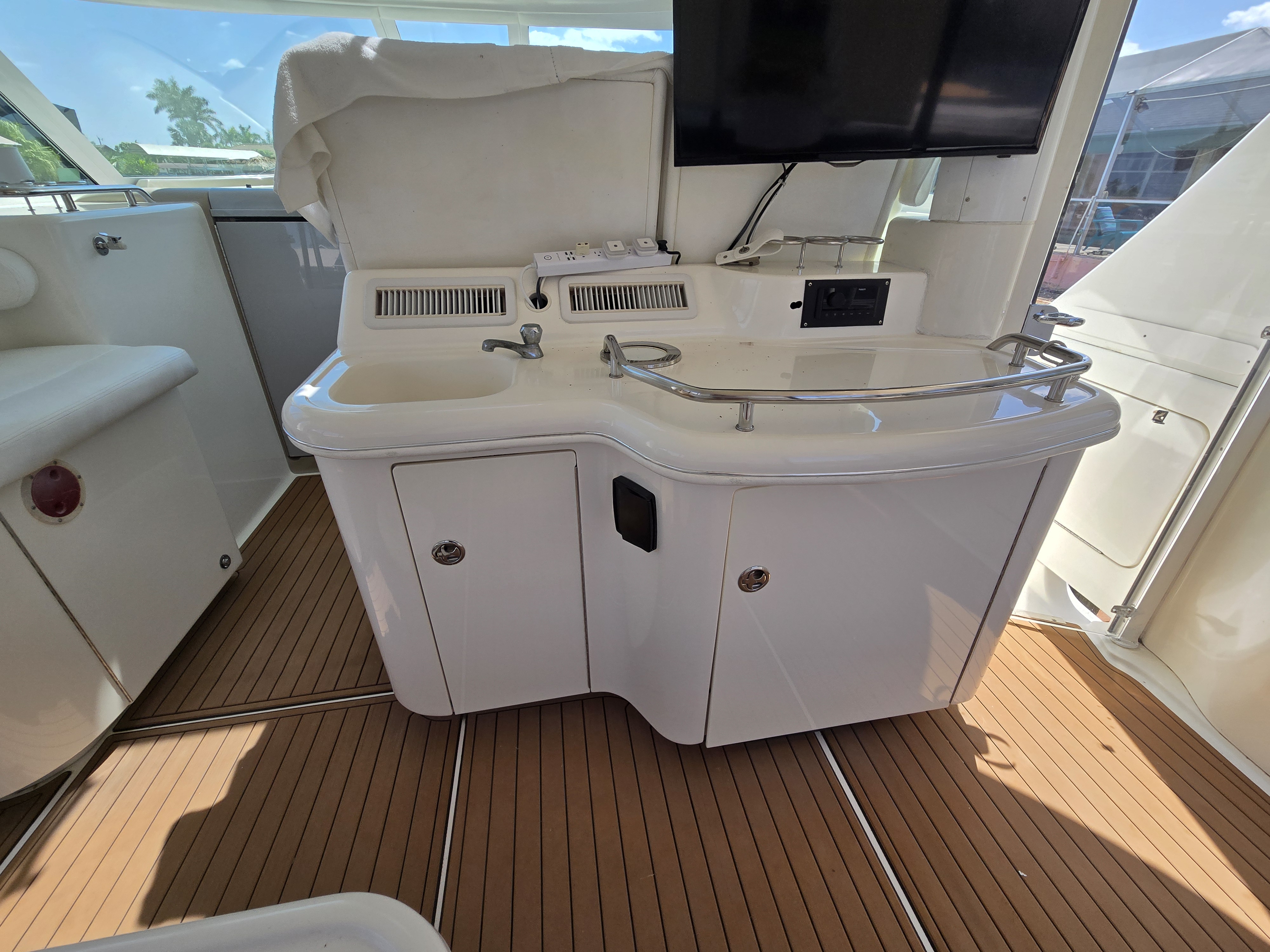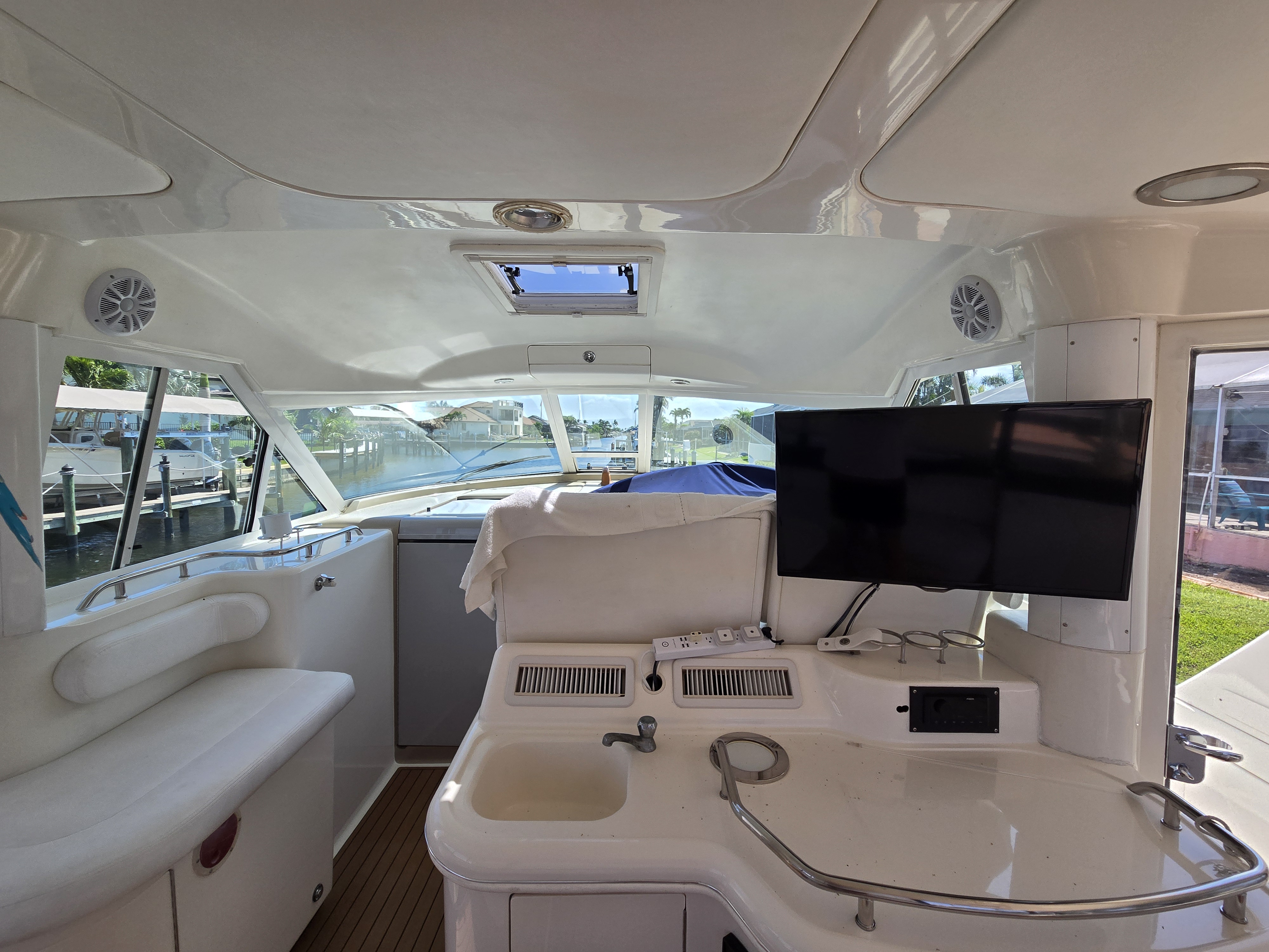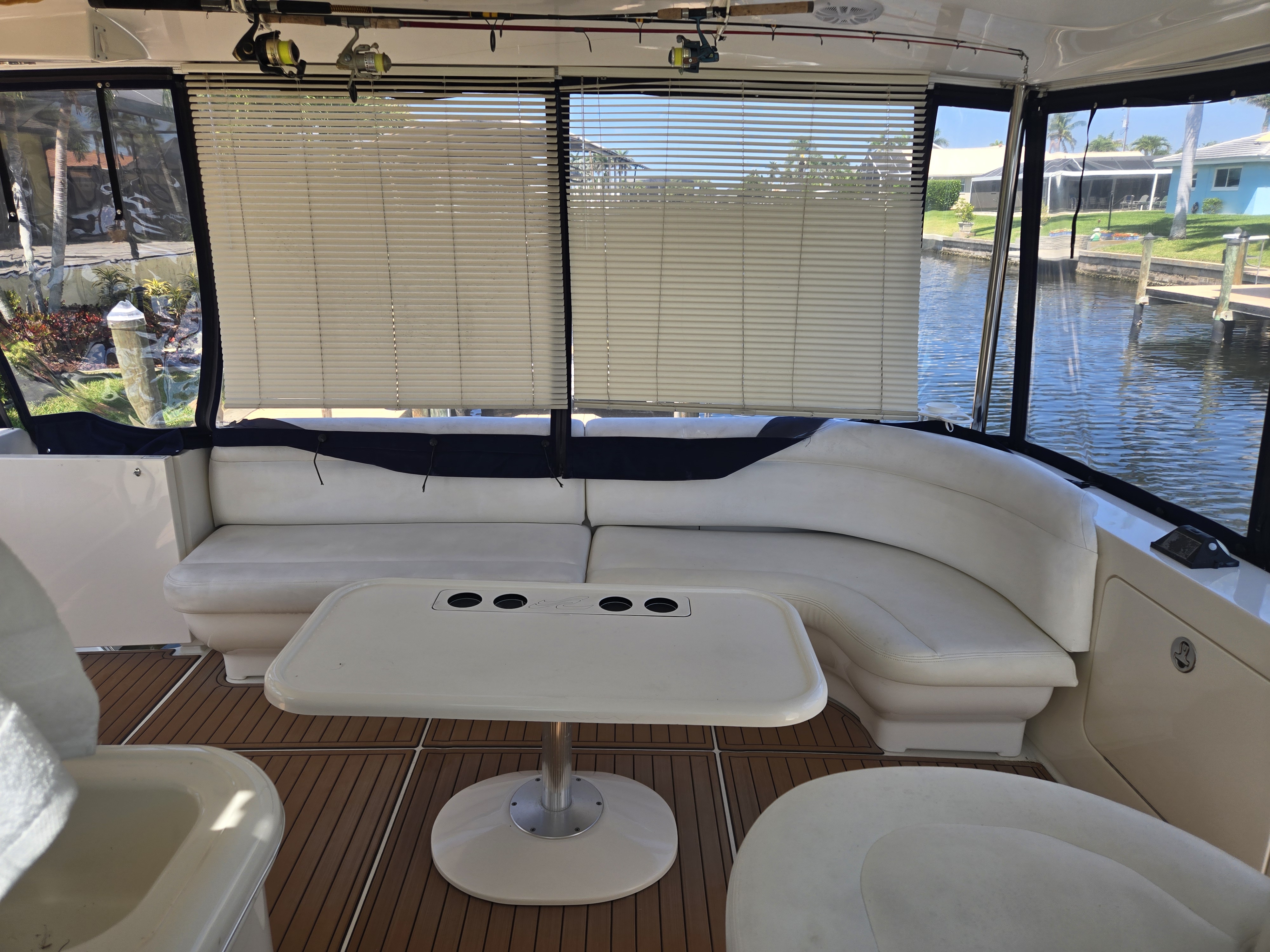 The flybridge is both a captain's dream and an entertainer's lounge. Fully enclosed with newer canvas and Isinglass, it is climate-controlled for year-round comfort.