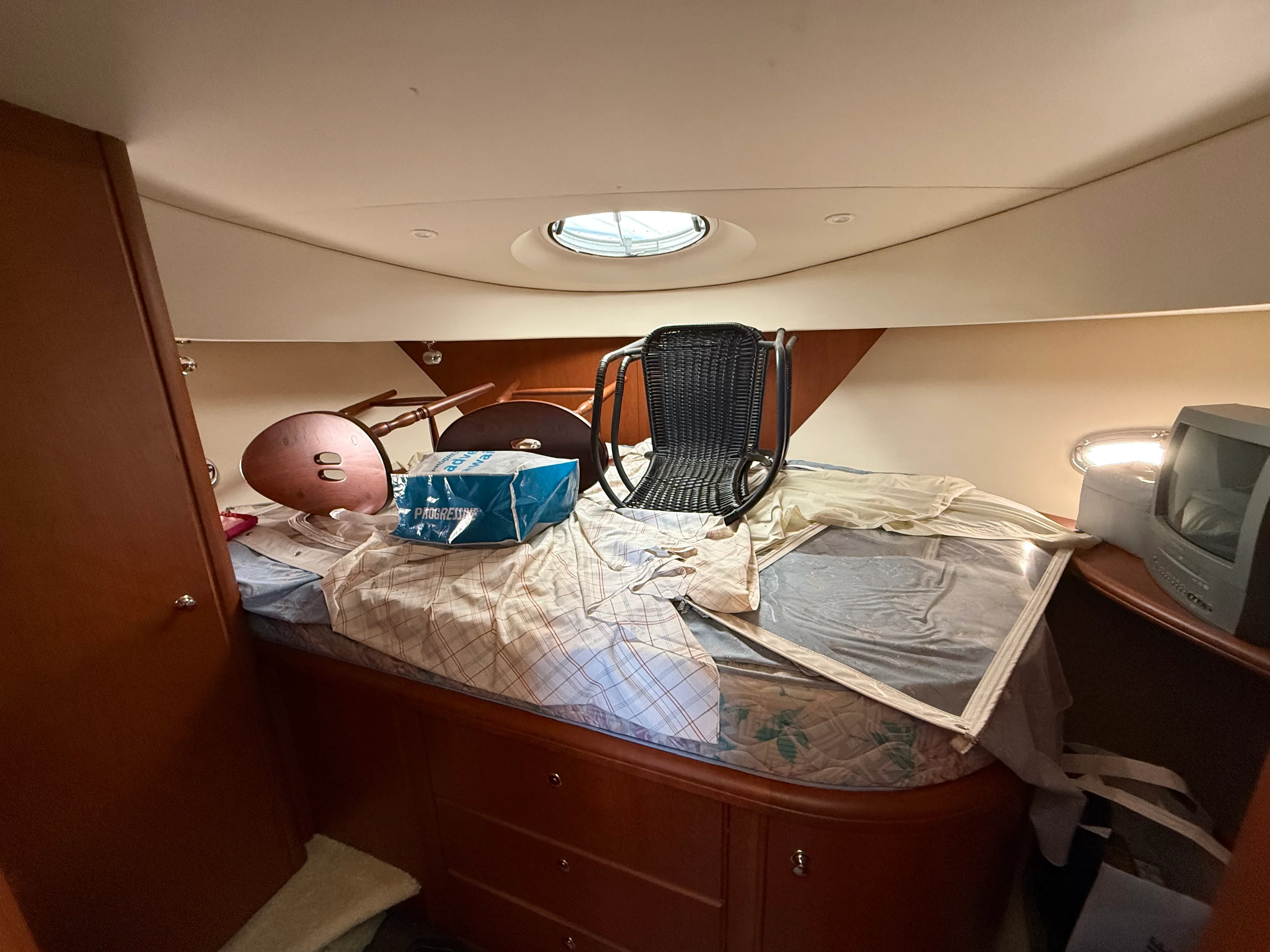 along the port bulkhead, and the forward stateroom also has queen