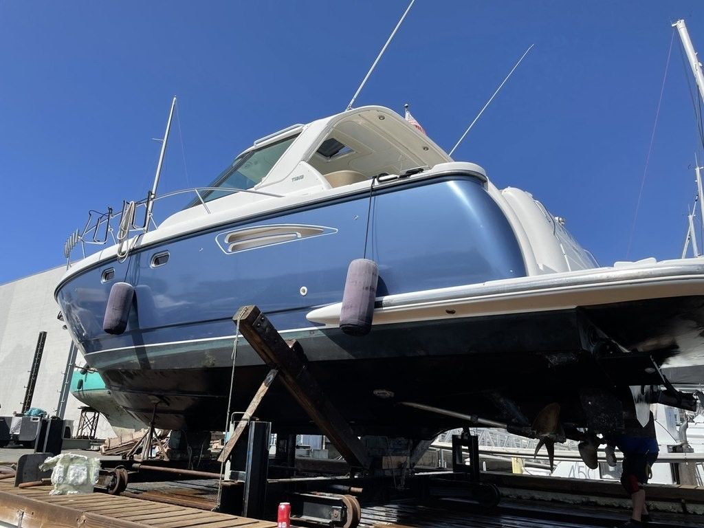 Exterior: Swim platform with tender cradle, foredeck sunpads, rod holders, cup holders, fresh bottom paint, stylish exterior wrap.