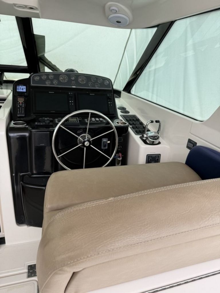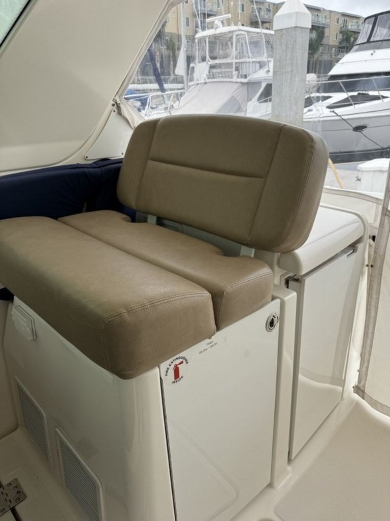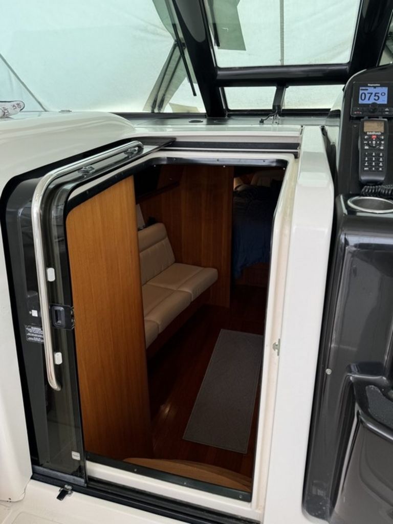 Cockpit and Helm: Full Isinglass enclosure and Sunbrella bimini (new Oct 2017), NovaKool refrigerator/freezer, sink and wet bar, L-shaped seating with stowable table, hydraulic transom trunk for storage.