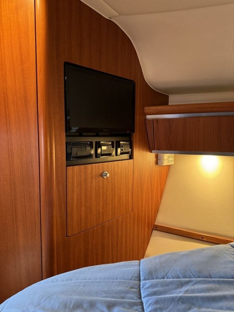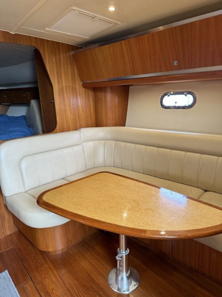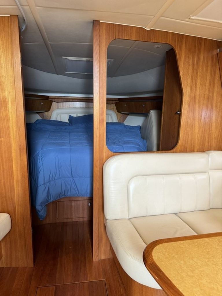 Teak and holly sole, convertible portside settee (sleeps 2), hi-low dinette table (converts to bed), 6ft-6in headroom, HD Flatscreen TV and Samsung 5.1 surround sound system (installed June 2017).