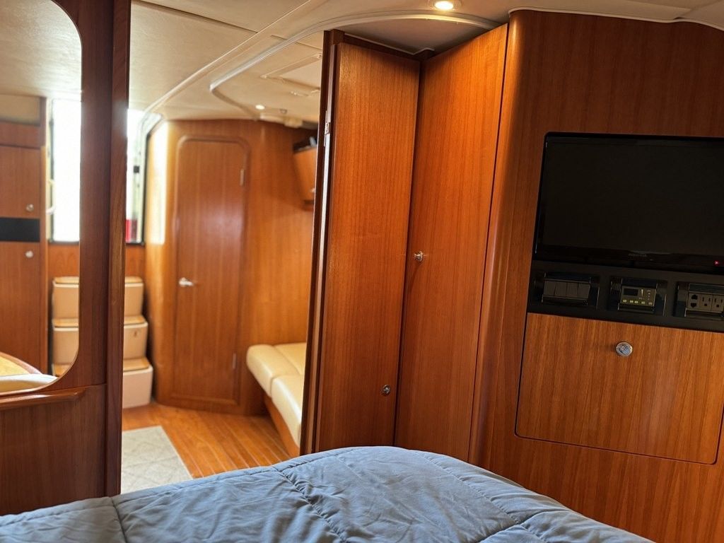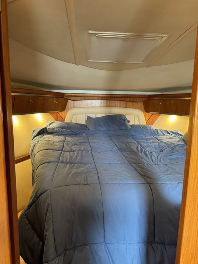 Walk-around queen bed with under-bed storage, hanging lockers (port and starboard), overhead hatch with screen and blackout cover, HD TV with Blu-ray DVD player, air conditioning and heat.