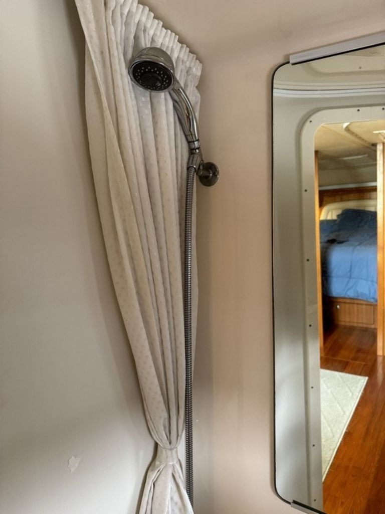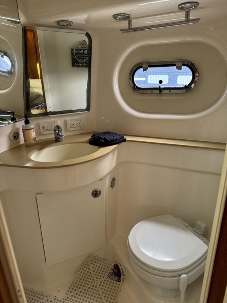 VacuFlush toilet, enclosed shower. This luxury cruiser offers refreshed upholstery and bow-to-stern care with monthly maintenance.