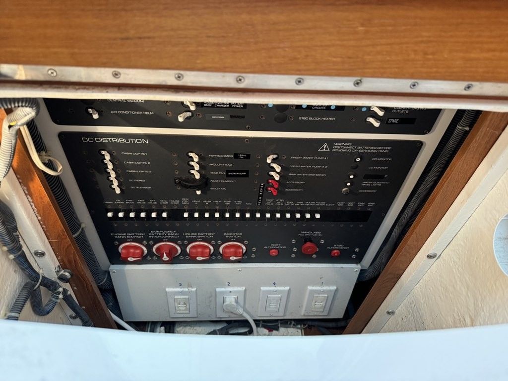 Kohler 8Kw Generator, Freedom 20 Inverter w/100 Amp Charger, Fireboy suppression system (certified), hydraulic steering, electric engine hatch, Racor fuel filters, Reverso oil change pump.