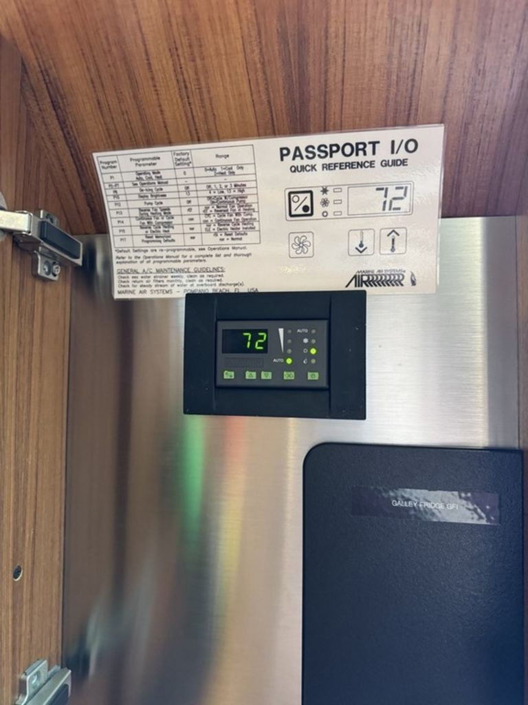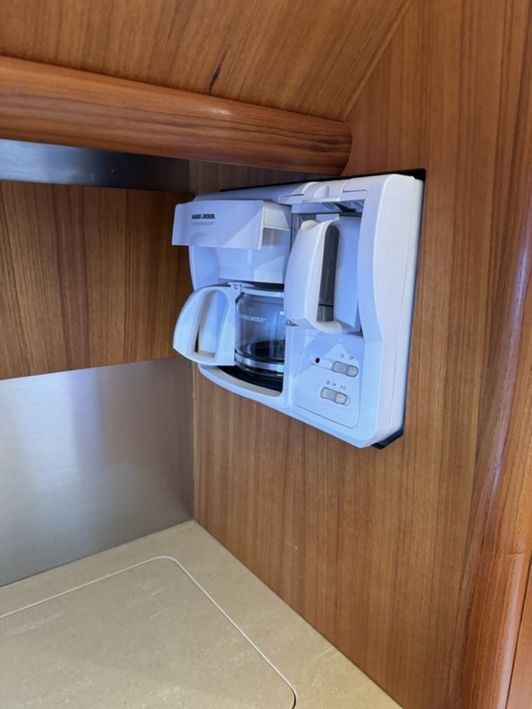 Corian countertops, stainless steel sink, Force 10 two-burner stove, microwave oven, built-in coffee maker, NovaKool refrigerator/freezer (new May 2018). Modern and functional for onboard living.