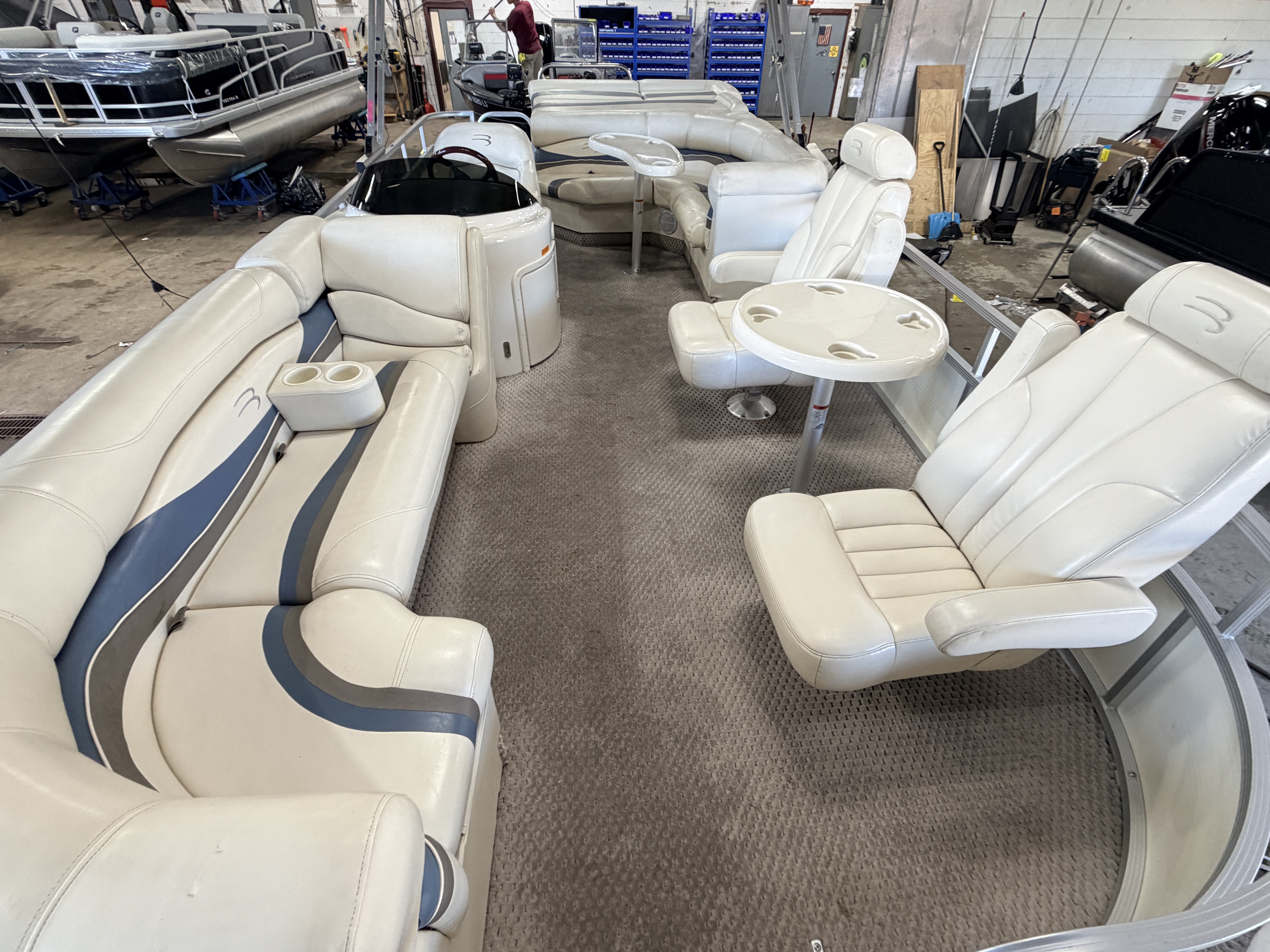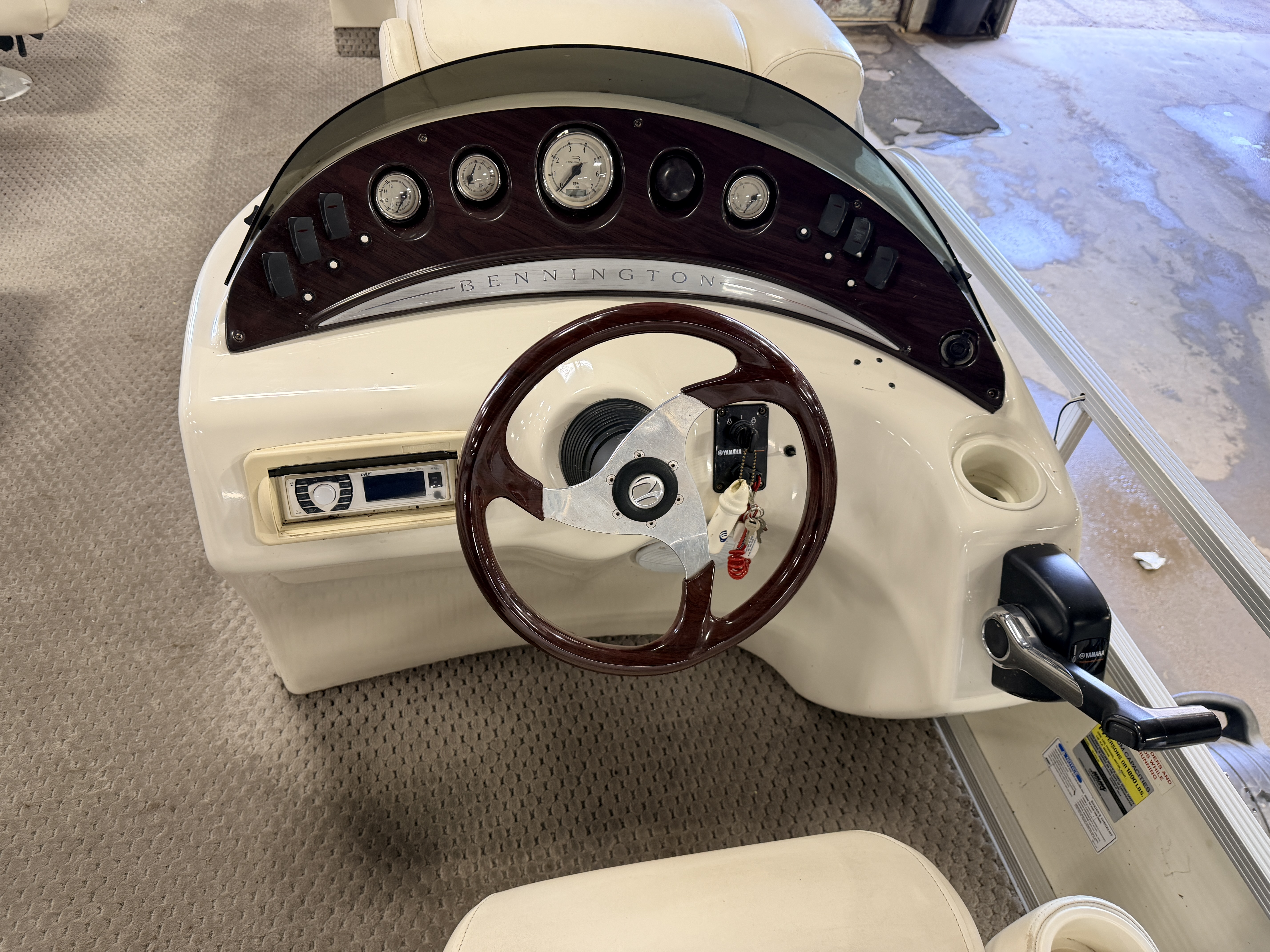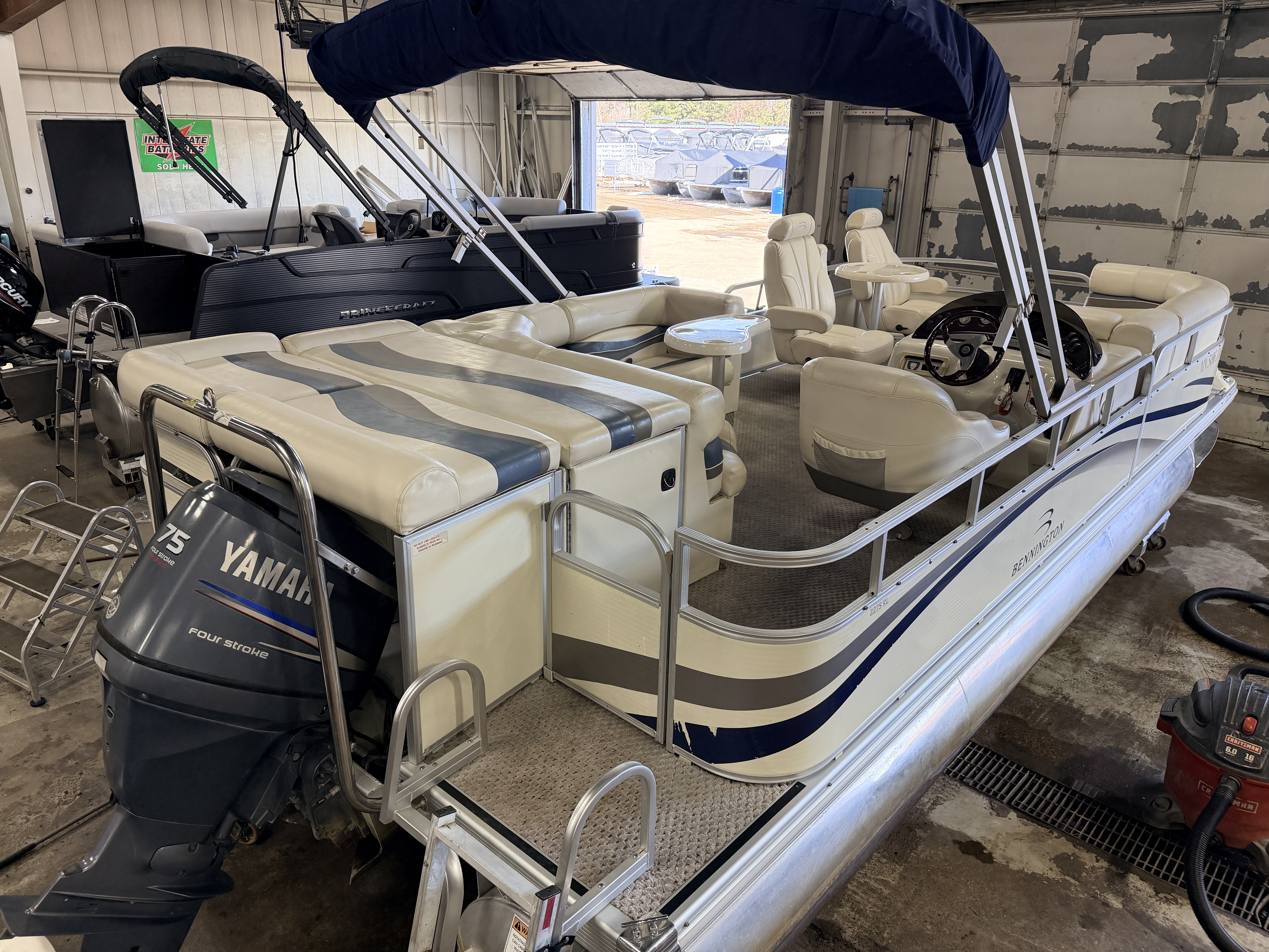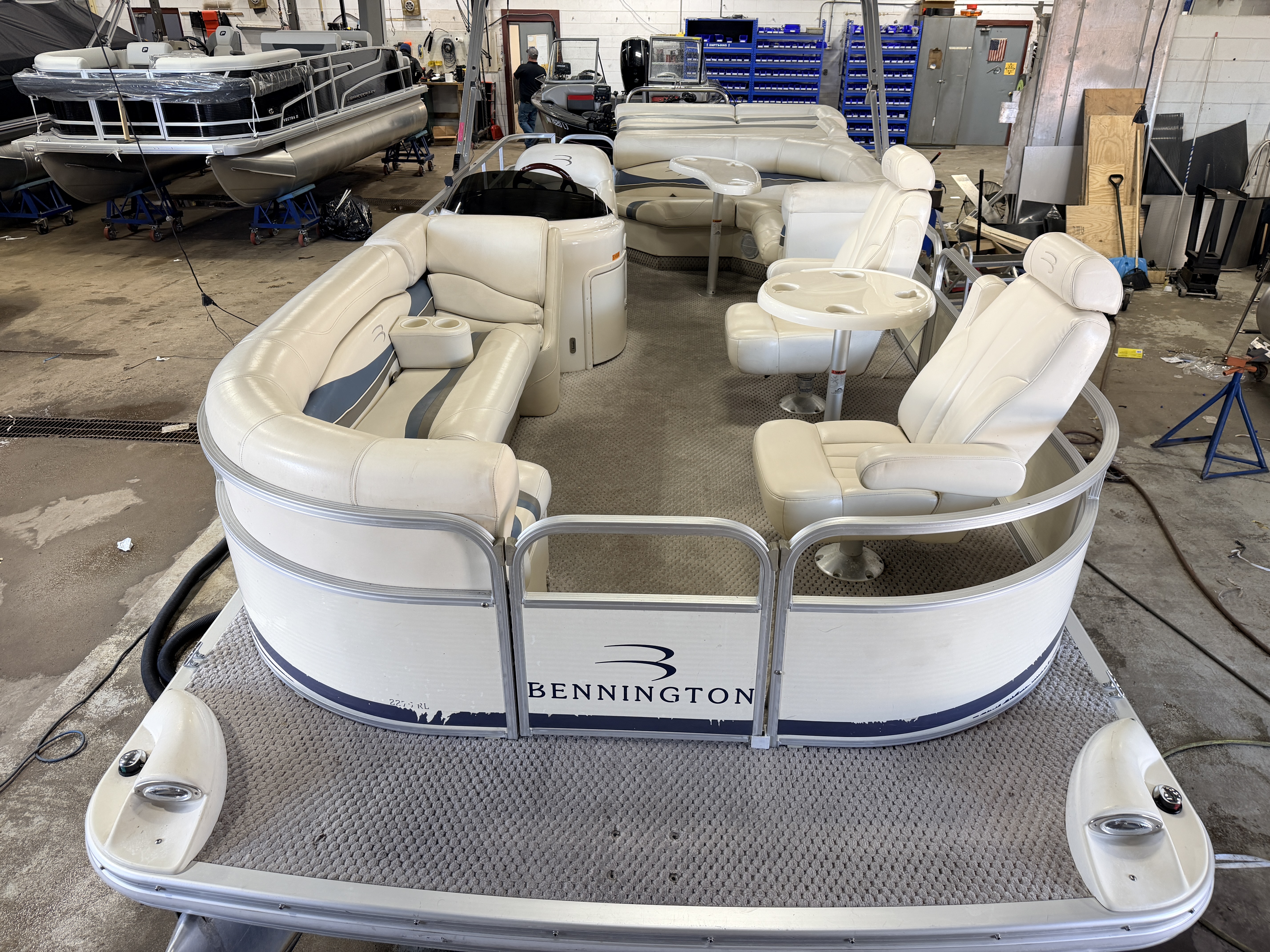2005 Bennington 2275RL Pontoon & 75HP Yamaha Fourstroke. Interior seating includes Lounge couch, Dual Lounge chairs and Captain's Chair, L-shaped Couch and Large Sun Deck. Features include table, Fiberglass helm with Tachometer, Fuel, Volt and Trim gauges, Pyle Bluetooth Stereo, Fold down Swim Ladder and Platform, Privacy/Changing station, and Docking Lights. Additional Features include Power Bimini top, built-in Ski/Tow bar, and movable cup holder.