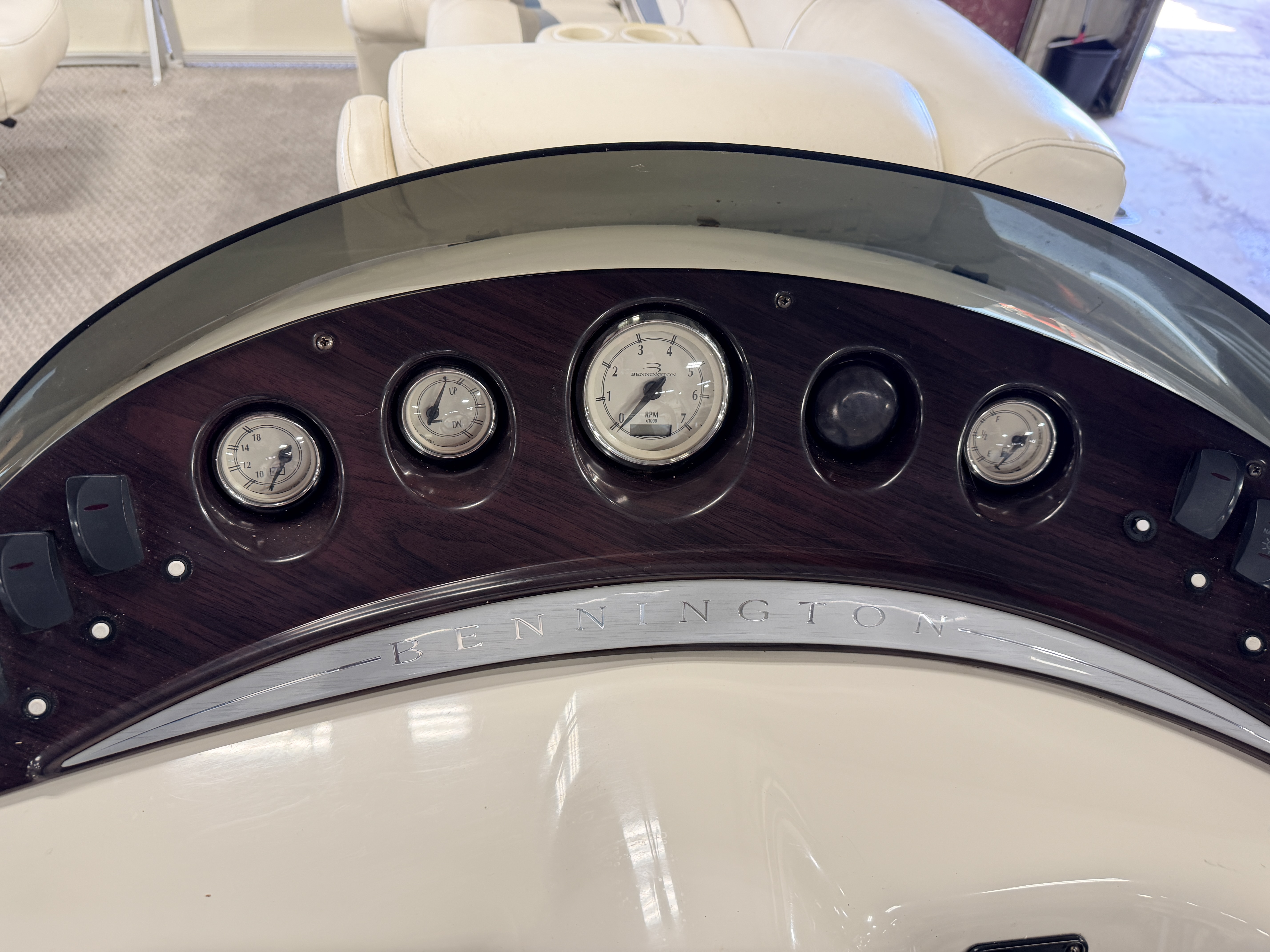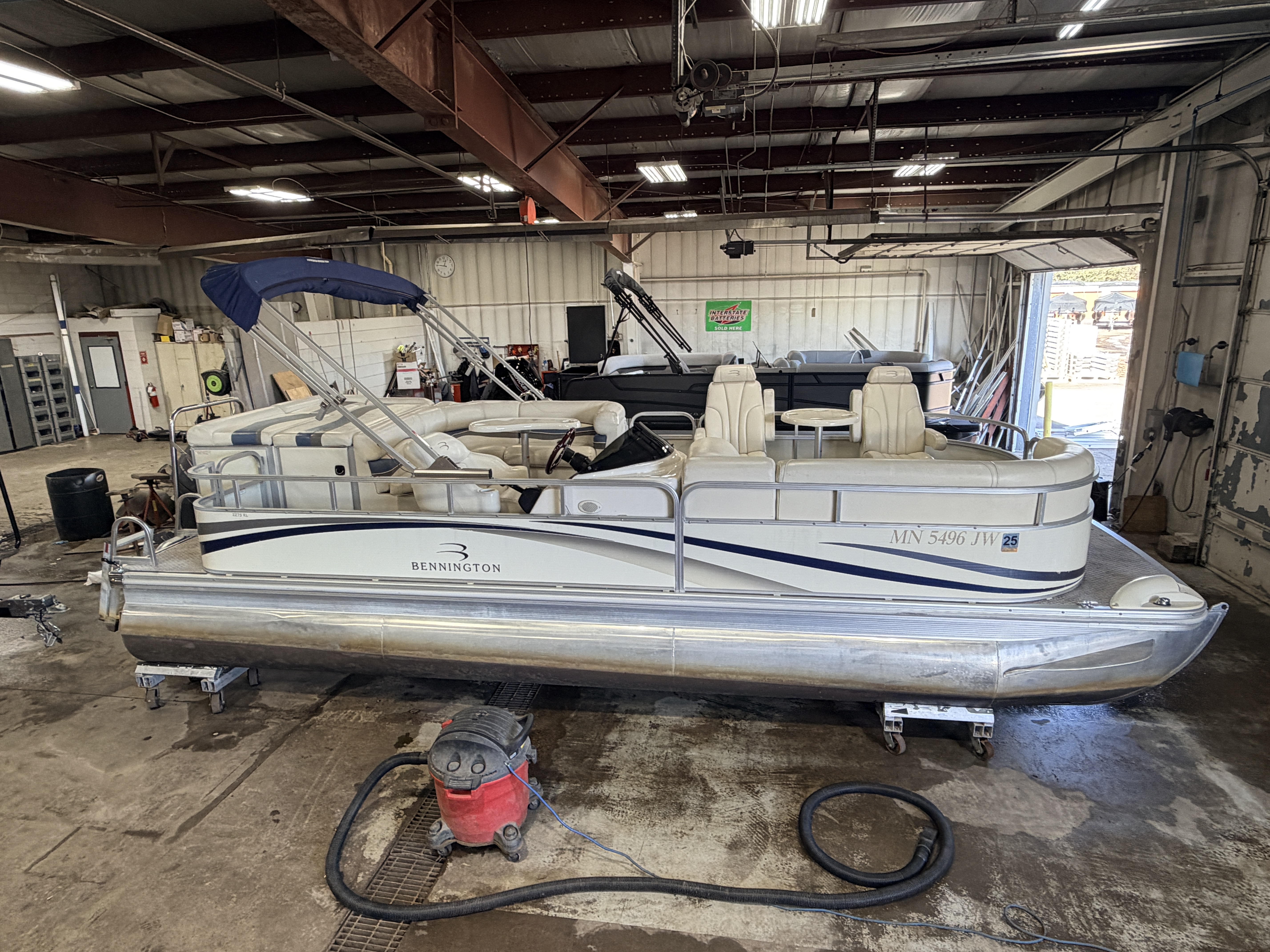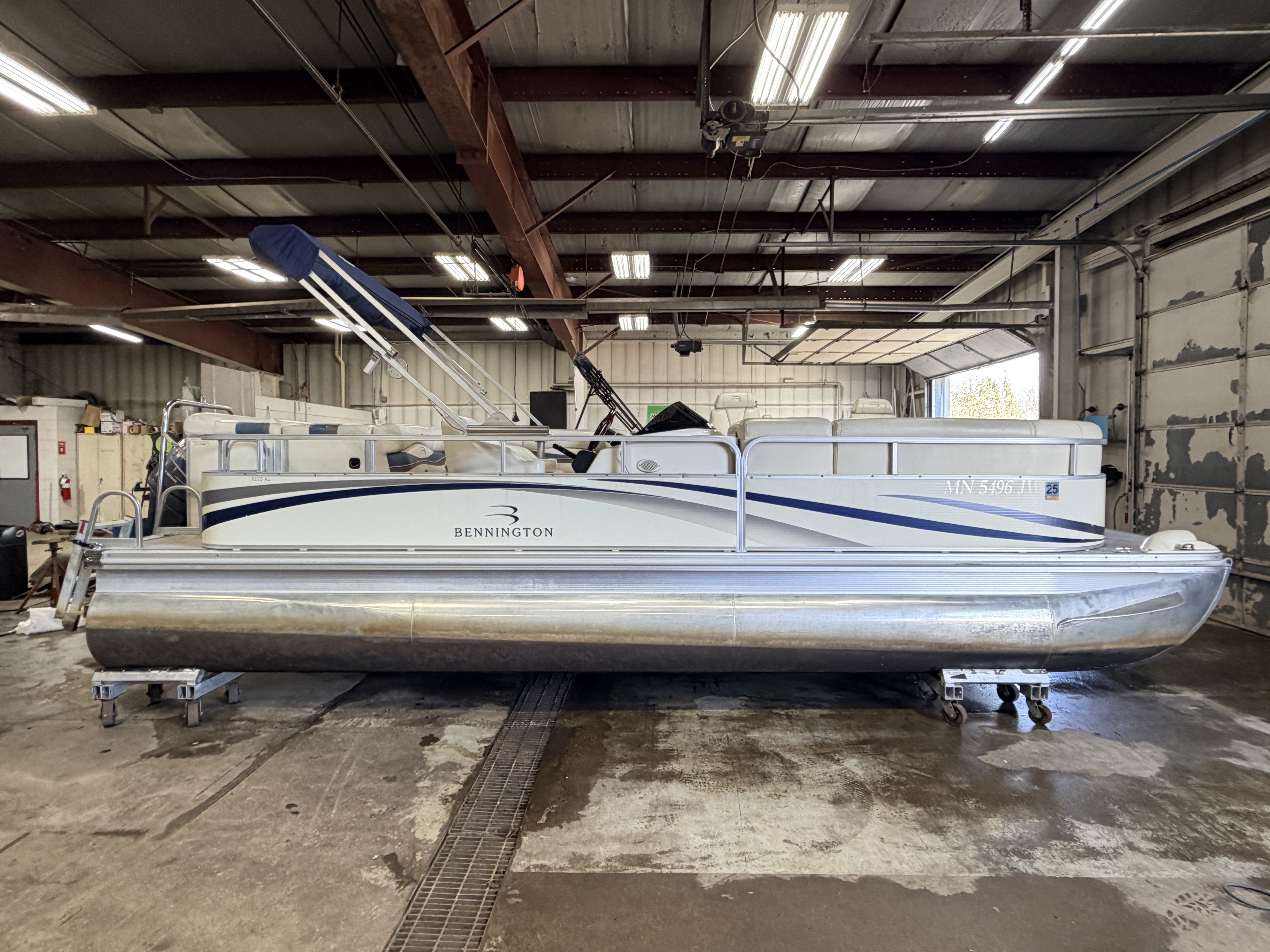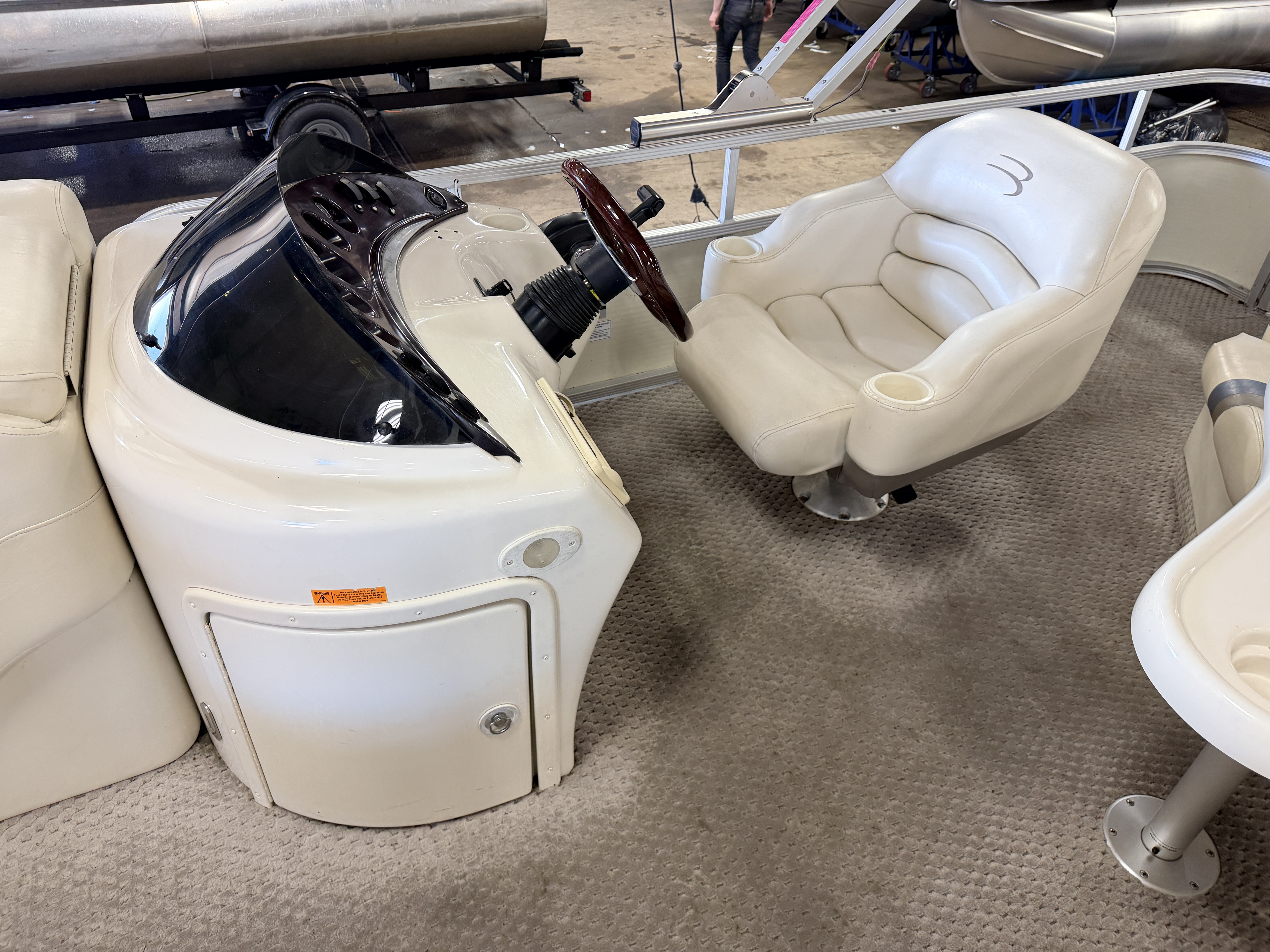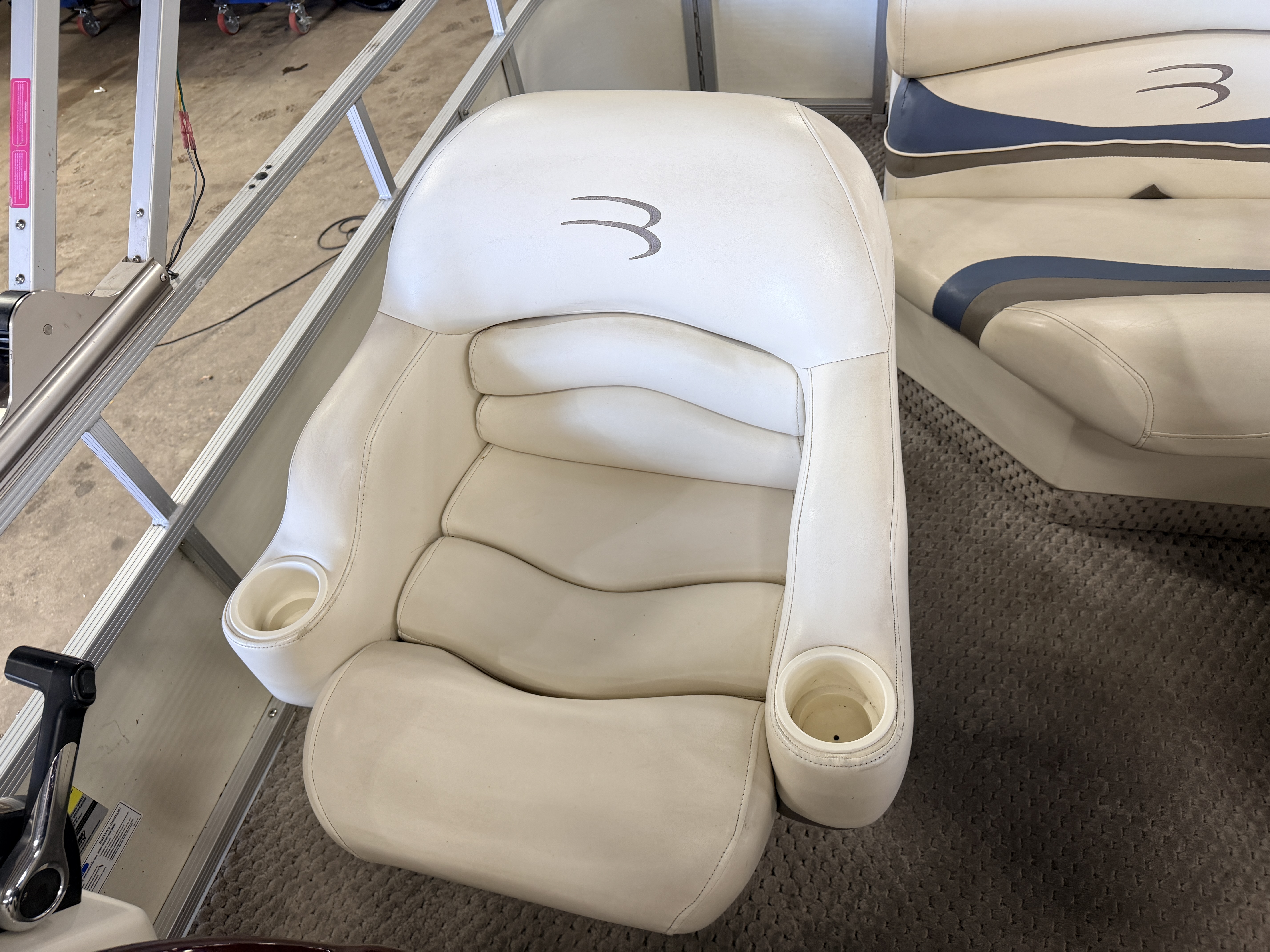 2005 Bennington 2275RL Pontoon & 75HP Yamaha Fourstroke. Interior seating includes Lounge couch, Dual Lounge chairs and Captain's Chair, L-shaped Couch and Large Sun Deck. Features include table, Fiberglass helm with Tachometer, Fuel, Volt and Trim gauges, Pyle Bluetooth Stereo, Fold down Swim Ladder and Platform, Privacy/Changing station, and Docking Lights. Additional Features include Power Bimini top, built-in Ski/Tow bar, and movable cup holder.