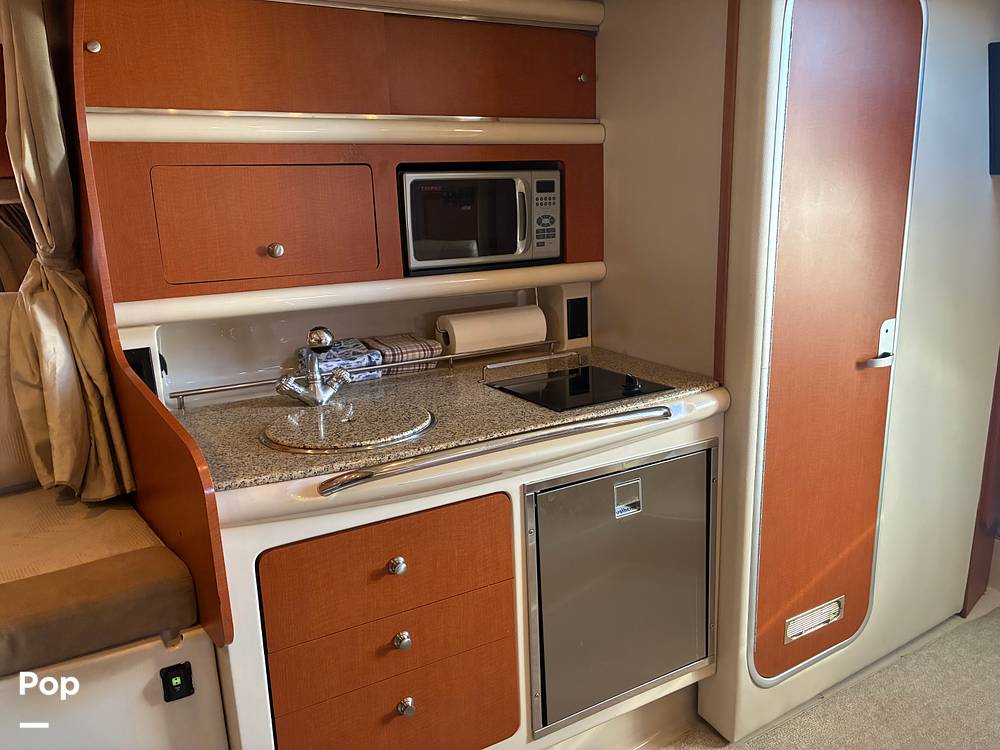 The cockpit is arranged for both cruising and entertaining, featuring a wraparound lounge, a comfortable helm with clear visibility, snap-in carpet, and direct access to the swim platform through the transom door. Below, the cabin feels open for its size, with clean finishes and a functional layout. The forward berth converts easily via the power-assisted table system, and the mid-cabin adds additional sleeping accommodations, allowing the boat to sleep up to six. Two televisions are installed for onboard entertainment. The galley is equipped with a microwave, cooktop, refrigerator, and storage for weekend or extended cruising. The enclosed head offers a sink, toilet, and pull-out shower.