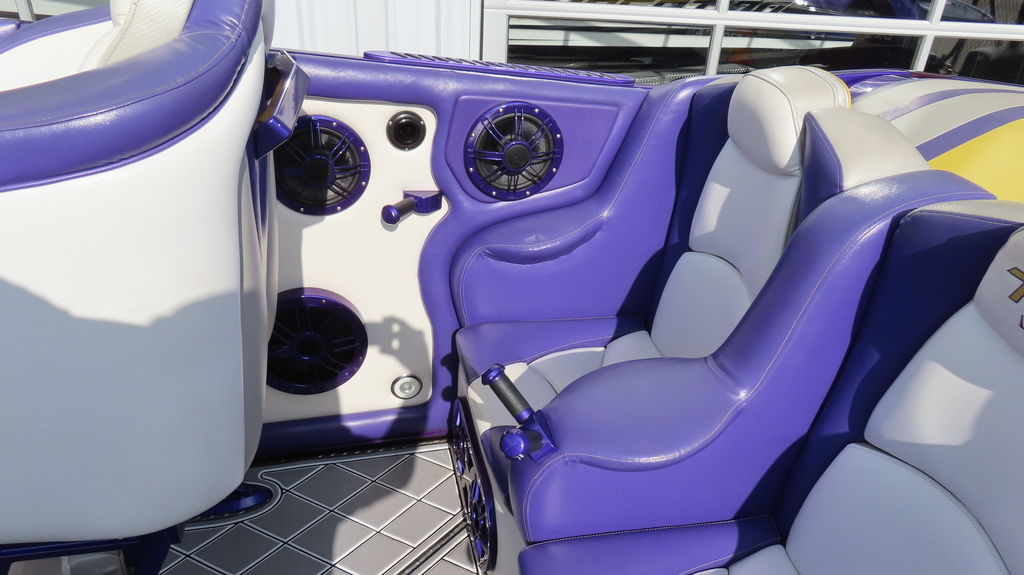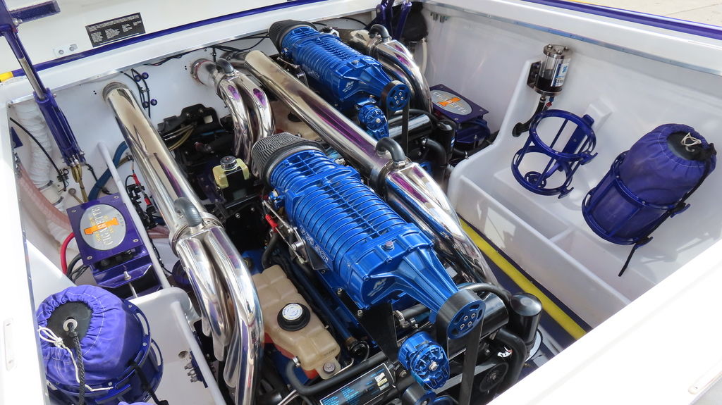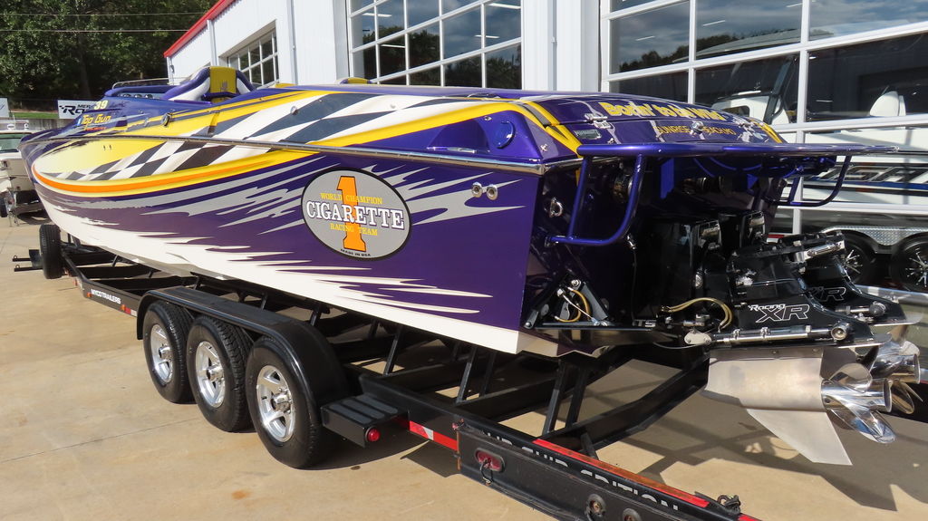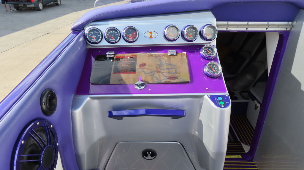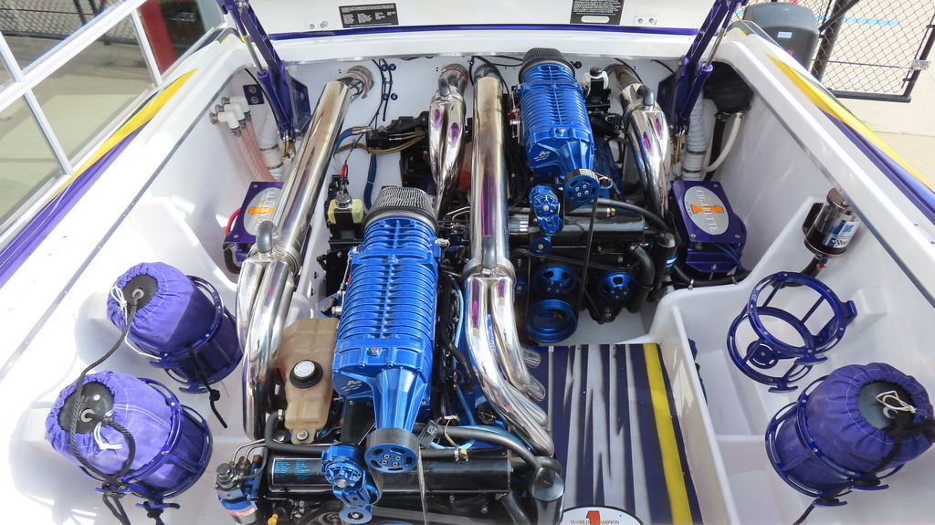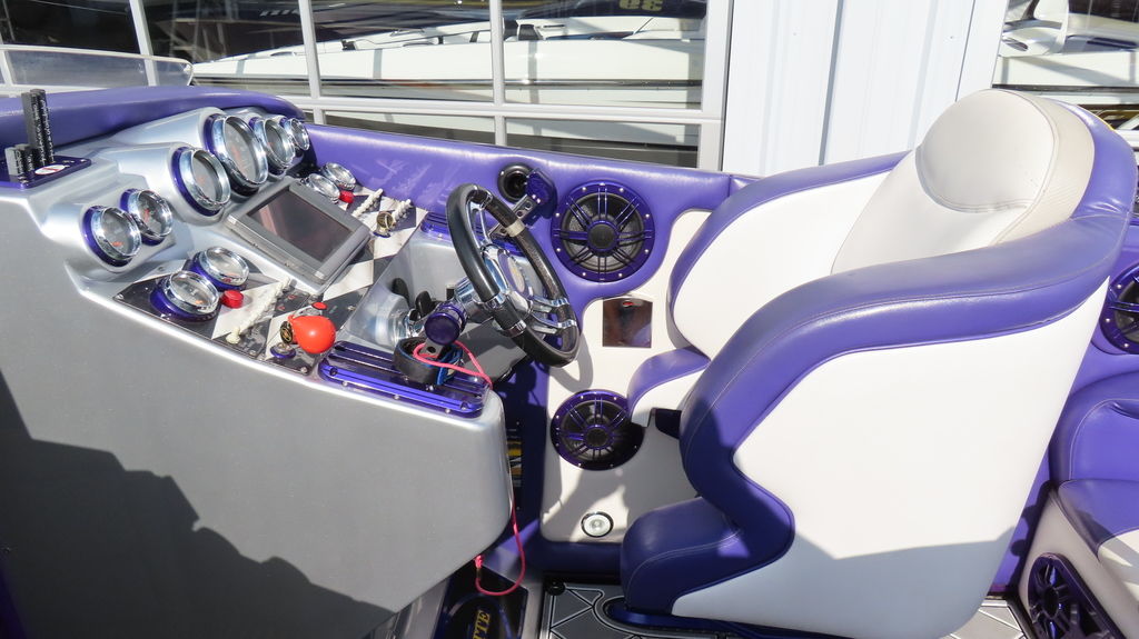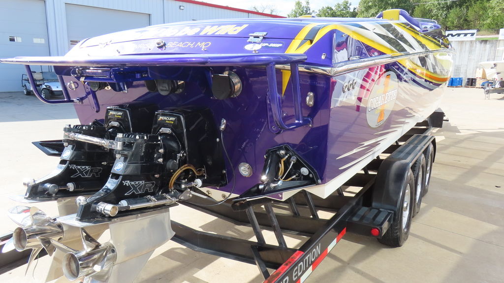 Upgraded Waves and Wheels sound system, LED underwater lights, ITS transoms, XR uppers, Sportmaster lowers with 5 blade 32P props, 280 Kplanes, external switchable mufflers, Livorsi gauges, GPS speedometer, Garmin 5208 touchscreen GPS chartplotter, heads up mechanical indicators, tilt helm, depth sounder, fume detector, halon system, electric bolsters, cockpit carpet, upgraded stereo system, covergirl cabin with porta potty, sea strainers, billet fender racks in bilge, shore power, battery charger, and Myco trailer with dual moped racks, tool box, spare, and drive guard included.