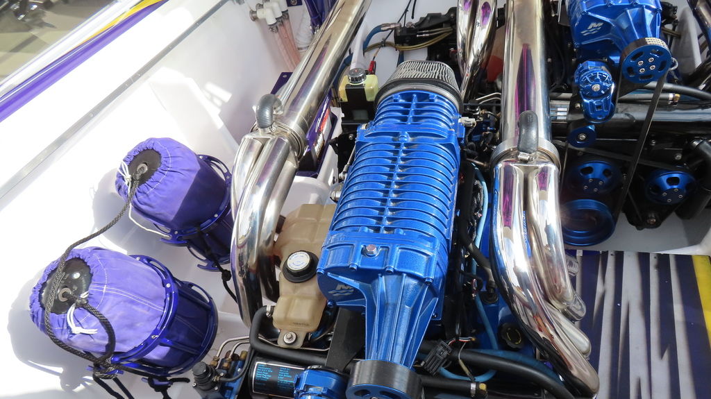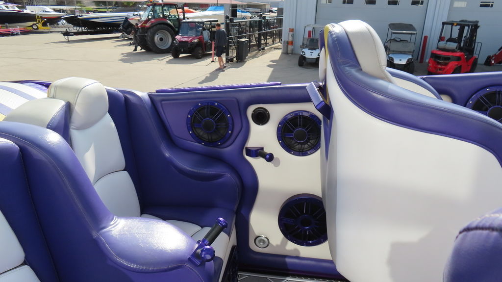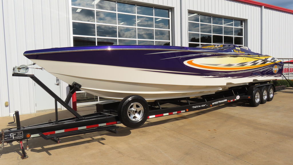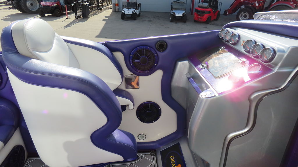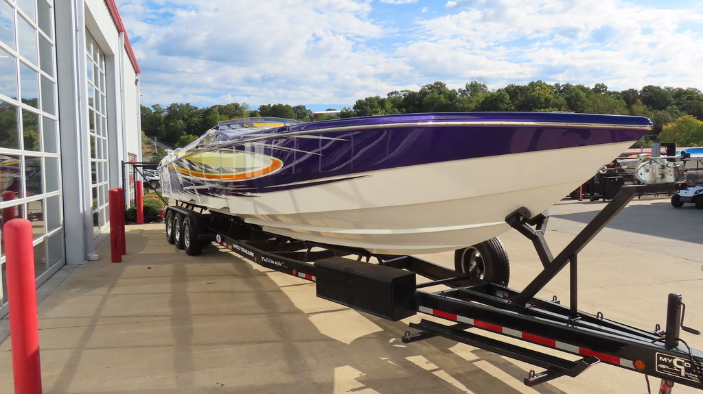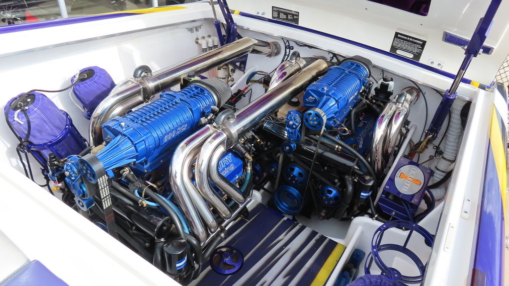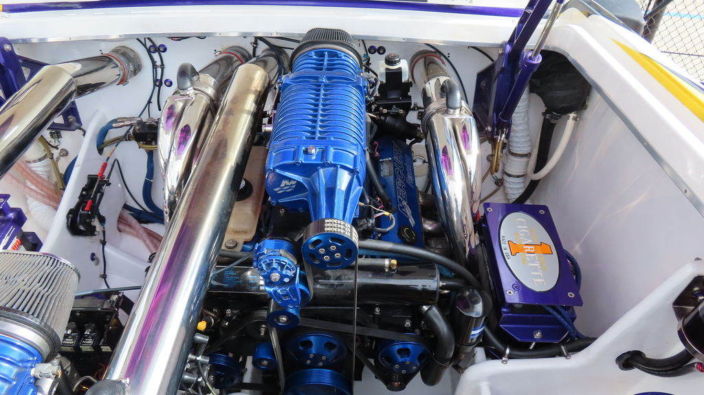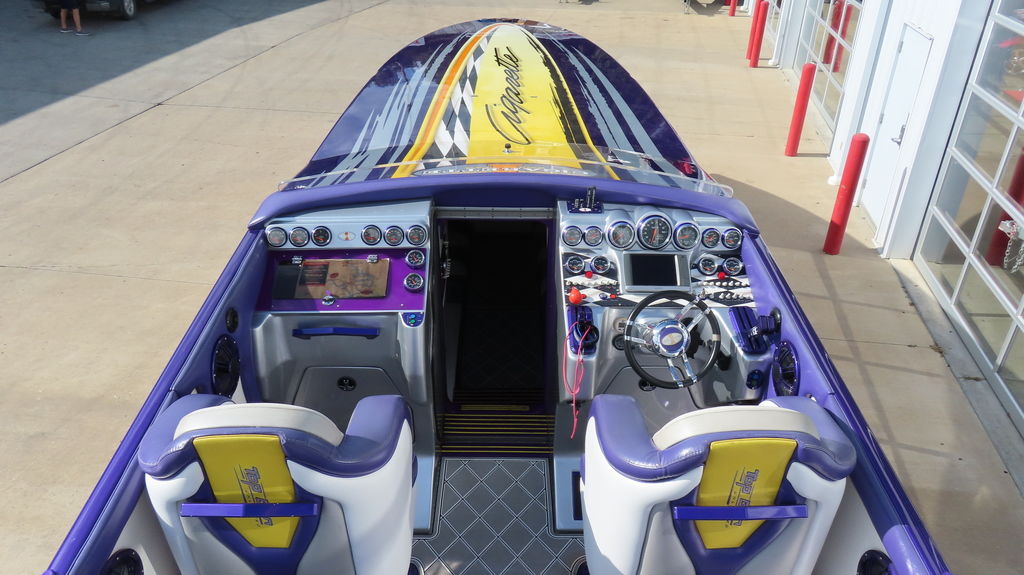 Upgraded Waves and Wheels sound system, LED underwater lights, ITS transoms, XR uppers, Sportmaster lowers with 5 blade 32P props, 280 Kplanes, external switchable mufflers, Livorsi gauges, GPS speedometer, Garmin 5208 touchscreen GPS chartplotter, heads up mechanical indicators, tilt helm, depth sounder, fume detector, halon system, electric bolsters, cockpit carpet, upgraded stereo system, covergirl cabin with porta potty, sea strainers, billet fender racks in bilge, shore power, battery charger, and Myco trailer with dual moped racks, tool box, spare, and drive guard included.