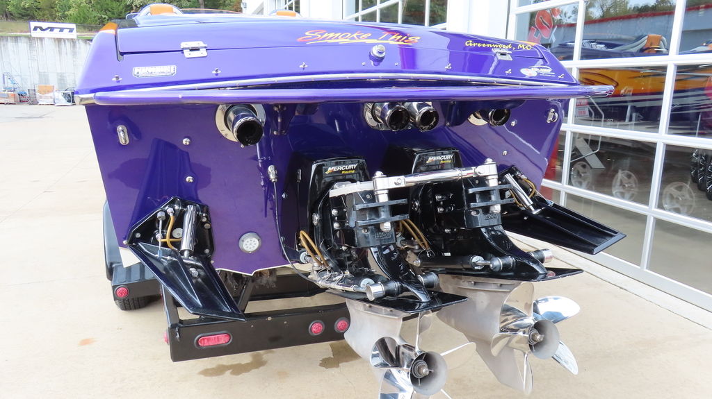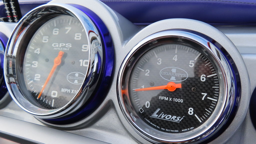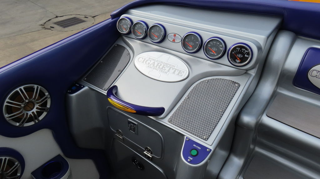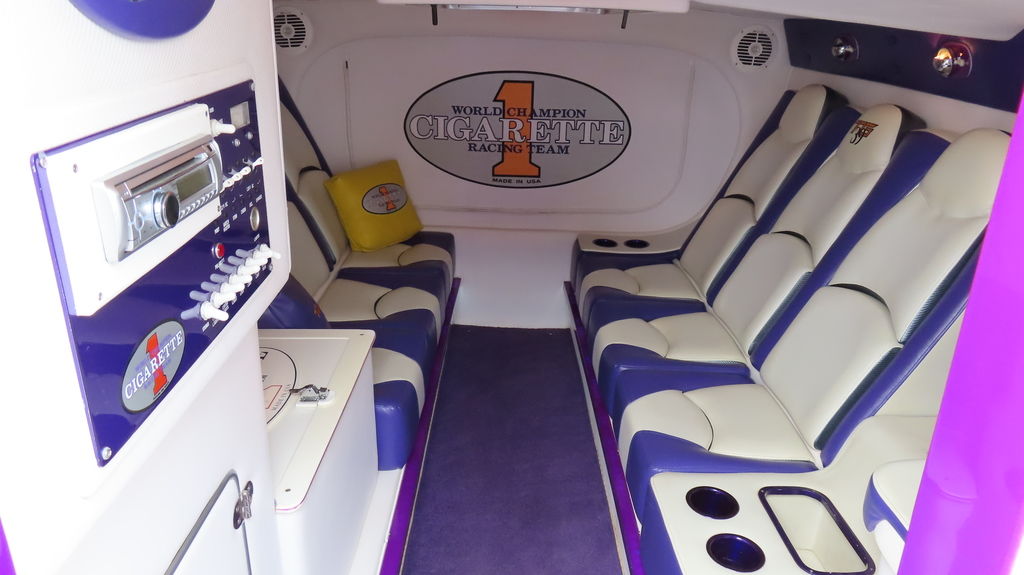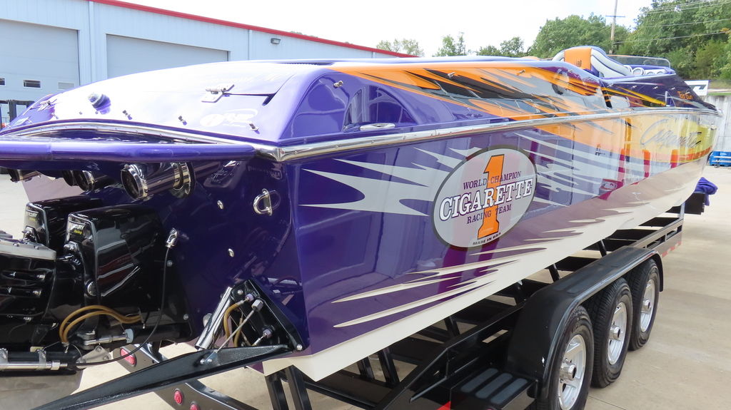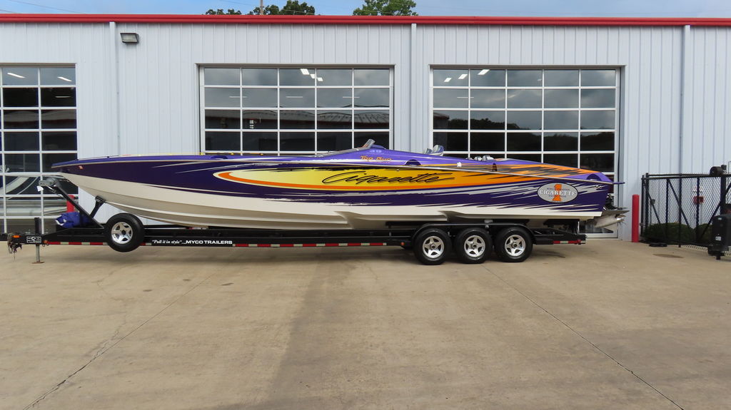 2005 Cigarette 39 Top Gun powered twin Zul 700s, 40 hours on rebuilds, IMCO drives w/ Sportmaster lowers regularly maintained at Performance Boat Center, Hering 5 Blade Props, 380 Kplanes, LED underwater lights, Garmin GPS Centered in dash, Livorsi gauges, GPS speedometer, Livorsi digital indicators, depth sounder, FOCAL stereo with dash remote, Sea Deck flooring, electric bolsters, Half cabin with porta potty, fender racks in bilge, Swim Platform, Cockpit cover, Full Mooring cover, and Bow Bra, MYCO trailer included.