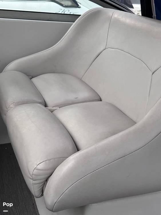 The cockpit is spacious and thoughtfully arranged, featuring a comfortable double-wide helm seat, wraparound lounge seating, and a removable table for entertaining guests. Ergonomic controls and a comprehensive dashboard layout allow for easy management of navigation and onboard systems. The cockpit also includes a wet bar with a sink, storage compartments, and cup holders to facilitate social gatherings or family outings.