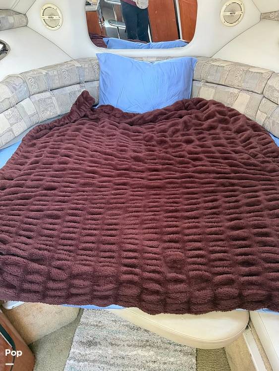 The boat's head compartment is fitted with a marine toilet, sink, and shower, providing essential amenities for extended trips. This 290 CR has AC and heat for varying weather conditions. Large windows and hatches allow for natural light and ventilation.