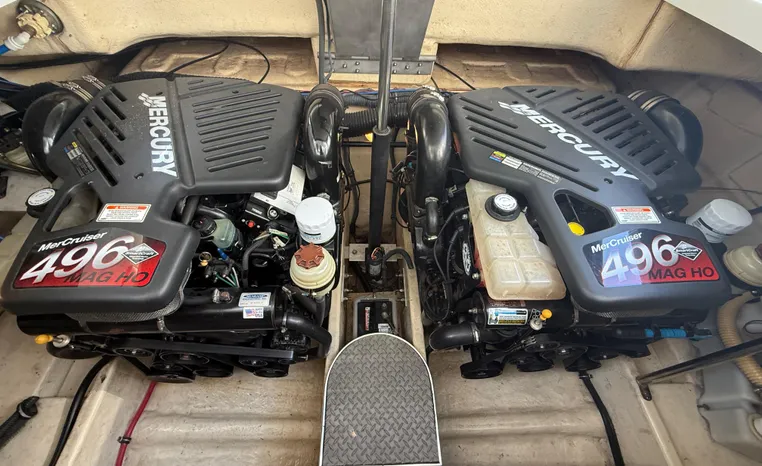 Freash water since new, this vessel features Twin MerCrusier 496 HO (High-Output) Gas Engine's (w/Mercury SmartCraft Digital Display) with Bravo III Sterndrives and only 620 original hours! Notable features include but are not limited to the following: Air-Conditioning & Heat, Head (Vacuflush) w/Vanity/Sink/Stall-Shower, Custom Hardwood Flooring, Central Vacuum System, Kohler 7.3kw Generator (143-Hours), Bow-Thruster, Windlass Anchor w/Forward Controls, Cockpit Wet Bar w/Sink/Fridge, Raymarine E80 (Color) Radar w/GPS/Chartplotter, Premium Sound System w/iPod/MP3-Connection, Canvas Package (Cockpit Enclosure), Snap-in Snap-out Cockpit Carpeting, and MUCH more!