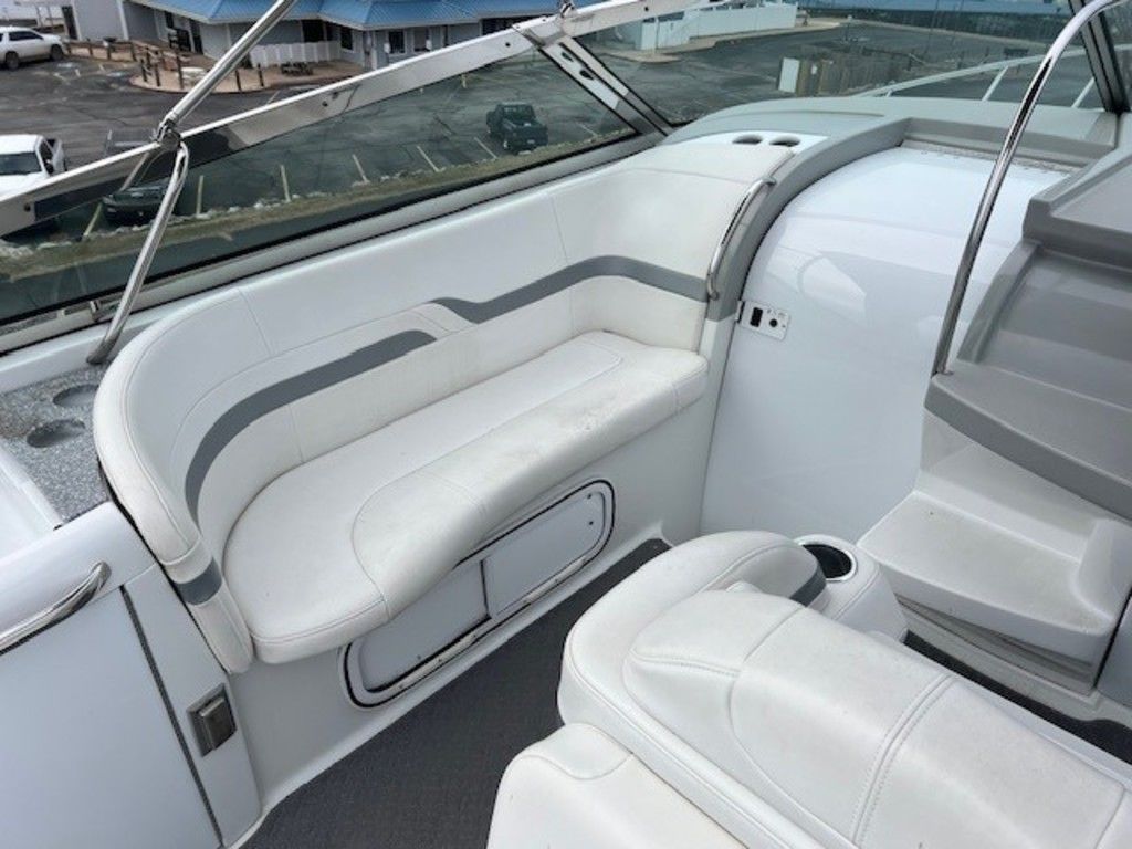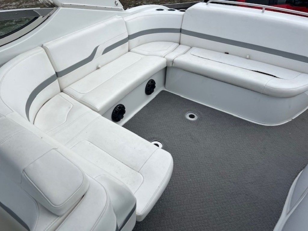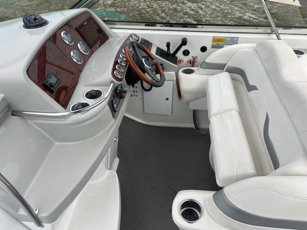 A wet bar with a sink, refrigerator, and integrated cup holders is located in the cockpit area, making it easy to prepare snacks and drinks while entertaining guests. The molded nonskid deck surface ensures safety while moving around the boat, and the stainless steel grab rails provide additional security.