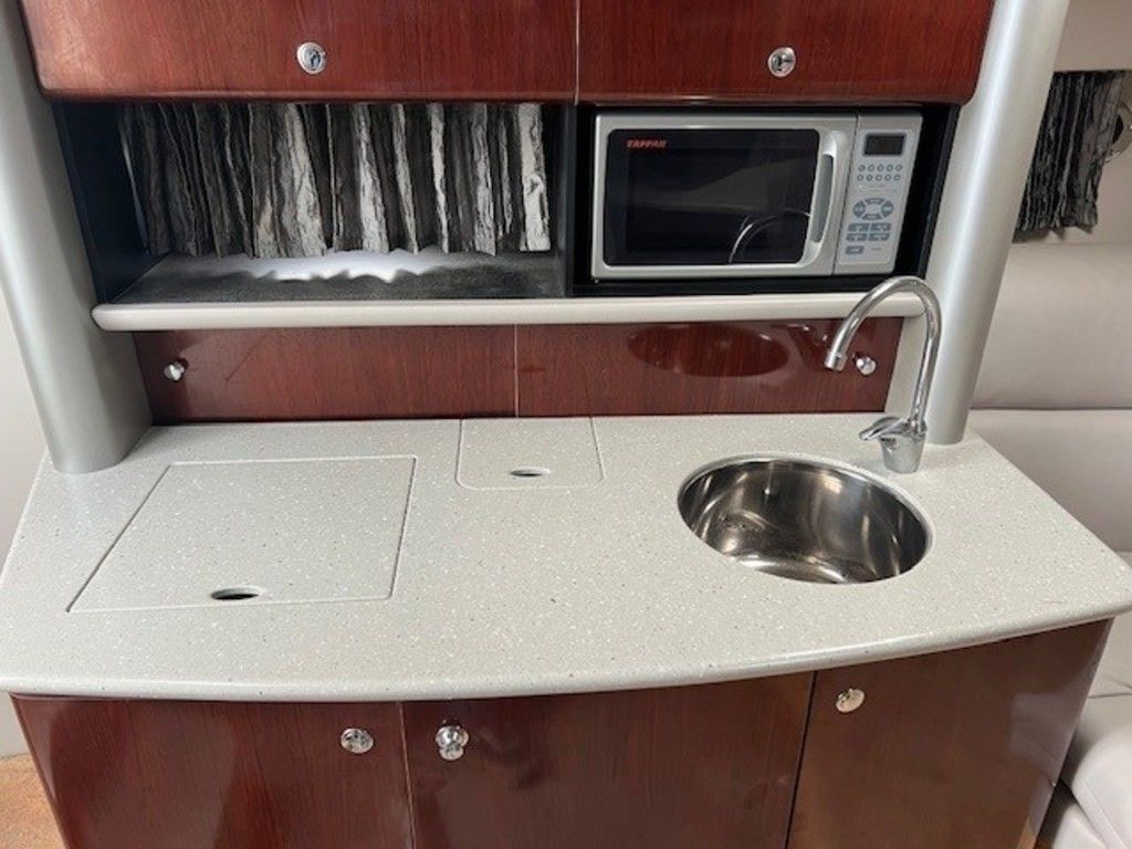 The galley is compact yet functional, equipped with a microwave, a stainless steel sink, a refrigerator, and a stove. Solid-surface countertops and ample storage cabinets make meal preparation and storage convenient and efficient.