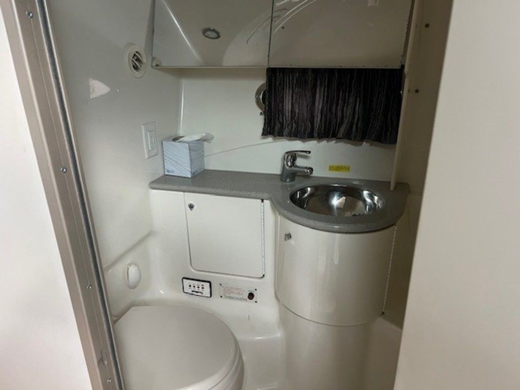 The enclosed head compartment is equipped with a vacuum-flush toilet, a sink with a pull-out shower wand, and a mirrored vanity. The fiberglass-lined interior ensures durability and easy maintenance, while the overhead lighting adds brightness to the space.