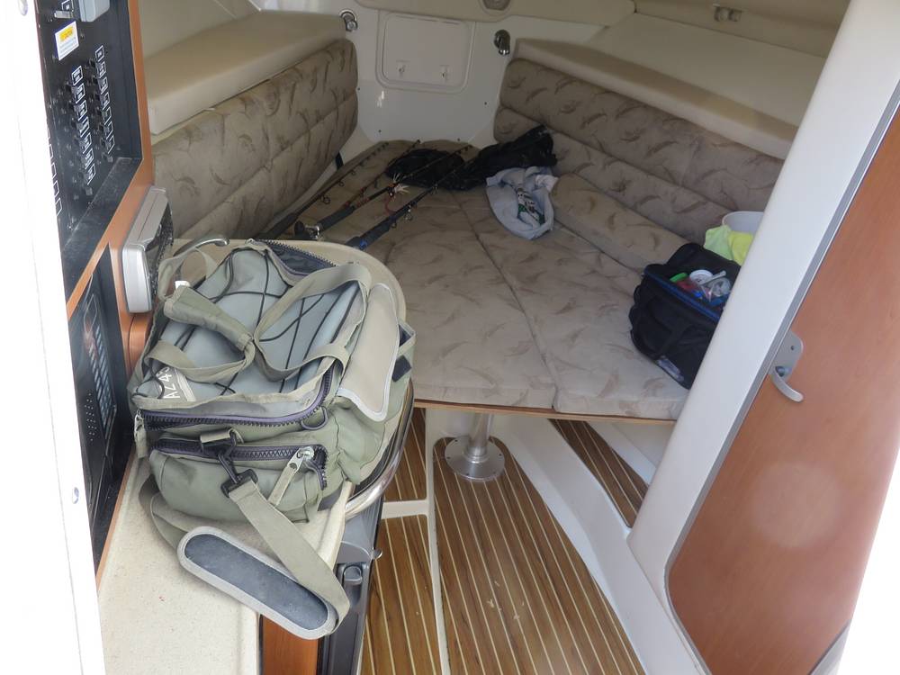 Clever Pullman bunks above the V-berth add two more sleeping pads. V-berth, Pullman bunks, and an aft berth accommodate up to 6 overnight guests.