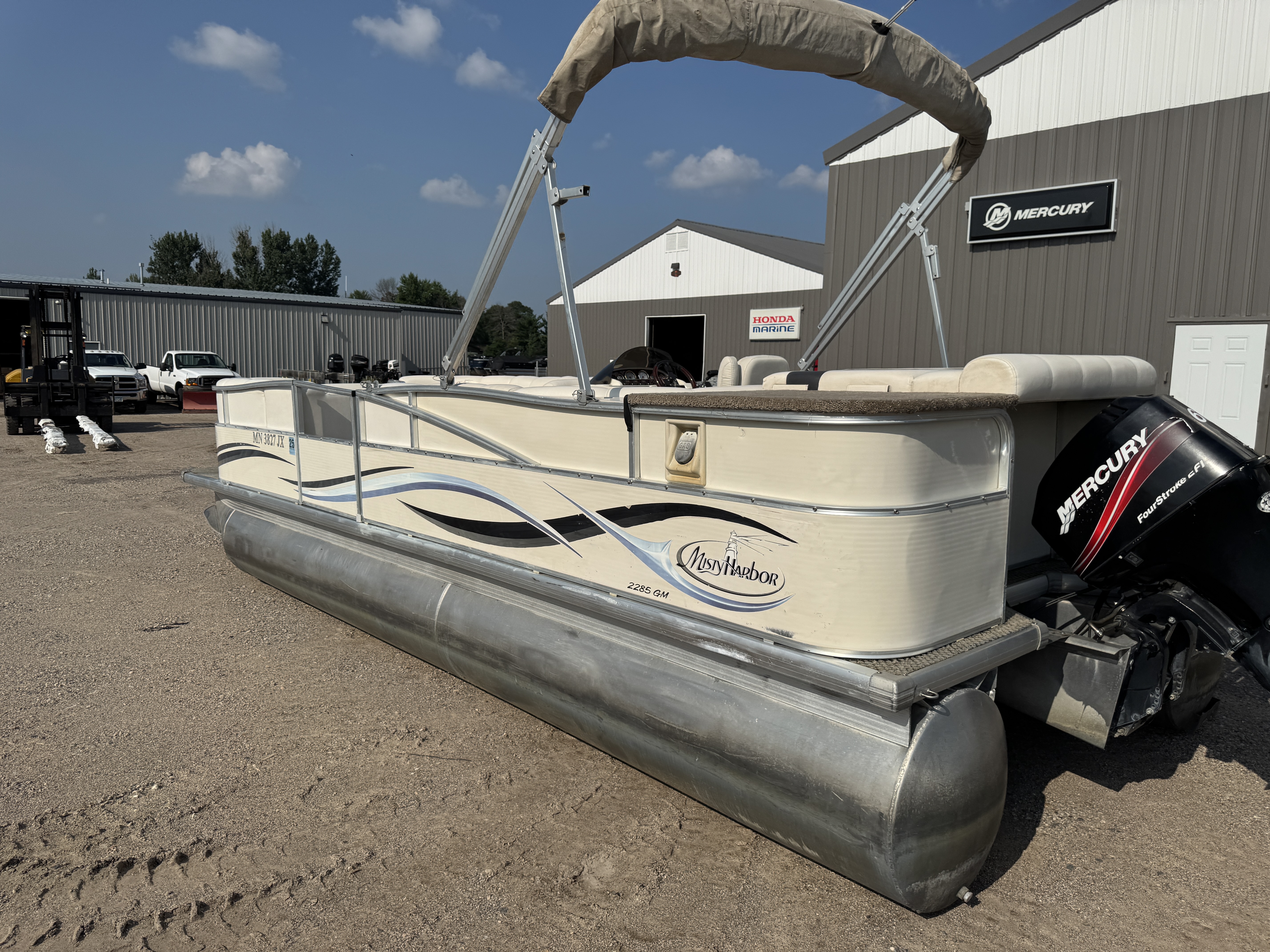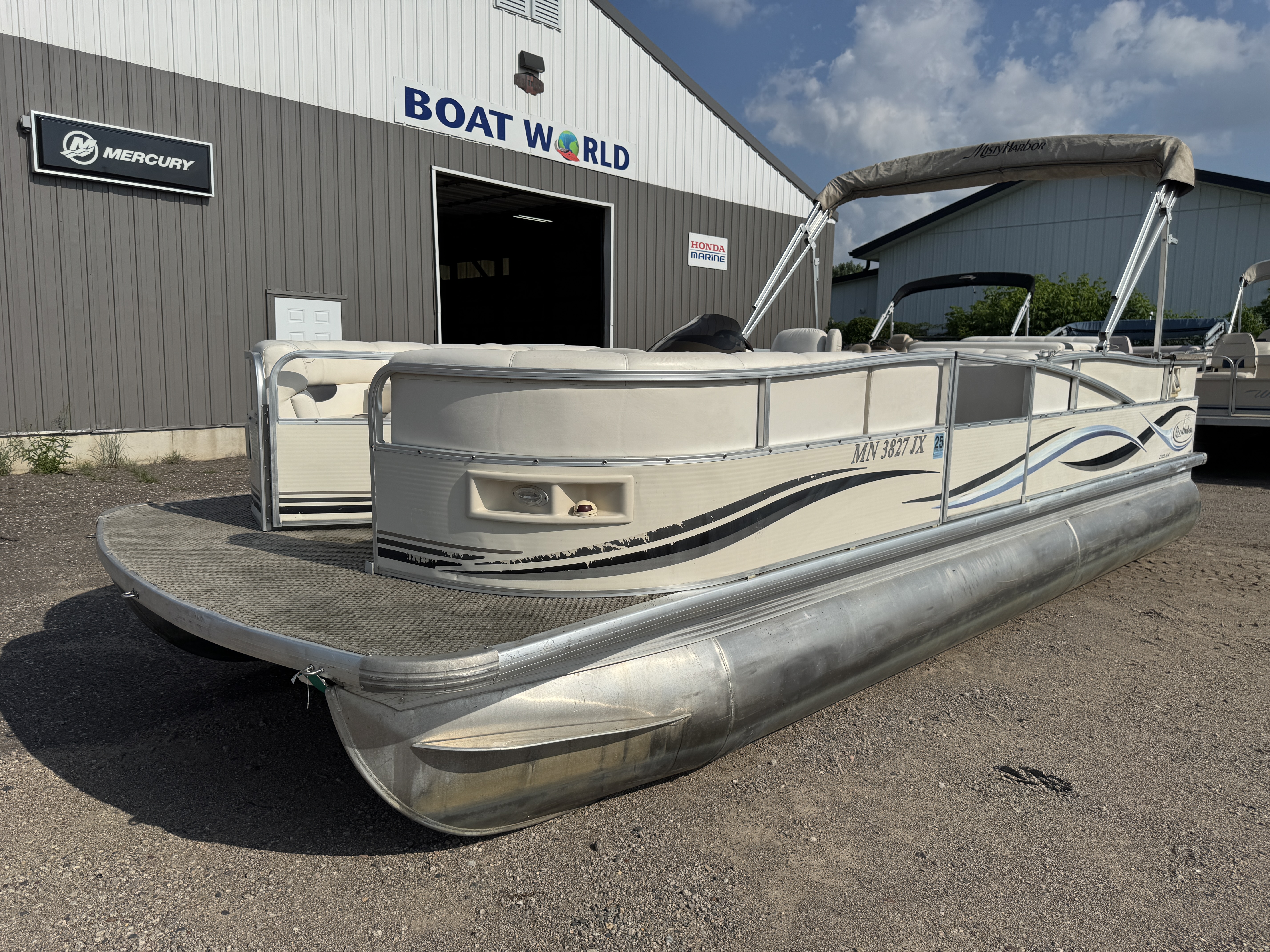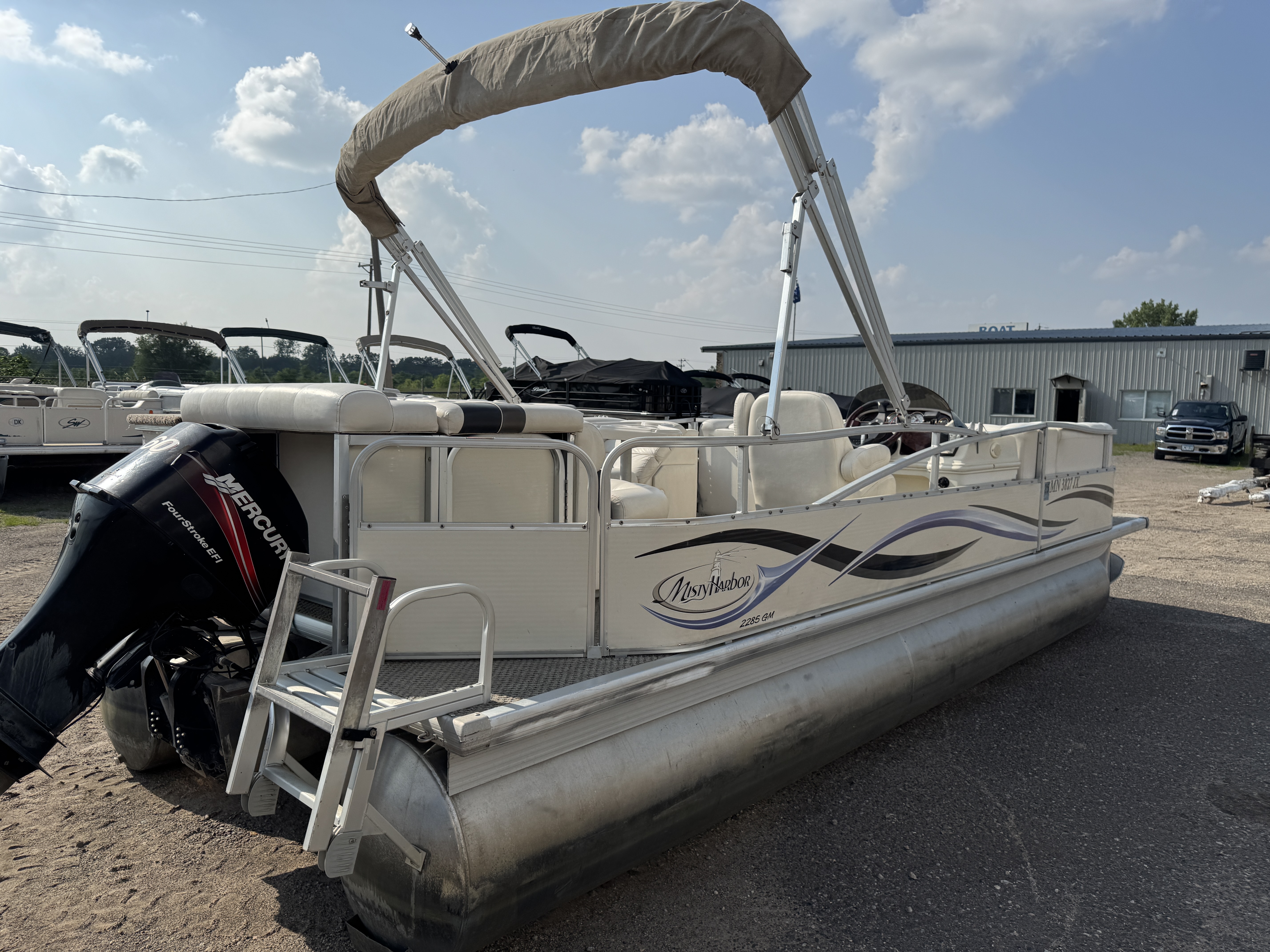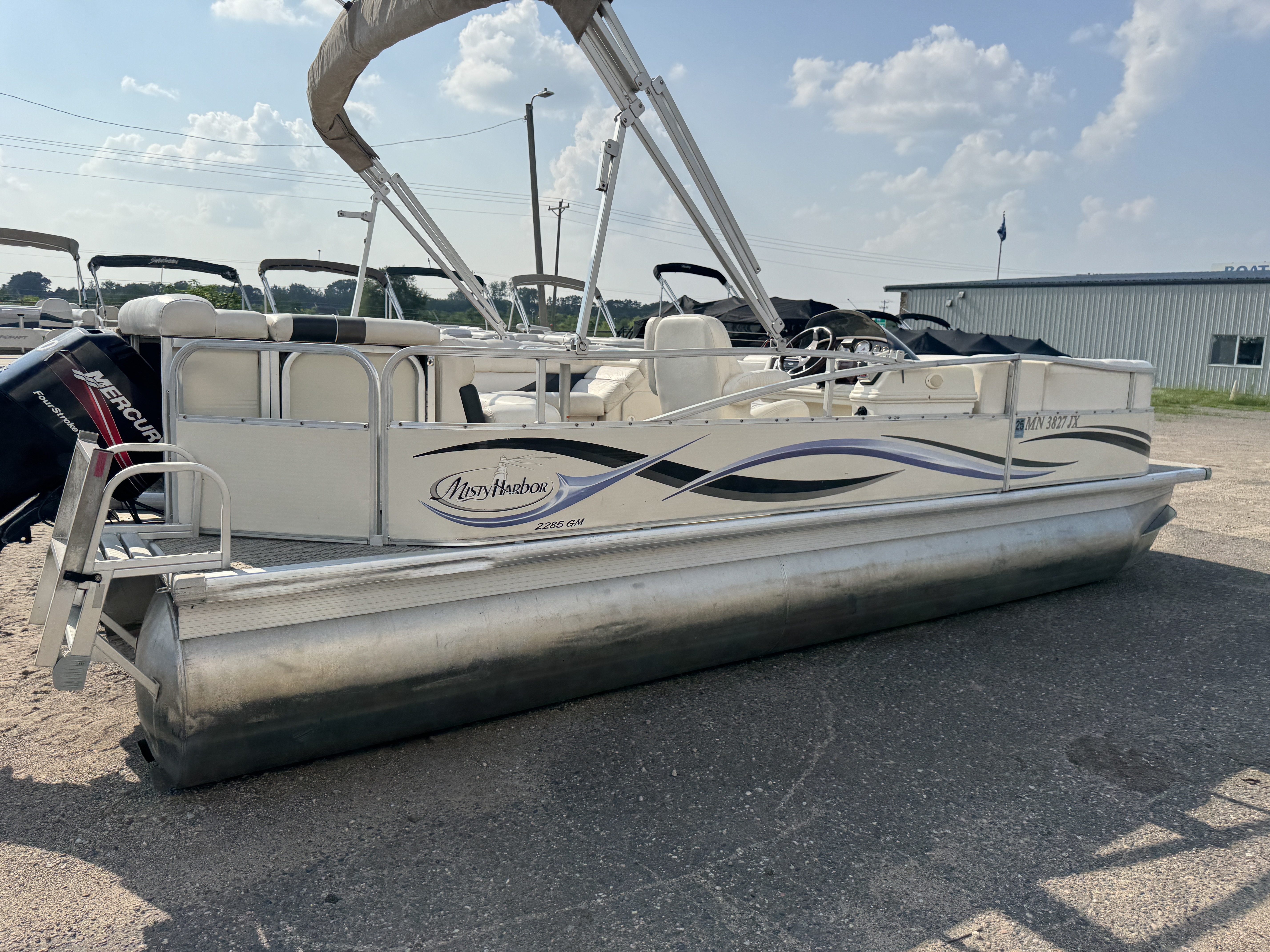 2005 Misty Harbor 2285 GM Pontoon with 60HP Mercury Bigfoot Fourstroke EFI Outboard. This cruise layout pontoon features 2 lounge style couches in front with an L-shaped couch amidships and followed up by a large sun deck. The captain's chair is a low back sport seat with swivel and slide functions as well as fold up arm rests. The helm features a Speedometer, Tachometer, Fuel, Volt and Trim gauge. There is a Clarion CD player stereo system. There are courtesy lights on the side and front of the helm as well as on the front end of the "L" couch. A portion of the sun deck flips up with a privacy/changing station. The rear entry gate opens up to a swim platform and fold down swim ladder. This unit also features a bimini top.