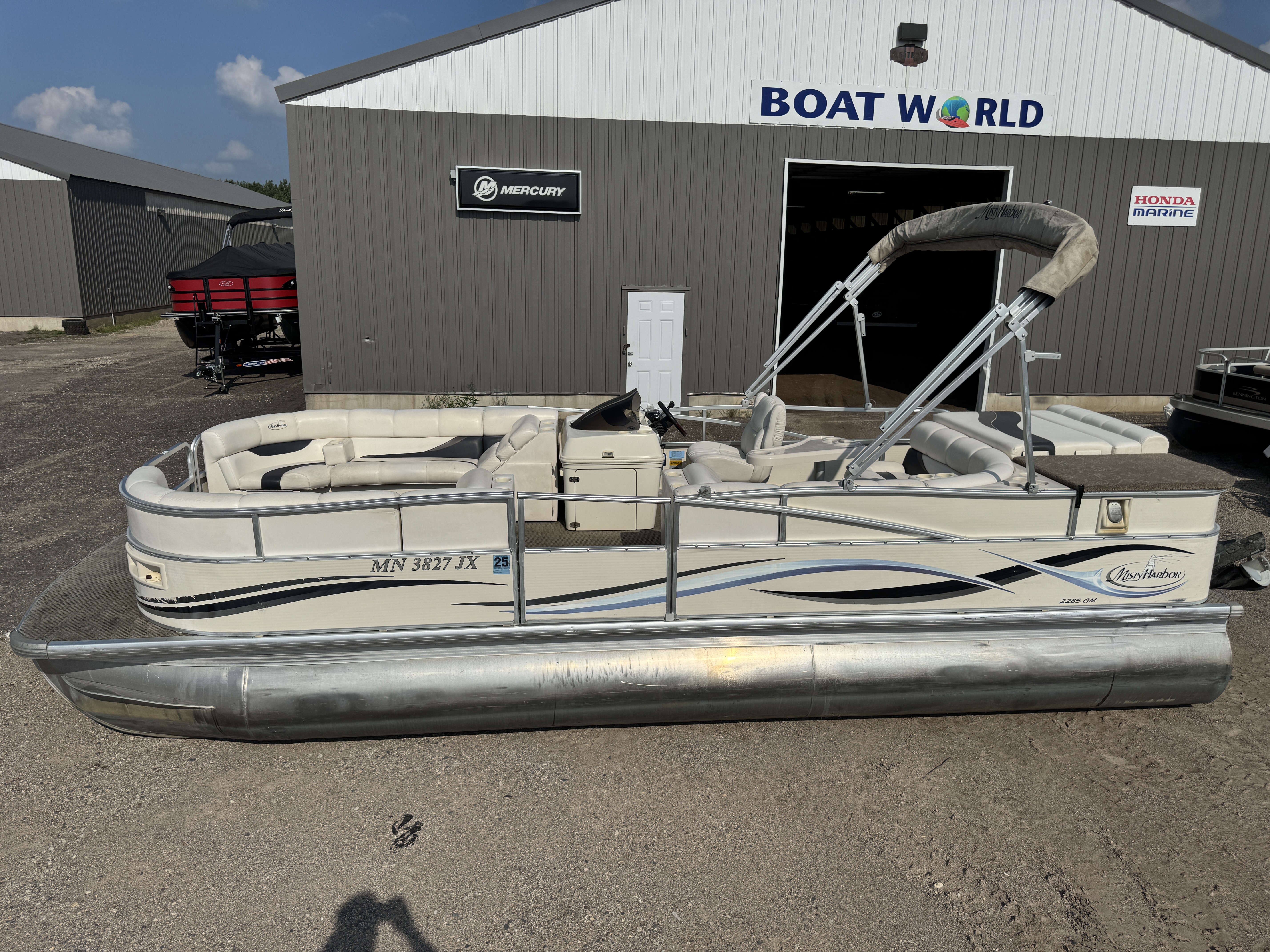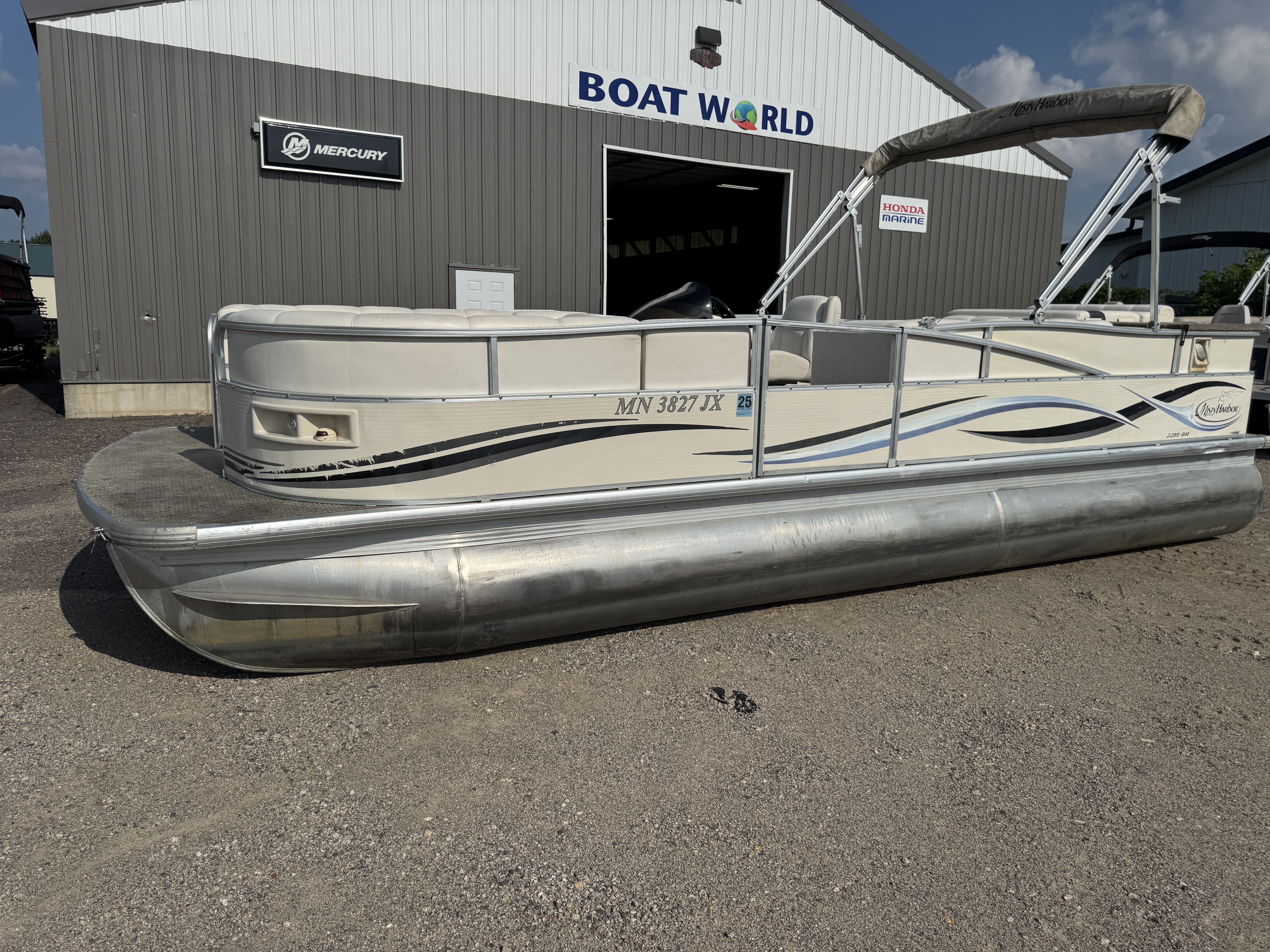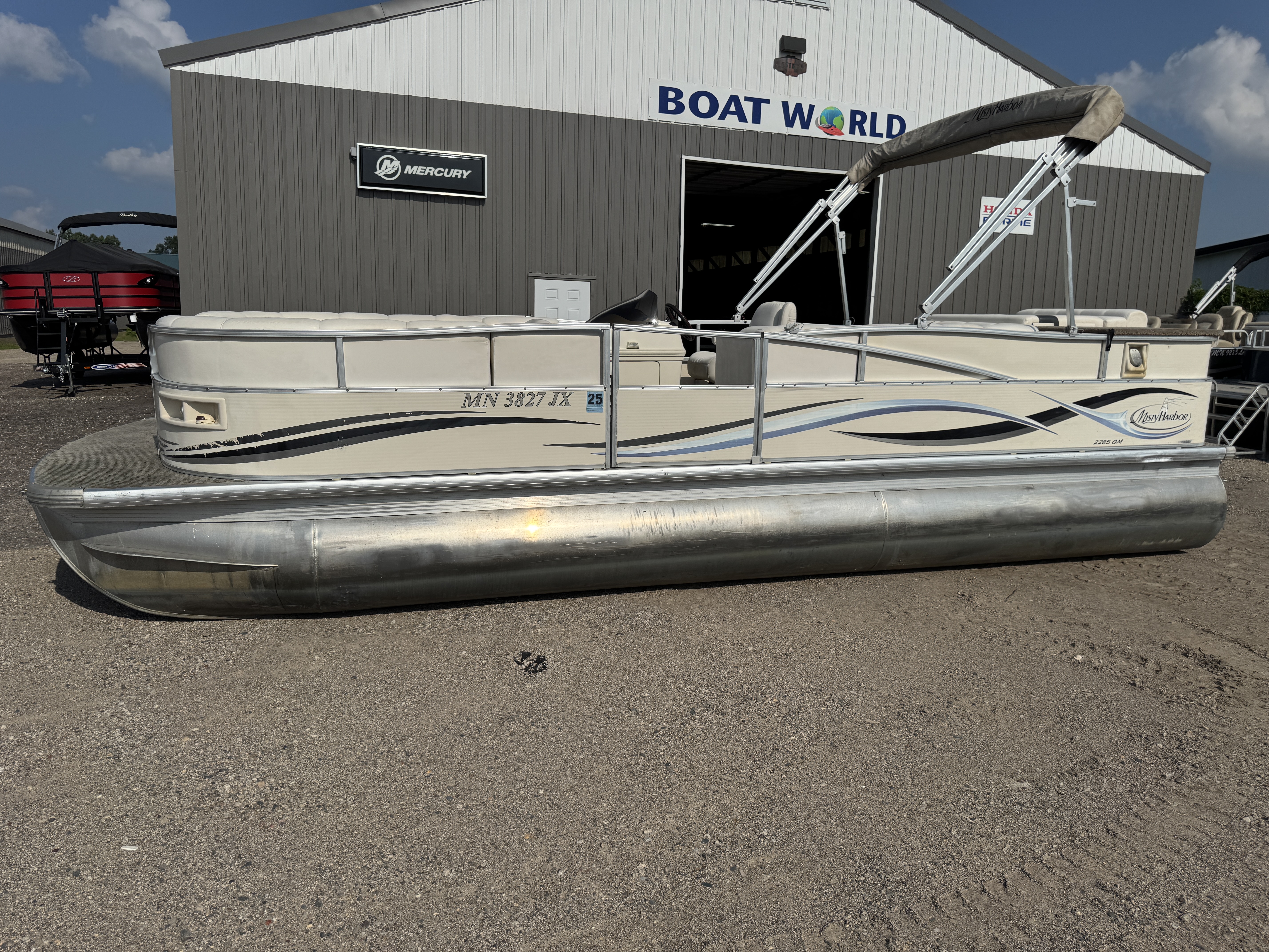 2005 Misty Harbor 2285 GM Pontoon with 60HP Mercury Bigfoot Fourstroke EFI Outboard. This cruise layout pontoon features 2 lounge style couches in front with an L-shaped couch amidships and followed up by a large sun deck. The captain's chair is a low back sport seat with swivel and slide functions as well as fold up arm rests. The helm features a Speedometer, Tachometer, Fuel, Volt and Trim gauge. There is a Clarion CD player stereo system. There are courtesy lights on the side and front of the helm as well as on the front end of the "L" couch. A portion of the sun deck flips up with a privacy/changing station. The rear entry gate opens up to a swim platform and fold down swim ladder. This unit also features a bimini top.