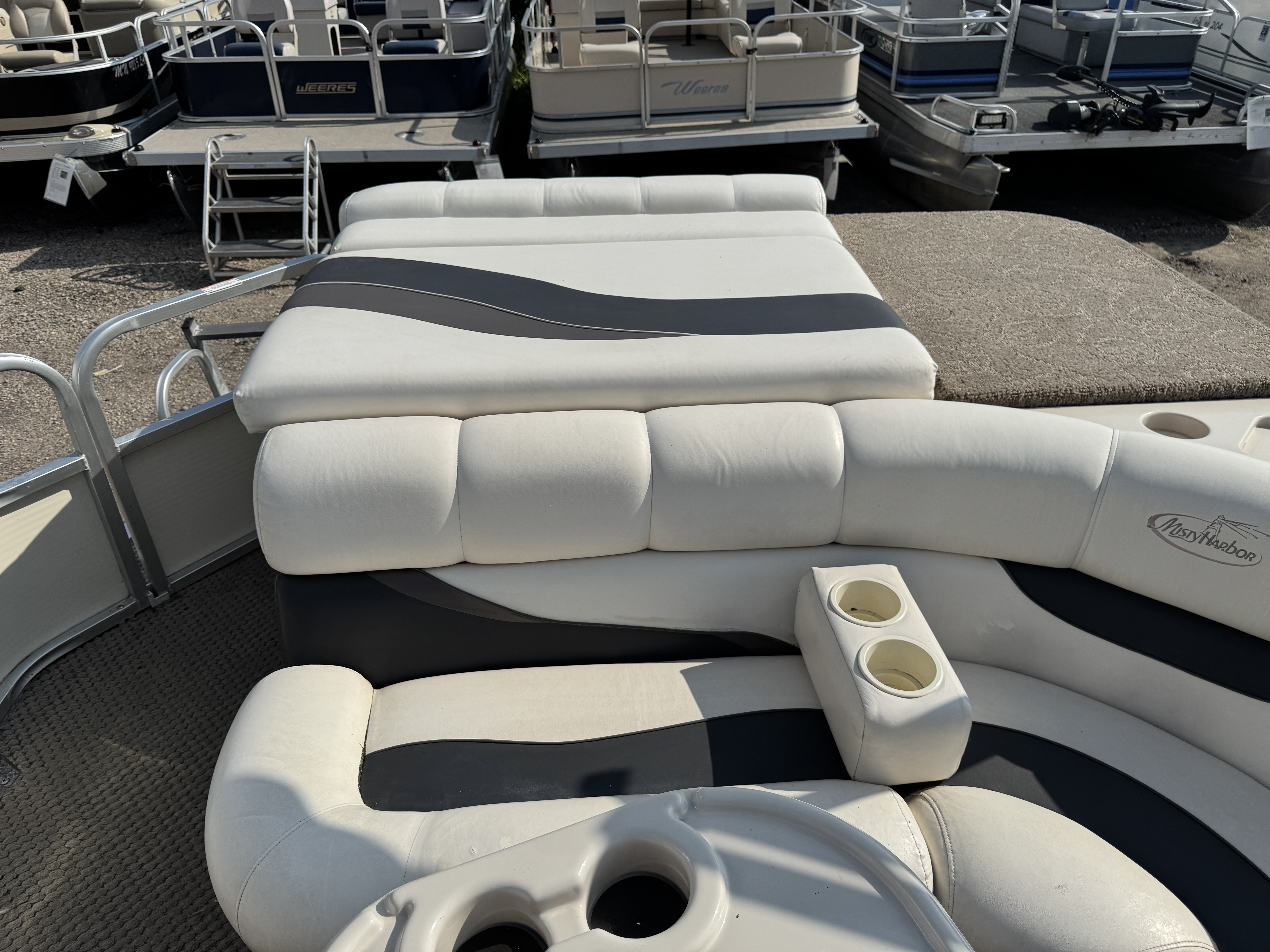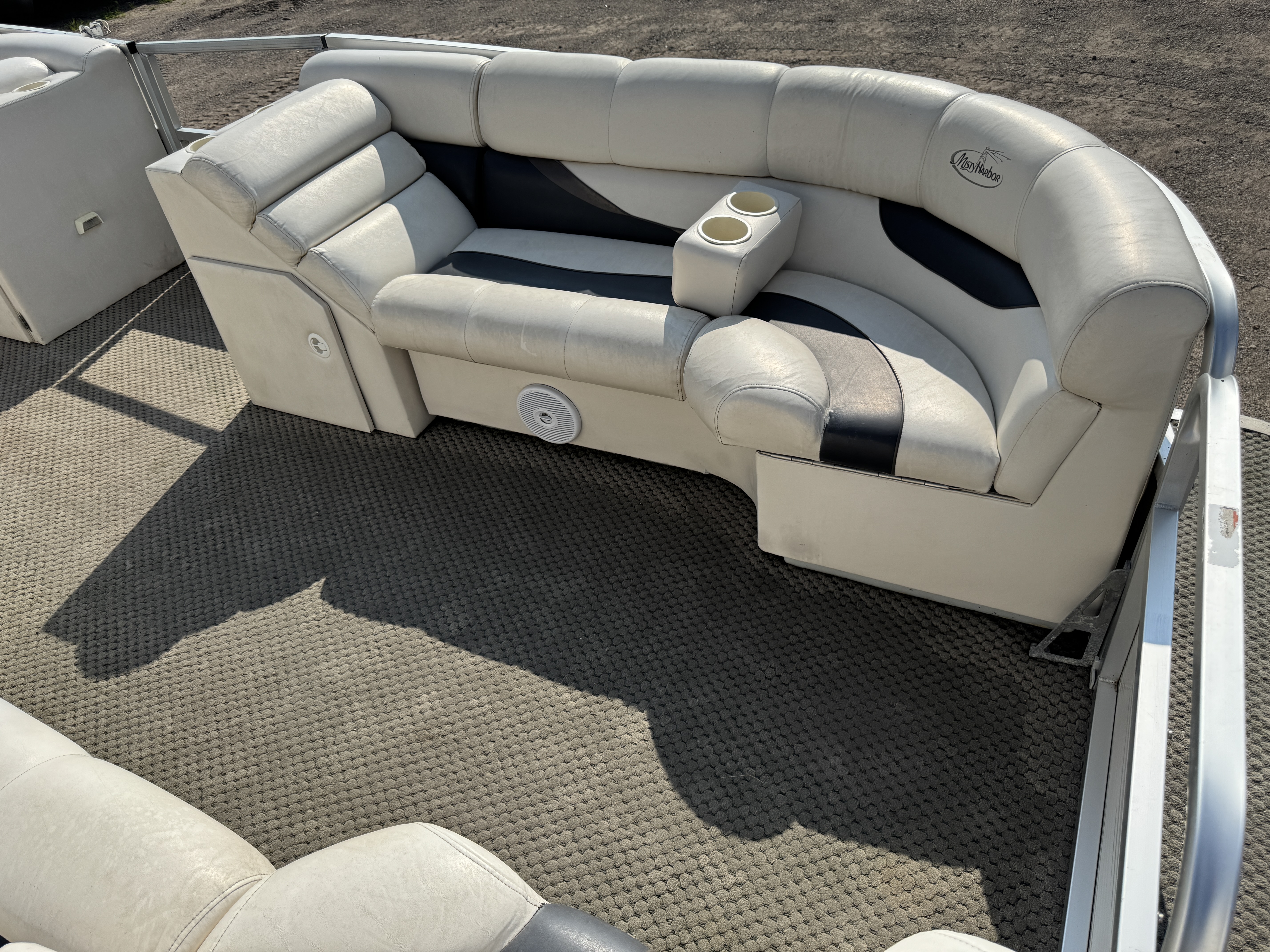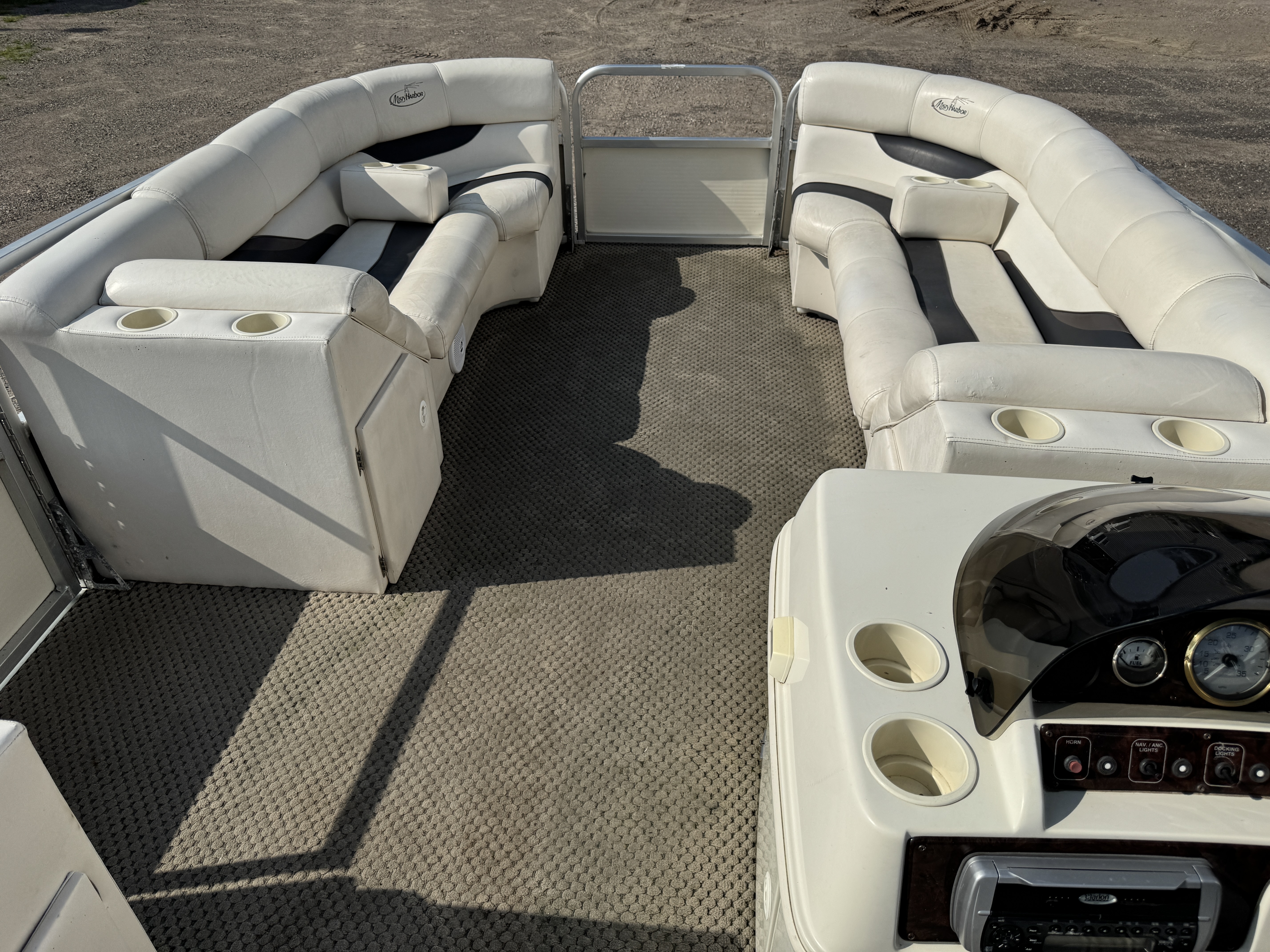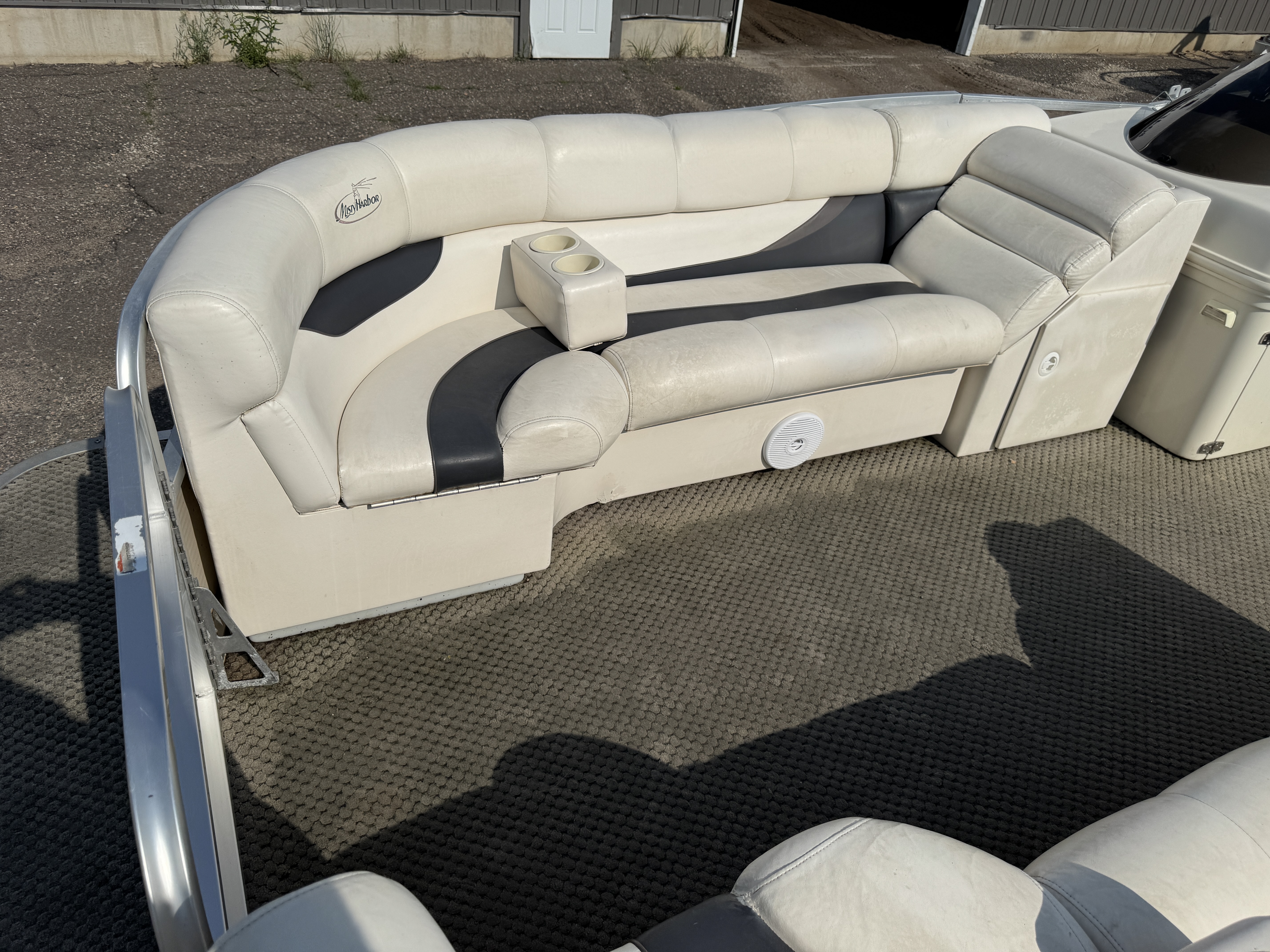 2005 Misty Harbor 2285 GM Pontoon with 60HP Mercury Bigfoot Fourstroke EFI Outboard. This cruise layout pontoon features 2 lounge style couches in front with an L-shaped couch amidships and followed up by a large sun deck. The captain's chair is a low back sport seat with swivel and slide functions as well as fold up arm rests. The helm features a Speedometer, Tachometer, Fuel, Volt and Trim gauge. There is a Clarion CD player stereo system. There are courtesy lights on the side and front of the helm as well as on the front end of the "L" couch. A portion of the sun deck flips up with a privacy/changing station. The rear entry gate opens up to a swim platform and fold down swim ladder. This unit also features a bimini top.