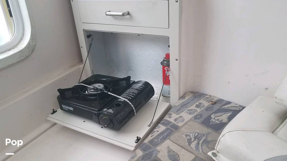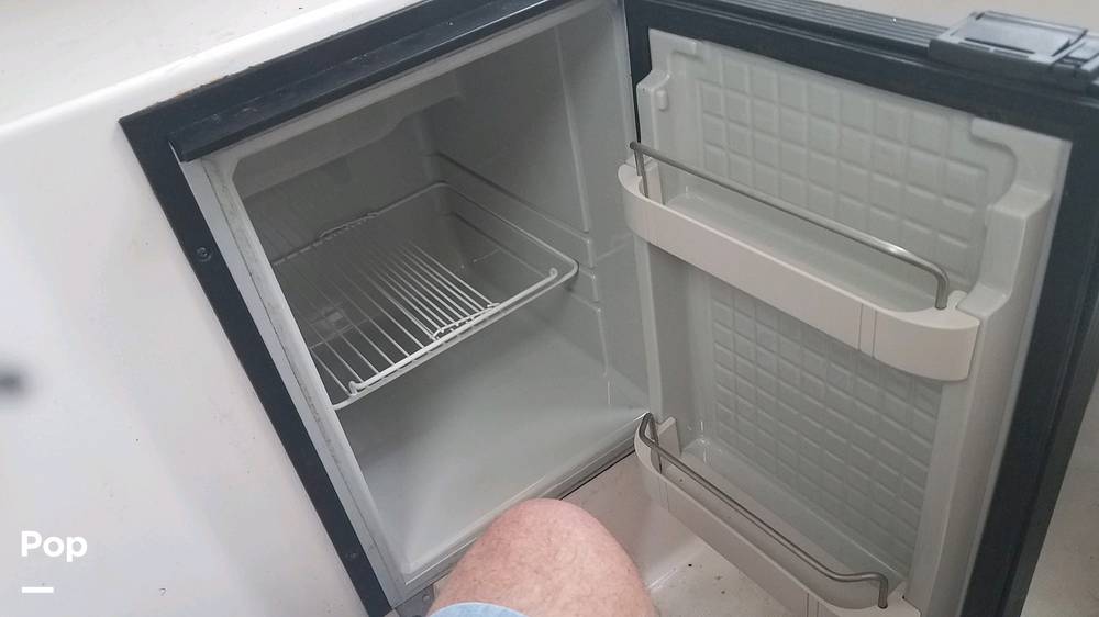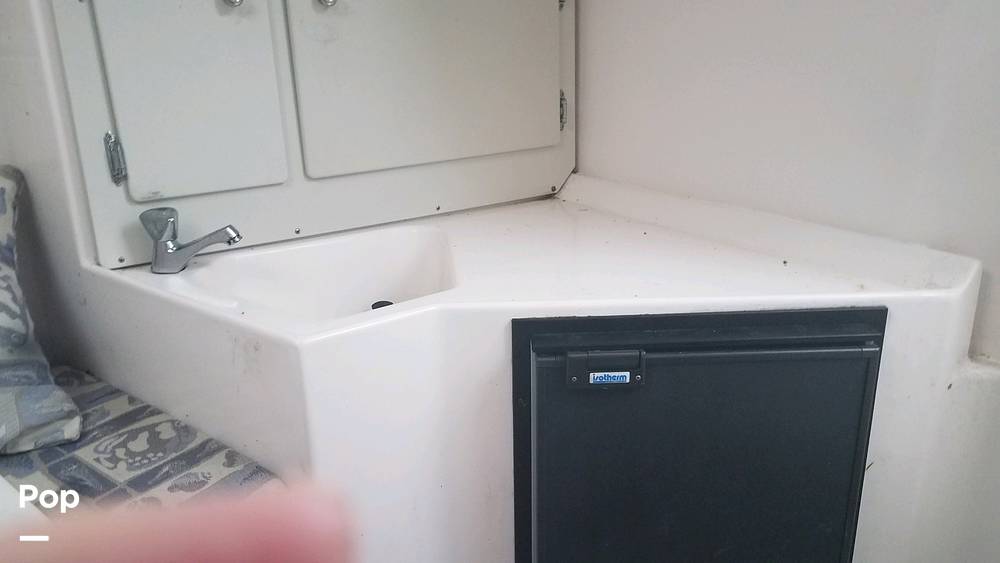The cabin has ample storage, a cushioned V-berth and convertible table, galley with a fridge, microwave, stove, and sink, and a head.