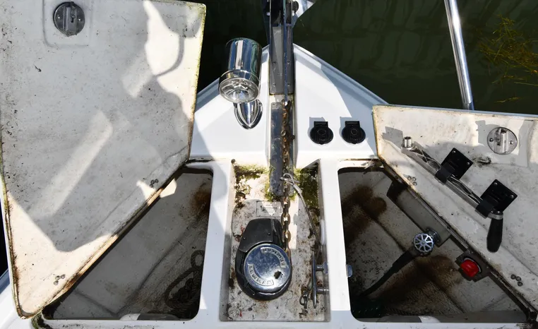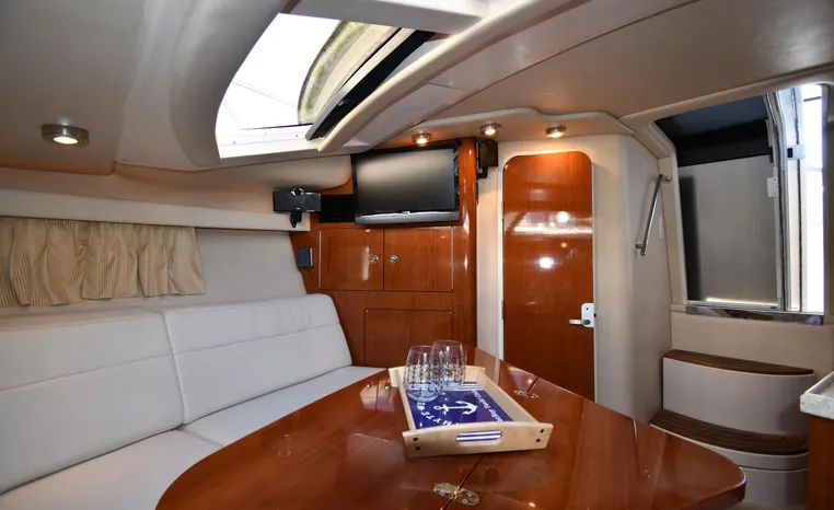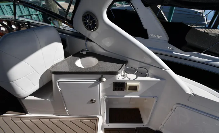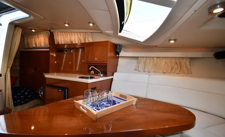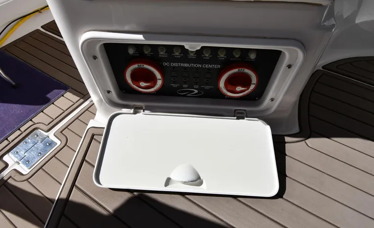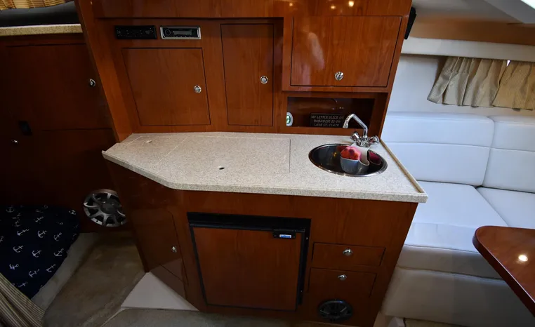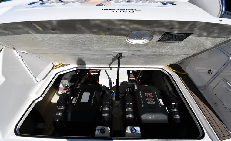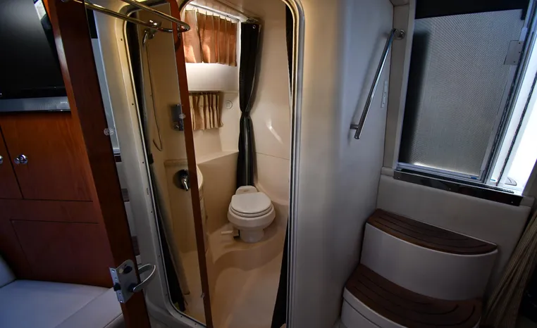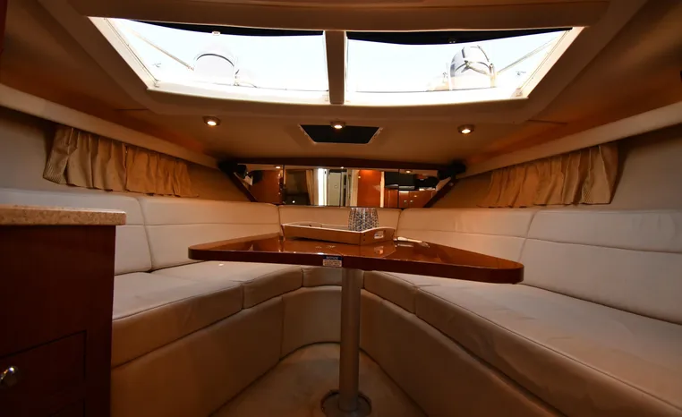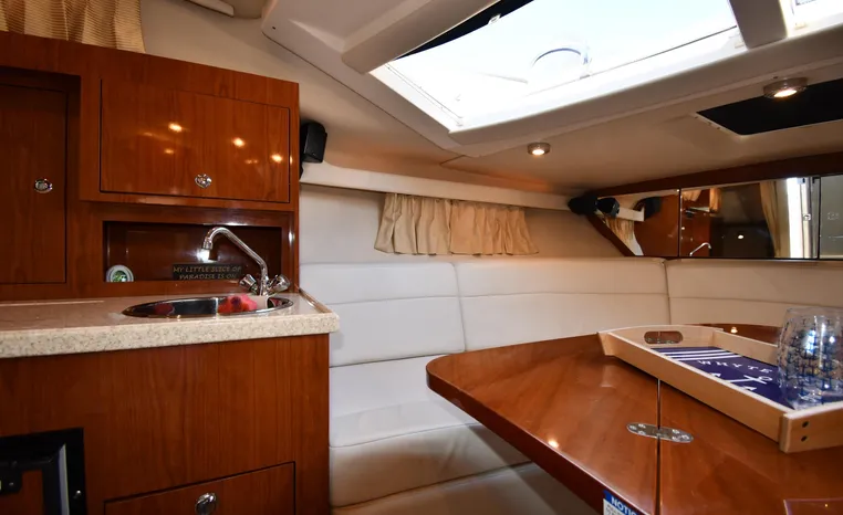 The 3060 has Regal's innovative Cockpit Forward Seating arrangement. The main seating group is located adjacent to the helm, not in the rear. Everyone rides up front with the captain and shares the helm station view. The helm seat swivels to face the group for better socializing and, with a simple adjustment, the cockpit table slides into ideal position between group and helm. Cockpit table is removable.