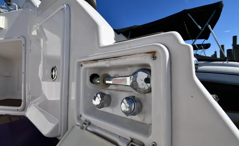 Freshwater / Great Lakes boat since new this vessel features Twin Volvo-Penta 5.7-litre 320-hp Gas Engine's with Volvo-Penta Duo-Prop Sterndrives and 580 original hours. Notable features include but are not limited to the following: Air-Conditioning & Heat, Head (Vacuflush) w/Vanity/Sink/Shower, Windlass-Anchor w/Forward Pedal-Controls, Kohler 5kw Generator (450-hrs), Garmin Color / TouchScreen Radar w/GPS/Chartplotter, Premium Sound System w/AMP/Subwoofer, Cockpit Wet Bar w/Sink/Beverage Refrigerator, Sea-Dek Throughout Cockpit / Swim-Platform, Full Canvas Enclosure, and MUCH more!