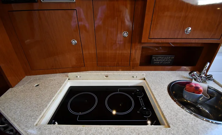 Freshwater / Great Lakes boat since new this vessel features Twin Volvo-Penta 5.7-litre 320-hp Gas Engine's with Volvo-Penta Duo-Prop Sterndrives and 580 original hours. Notable features include but are not limited to the following: Air-Conditioning & Heat, Head (Vacuflush) w/Vanity/Sink/Shower, Windlass-Anchor w/Forward Pedal-Controls, Kohler 5kw Generator (450-hrs), Garmin Color / TouchScreen Radar w/GPS/Chartplotter, Premium Sound System w/AMP/Subwoofer, Cockpit Wet Bar w/Sink/Beverage Refrigerator, Sea-Dek Throughout Cockpit / Swim-Platform, Full Canvas Enclosure, and MUCH more!