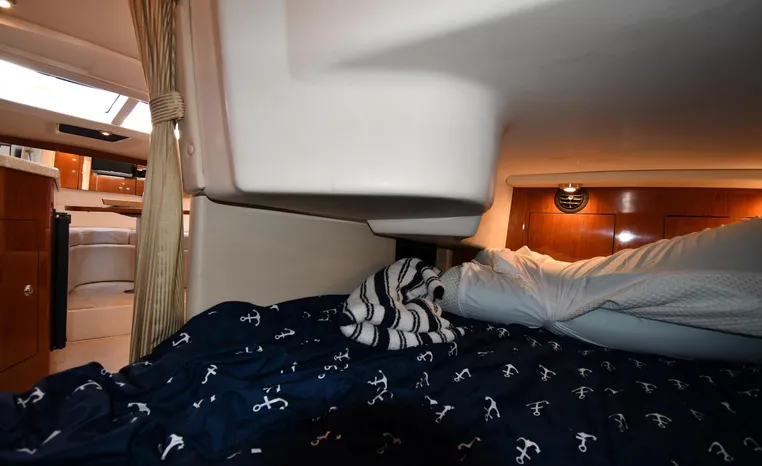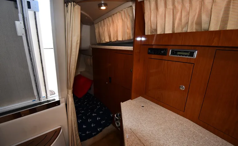 The dramatic, flowing silhouette of the Regal 3060 Window Express is clearly of the Regal Yacht bloodline. Unmistakable are the rake of the bow and the graceful aft sweep of the arch. Large, port and starboard, cat-eye windows and sharply angled windows forward pour an abundance of natural light into the salon. The interior, so bright and airy, is also spacious. The mid-cabin (usually reserved for children or storage), is large enough to be the master stateroom.