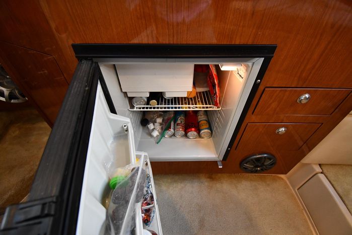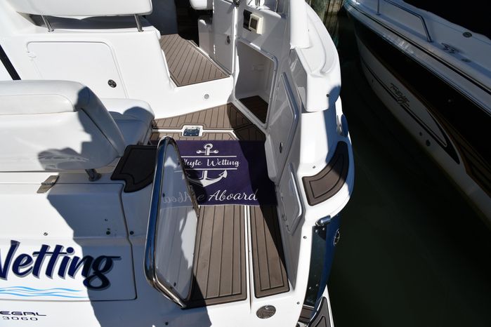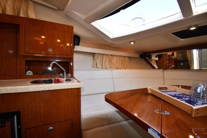 The 3060 has Regal's innovative Cockpit Forward Seating arrangement. The main seating group is located adjacent to the helm, not in the rear. Everyone rides up front with the captain and shares the helm station view. The helm seat swivels to face the group for better socializing and, with a simple adjustment, the cockpit table slides into ideal position between group and helm. Cockpit table is removable.
