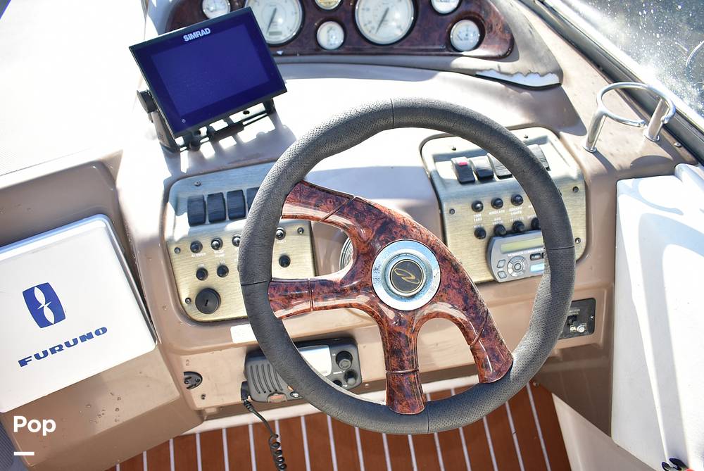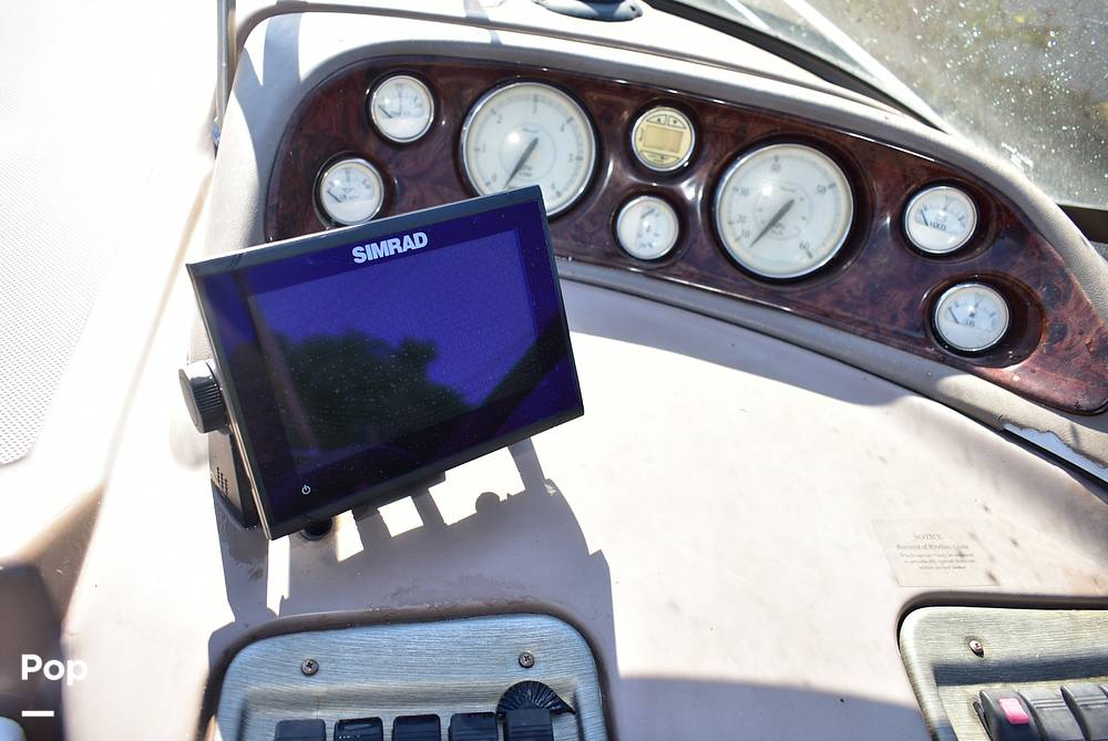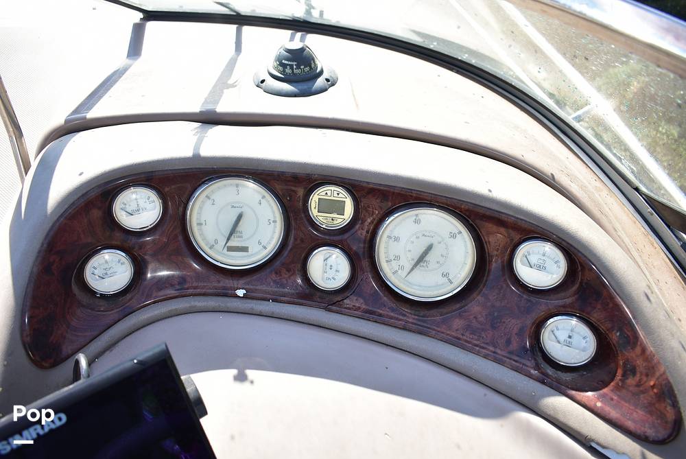 The walk-through transom door leads to a U-shaped aft seating area and a double-wide helm seat, complete with a woodgrain steering wheel, compass, and depth sounder. The Burlwood-style dash panel adds a touch of elegance. Stay on course with GPS navigation, fishfinder, Furuno radar, and enjoy the integrated sound system for those memorable moments on the water.
