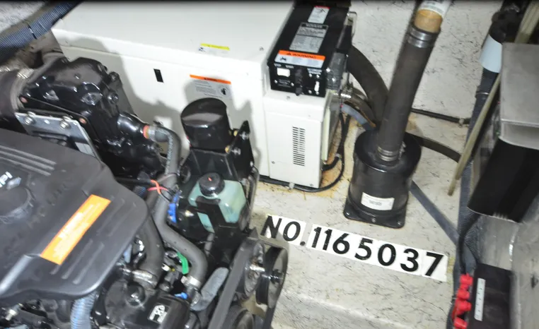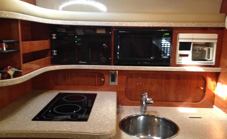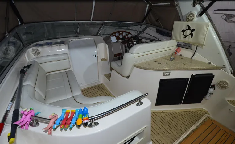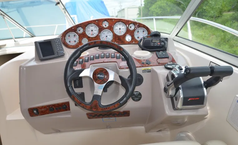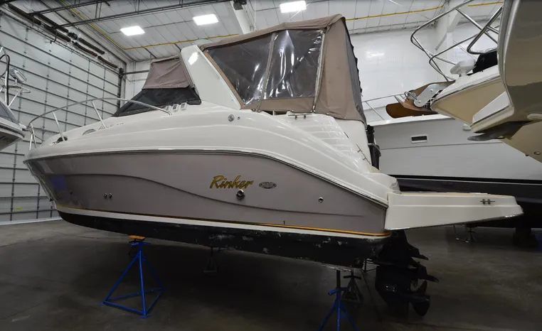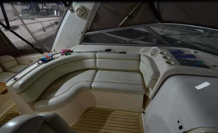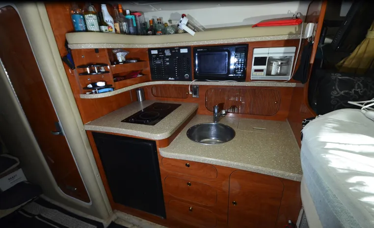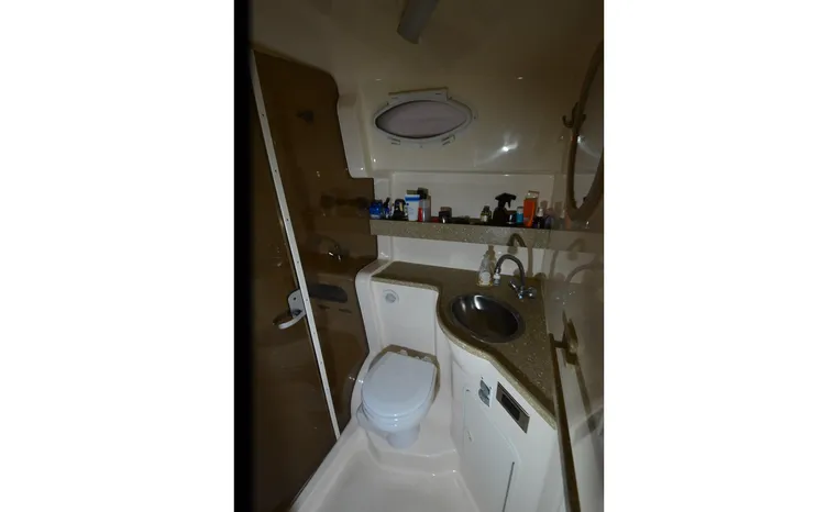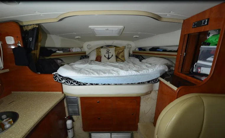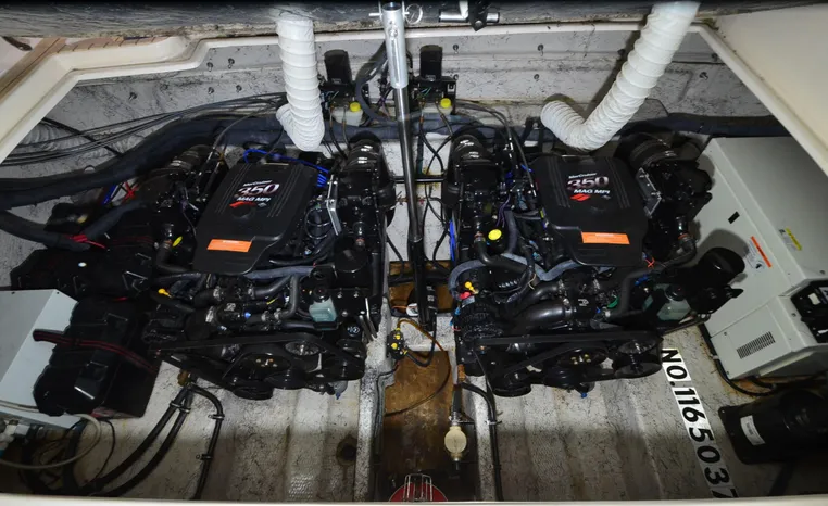 2005 Rinker Fiesta Vee 342, twin 300 hp Mercruiser Magnum, GM 350 CID, 5.7 litre, 833 hours, Bravo I/O drive, Kohler 5.0 kw generator, 557 hours, deep vee, dual 30 amp service, shore power cords, four batteries, battery switch, Intella Power battery charger, Cruise Air reverse cycle heat/air conditioning, electric head, vanity, stall shower, water heater with engine heat exchanger, pressure water system, sleeps six, master stateroom forward with offset double berth, guest stateroom mid-cabin with double berth, Dynex flat panel TV, convertible sofa sleeps two, teak/holly wood sole, single sink, Tundra 12vdc/120vac refrigerator/freezer, Kenyon two burner electric stove, Emerson microwave oven, Mr. Coffee maker, Grey canvas, bimini top with enclosure and screens new 2015, mooring cover, Standard VHF marine radio, one VHF antenna, single electric horn, Faria depth finder, Danforth compass, Sony am/fm stereo radio with six disc changer, ITT Jabsco remote controlled spotlight, Simpson/Lawrence windlass, Lenco trim tabs, Plow style anchor, cockpit carpeting, transom show H/C washdown, four lines, four fenders, cockpit and bow sun cushion, Tundra refrigerator and Uline ice maker cockpit, remote stereo key pad cockpit and at helm, hatch screens, Waring Pro blender, 24" Samsung flat panel TV cockpit, subwoofer, hydraulic engine hatch, electronics arch, transom door, walk thru windshield, hatch screens, black bottom paint, integral swim platform with boarding ladder.