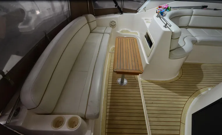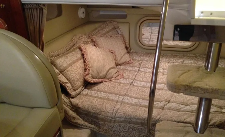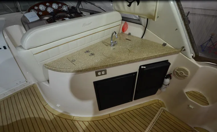 2005 Rinker Fiesta Vee 342, twin 300 hp Mercruiser Magnum, GM 350 CID, 5.7 litre, 833 hours, Bravo I/O drive, Kohler 5.0 kw generator, 557 hours, deep vee, dual 30 amp service, shore power cords, four batteries, battery switch, Intella Power battery charger, Cruise Air reverse cycle heat/air conditioning, electric head, vanity, stall shower, water heater with engine heat exchanger, pressure water system, sleeps six, master stateroom forward with offset double berth, guest stateroom mid-cabin with double berth, Dynex flat panel TV, convertible sofa sleeps two, teak/holly wood sole, single sink, Tundra 12vdc/120vac refrigerator/freezer, Kenyon two burner electric stove, Emerson microwave oven, Mr. Coffee maker, Grey canvas, bimini top with enclosure and screens new 2015, mooring cover, Standard VHF marine radio, one VHF antenna, single electric horn, Faria depth finder, Danforth compass, Sony am/fm stereo radio with six disc changer, ITT Jabsco remote controlled spotlight, Simpson/Lawrence windlass, Lenco trim tabs, Plow style anchor, cockpit carpeting, transom show H/C washdown, four lines, four fenders, cockpit and bow sun cushion, Tundra refrigerator and Uline ice maker cockpit, remote stereo key pad cockpit and at helm, hatch screens, Waring Pro blender, 24" Samsung flat panel TV cockpit, subwoofer, hydraulic engine hatch, electronics arch, transom door, walk thru windshield, hatch screens, black bottom paint, integral swim platform with boarding ladder.