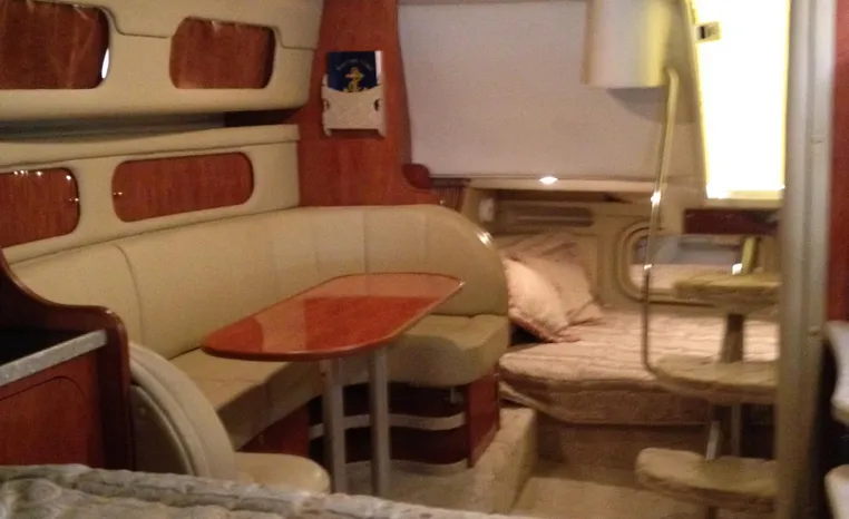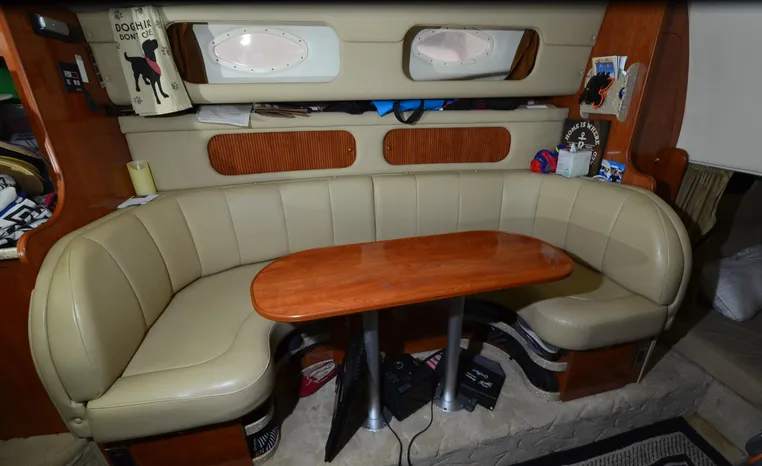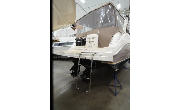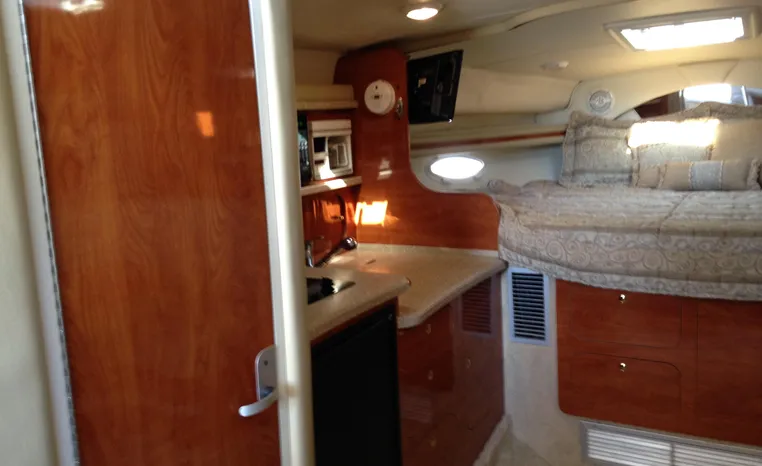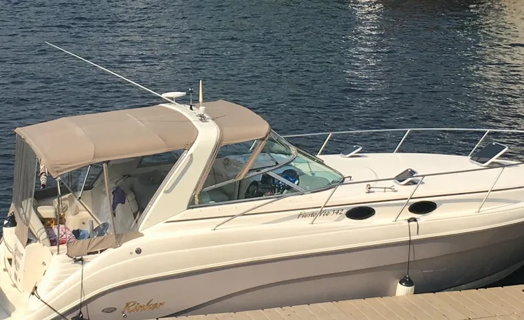 2005 Rinker Fiesta Vee 342, twin 300 hp Mercruiser Magnum, GM 350 CID, 5.7 litre, 833 hours, Bravo I/O drive, Kohler 5.0 kw generator, 557 hours, deep vee, dual 30 amp service, shore power cords, four batteries, battery switch, Intella Power battery charger, Cruise Air reverse cycle heat/air conditioning, electric head, vanity, stall shower, water heater with engine heat exchanger, pressure water system, sleeps six, master stateroom forward with offset double berth, guest stateroom mid-cabin with double berth, Dynex flat panel TV, convertible sofa sleeps two, teak/holly wood sole, single sink, Tundra 12vdc/120vac refrigerator/freezer, Kenyon two burner electric stove, Emerson microwave oven, Mr. Coffee maker, Grey canvas, bimini top with enclosure and screens new 2015, mooring cover, Standard VHF marine radio, one VHF antenna, single electric horn, Faria depth finder, Danforth compass, Sony am/fm stereo radio with six disc changer, ITT Jabsco remote controlled spotlight, Simpson/Lawrence windlass, Lenco trim tabs, Plow style anchor, cockpit carpeting, transom show H/C washdown, four lines, four fenders, cockpit and bow sun cushion, Tundra refrigerator and Uline ice maker cockpit, remote stereo key pad cockpit and at helm, hatch screens, Waring Pro blender, 24" Samsung flat panel TV cockpit, subwoofer, hydraulic engine hatch, electronics arch, transom door, walk thru windshield, hatch screens, black bottom paint, integral swim platform with boarding ladder.